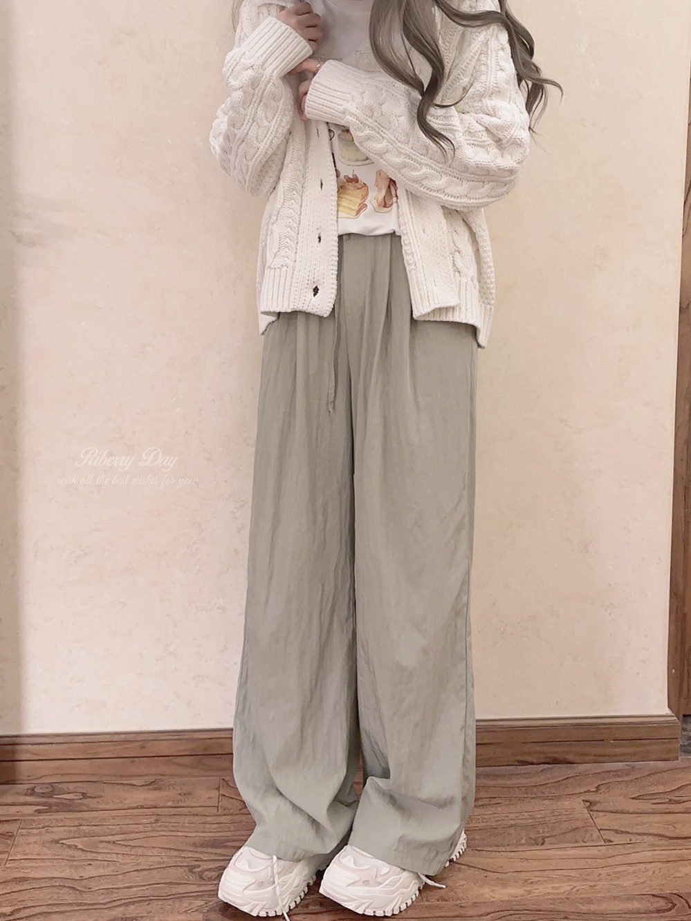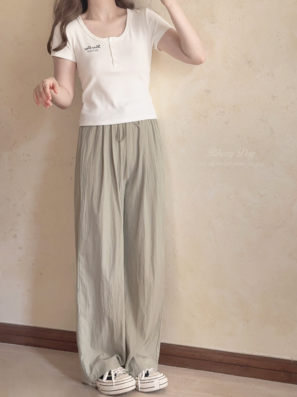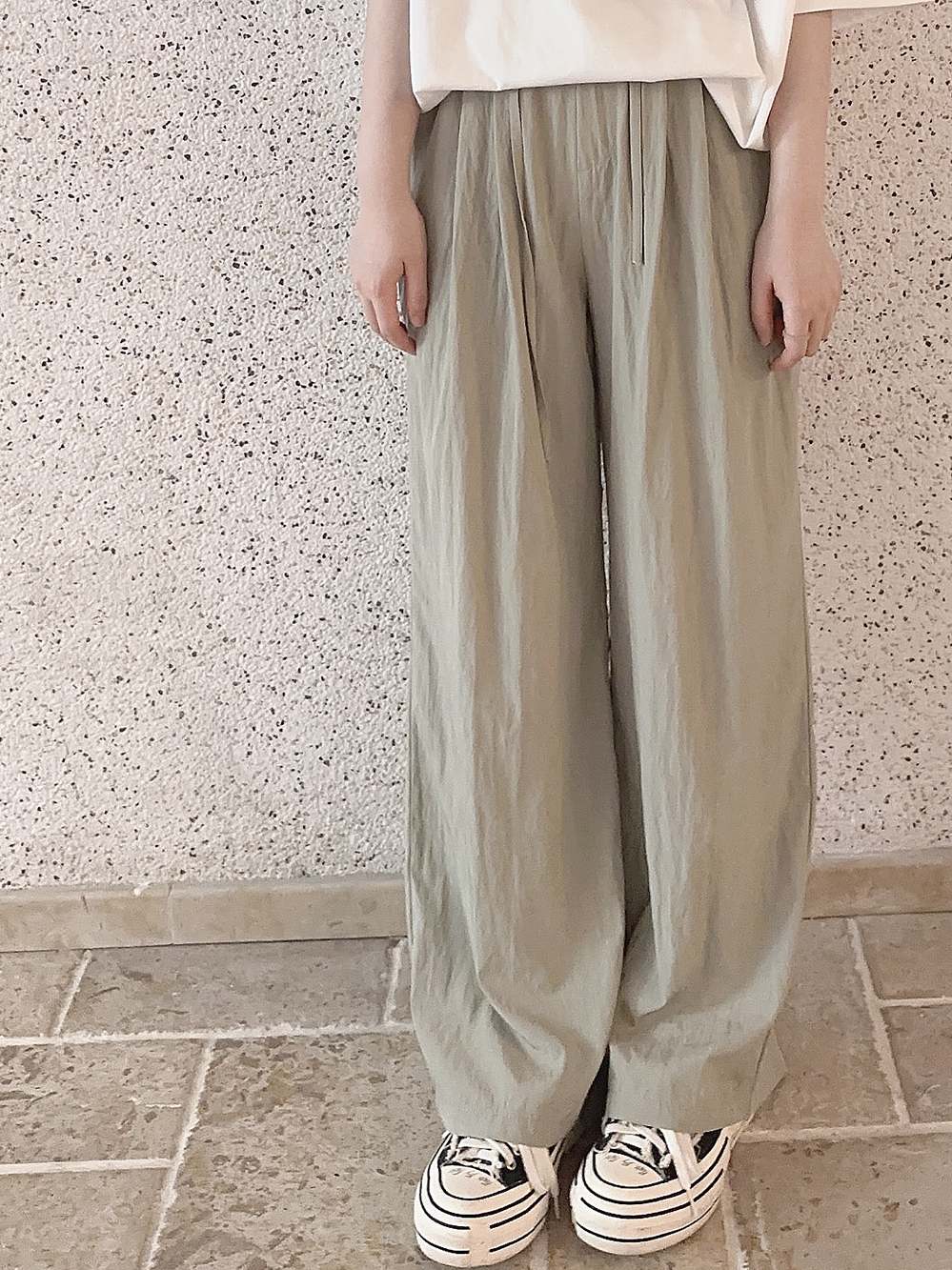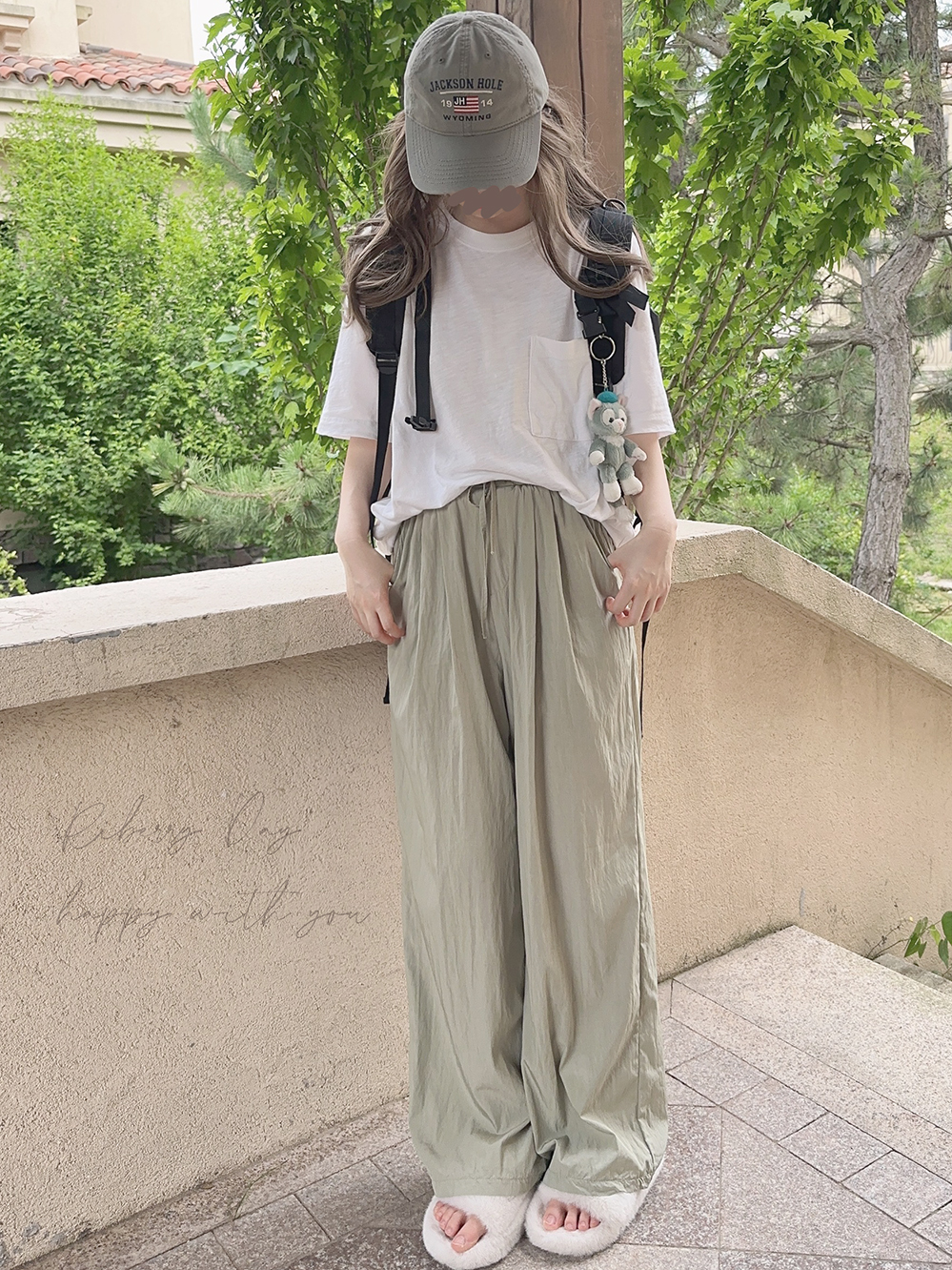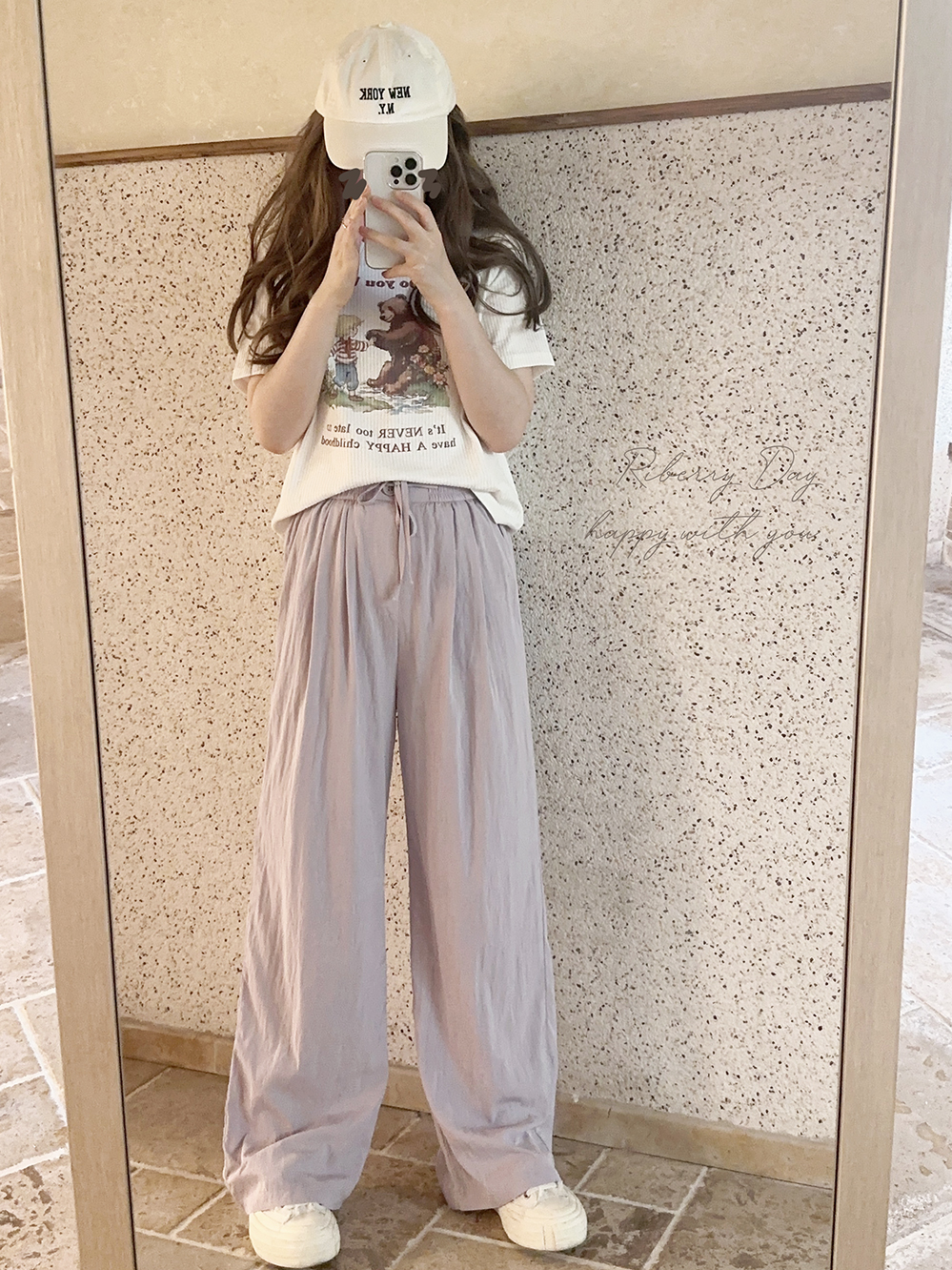 柔軟 輕薄涼快 抽繩鬆緊腰 寬鬆直筒 休閒長褲 夏季女 H