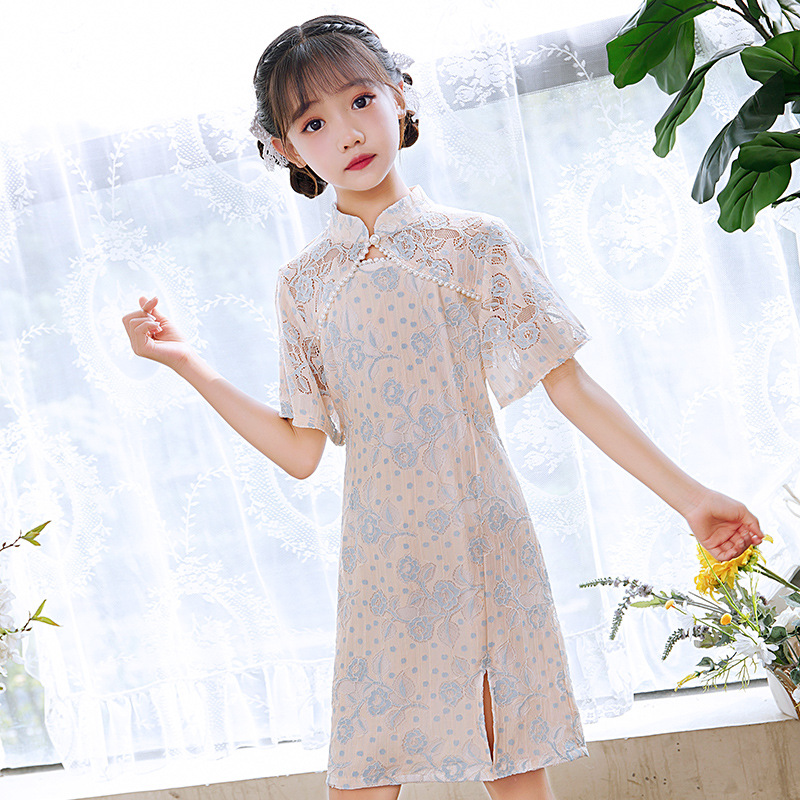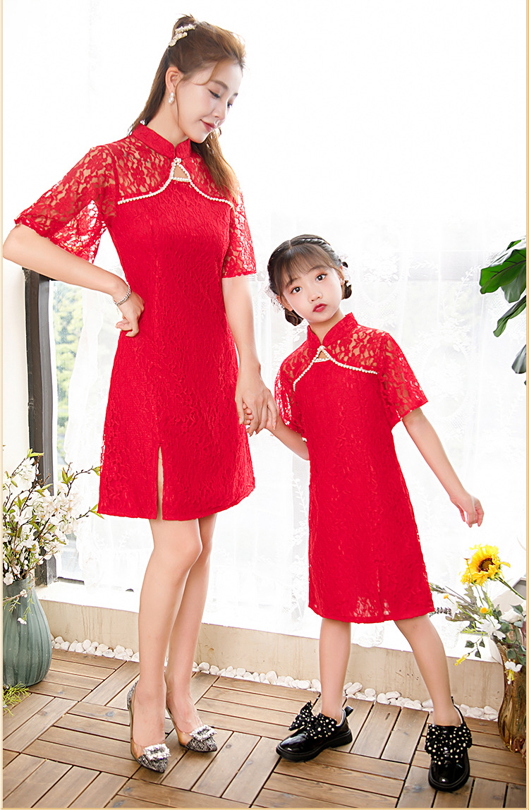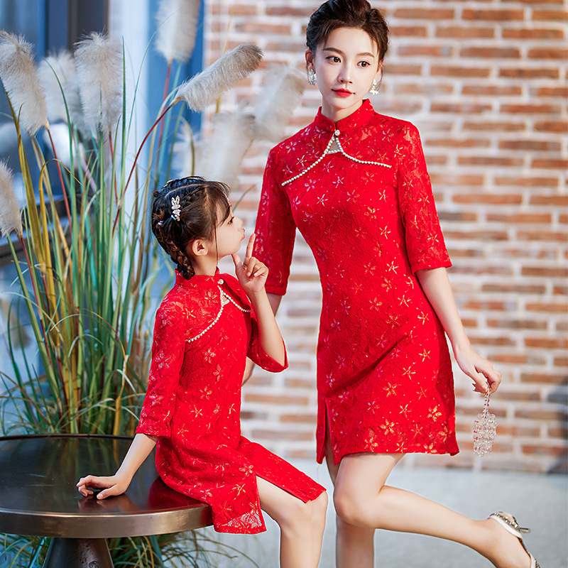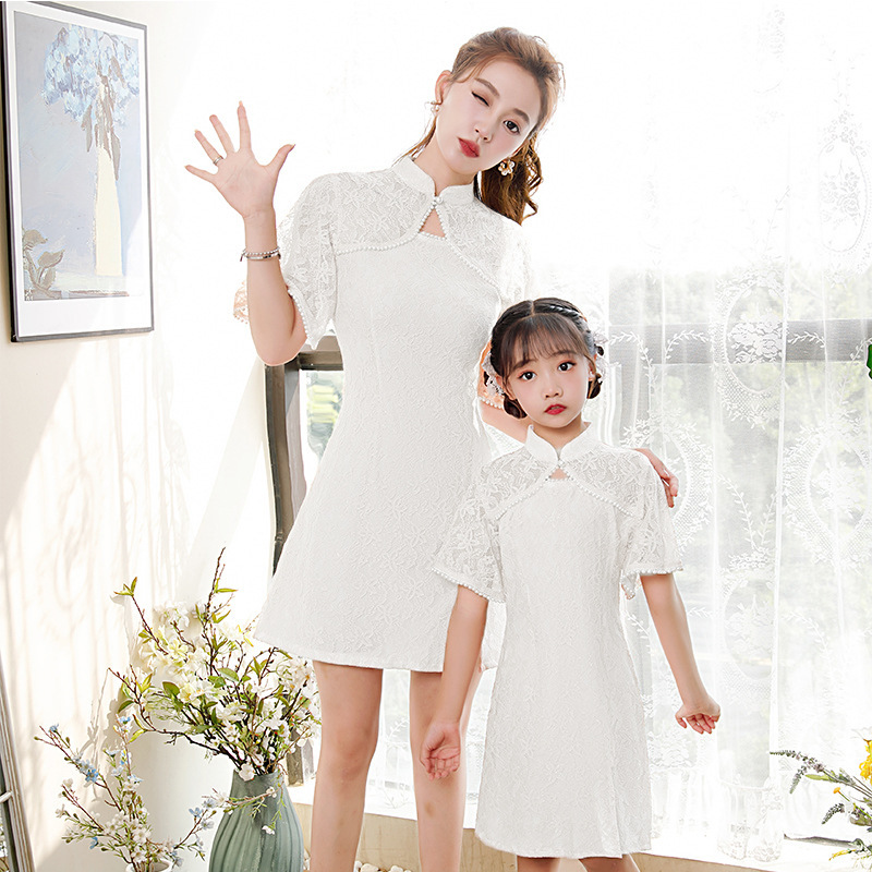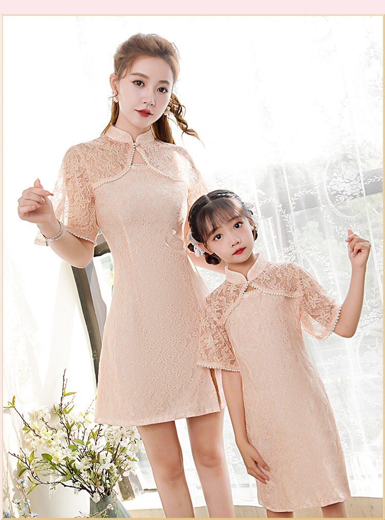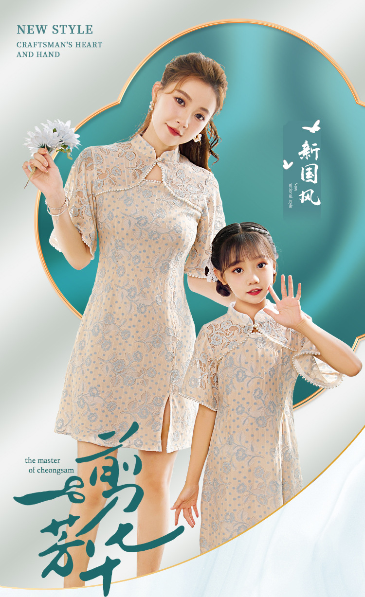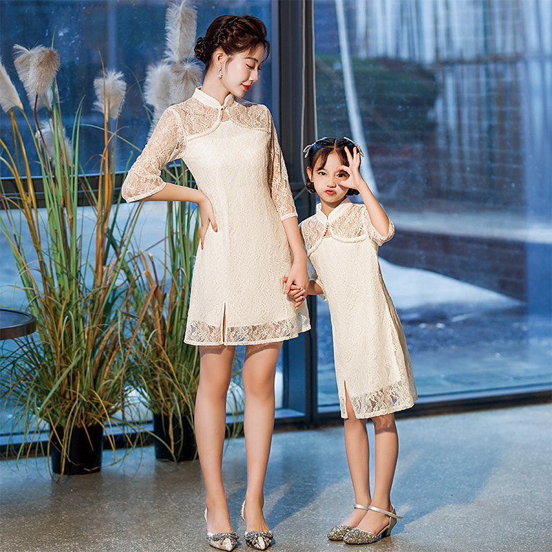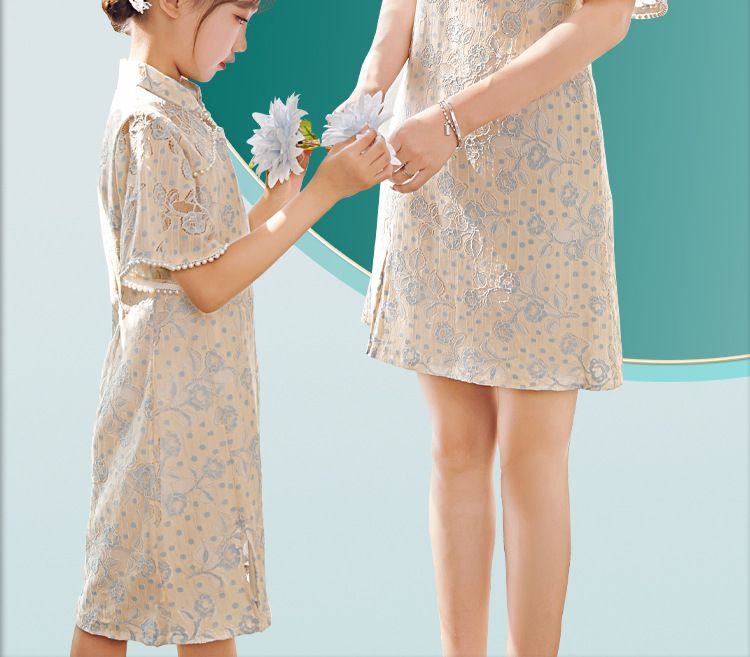 亲子装夏装母女装旗袍连衣裙2023新款高端蕾丝旗袍大袖女童连衣裙