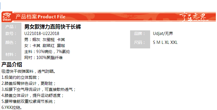 凱樂石旗下品牌 無界/Udjat 彈力直筒快乾長褲速乾褲