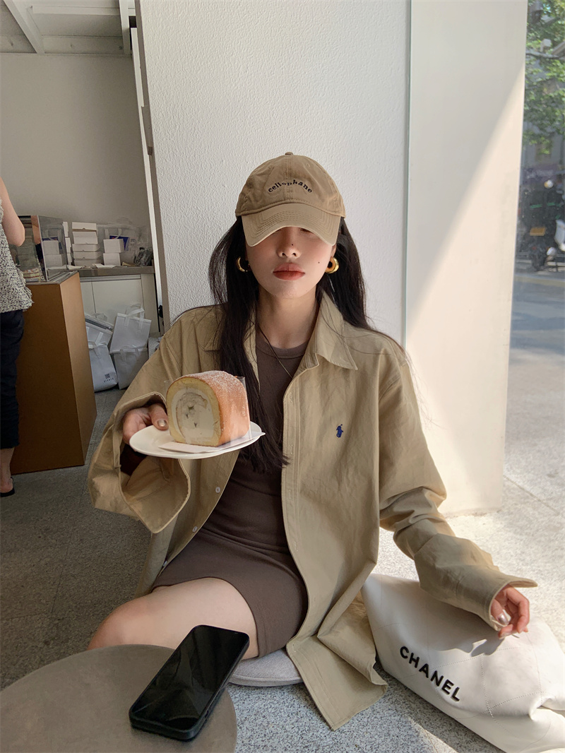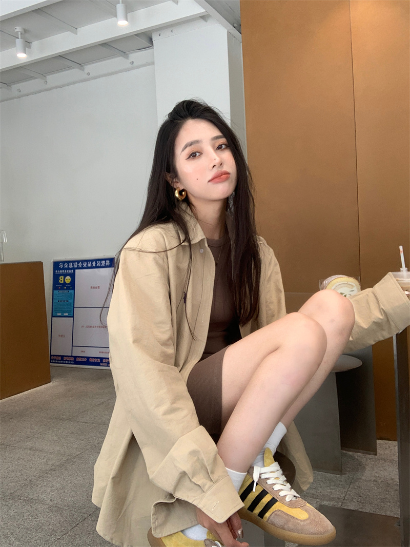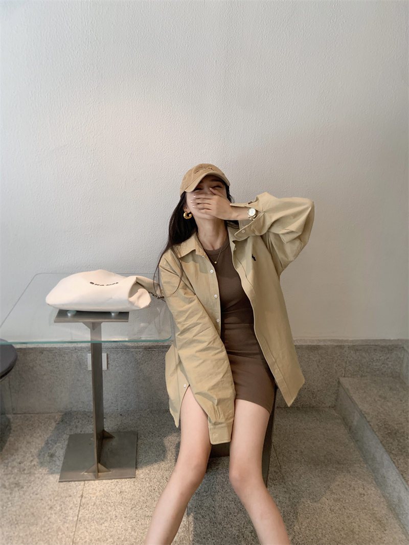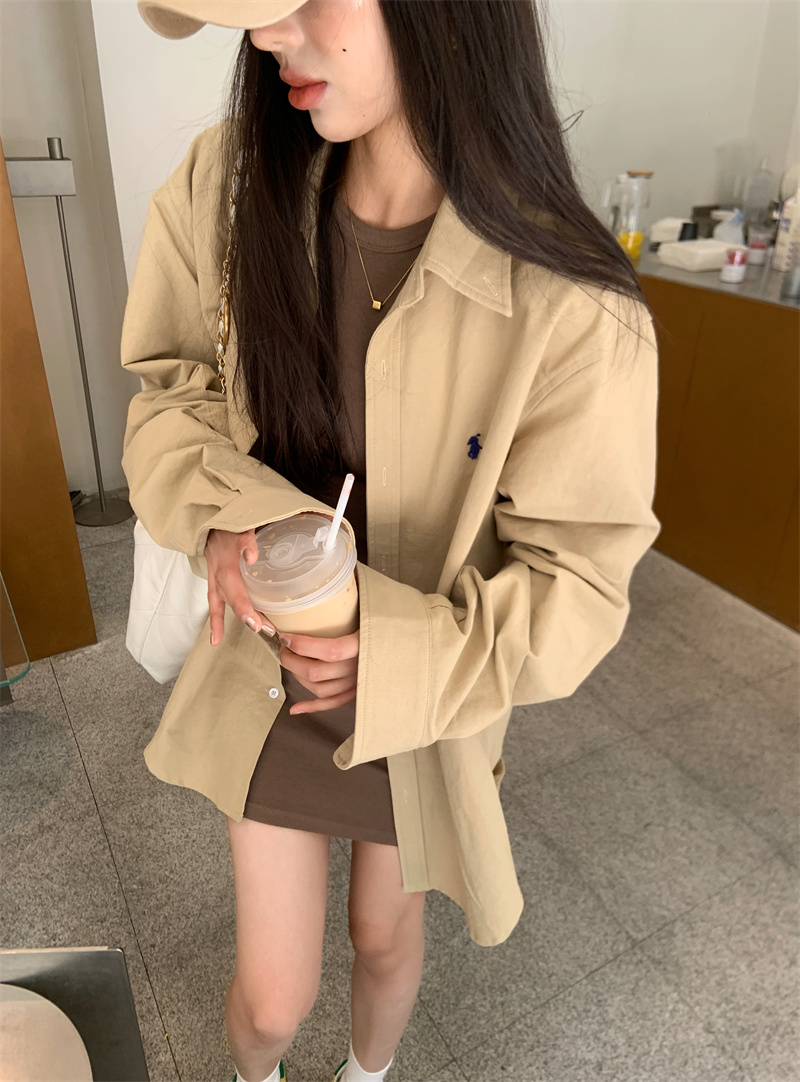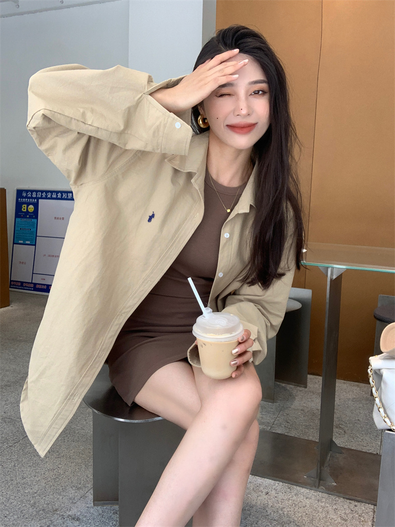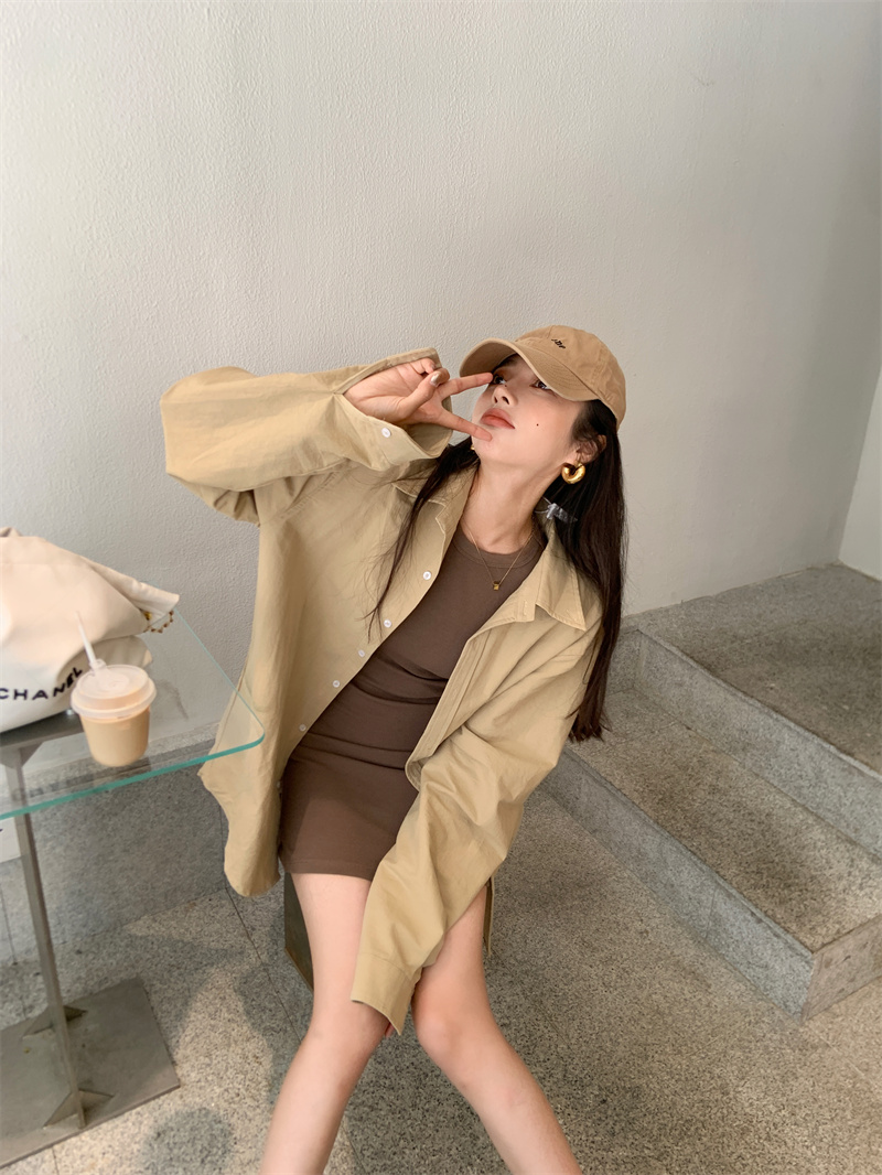 百搭卡其色長袖襯衫女秋季新款外搭寬鬆純色襯衫中長版外套上衣