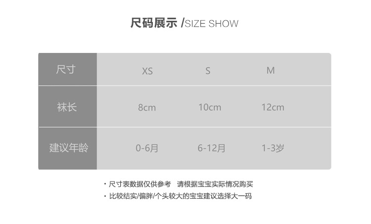 童袜尺码 XS 0-6个月,S 6-12个月,M 1-3岁