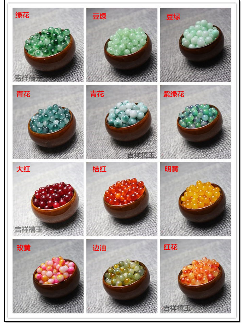 颜色 大红,橘红,油青,全黄,绿花,豆绿,青花,海蓝,粉晶,马来玉,红花,青金,边玫,红紫晶,紫绿花,紫花,紫红,玫黄,寿花,黄加绿,青梅,边油,边黄,奶白,混色,天河石色,青莓