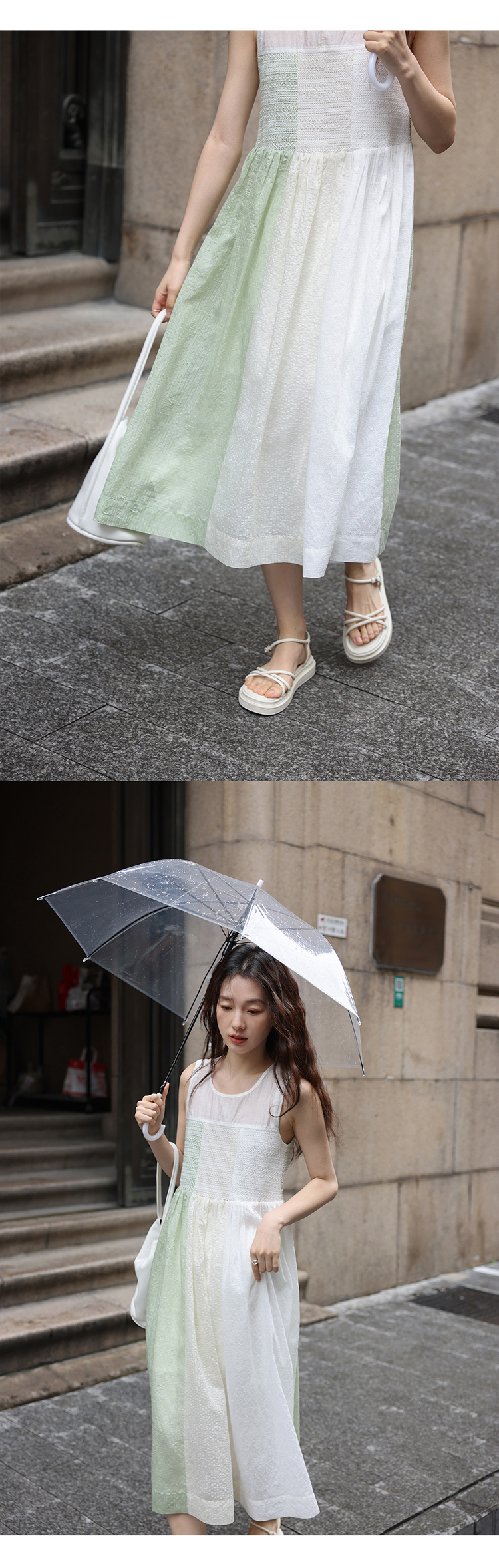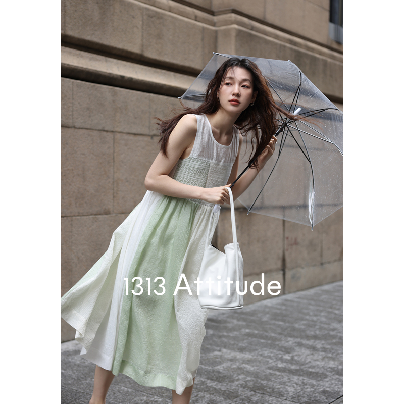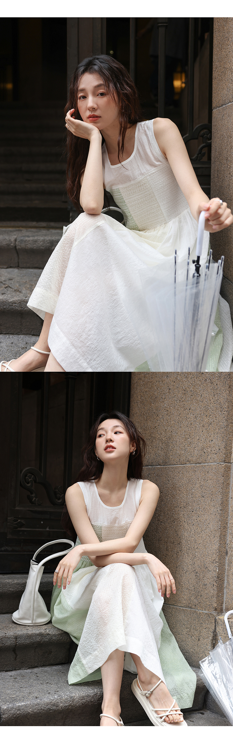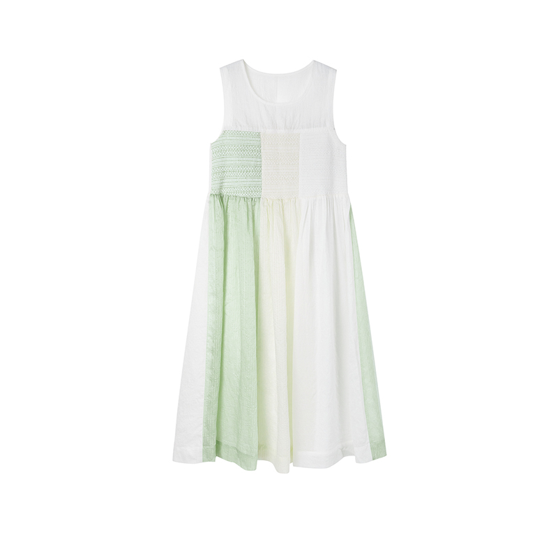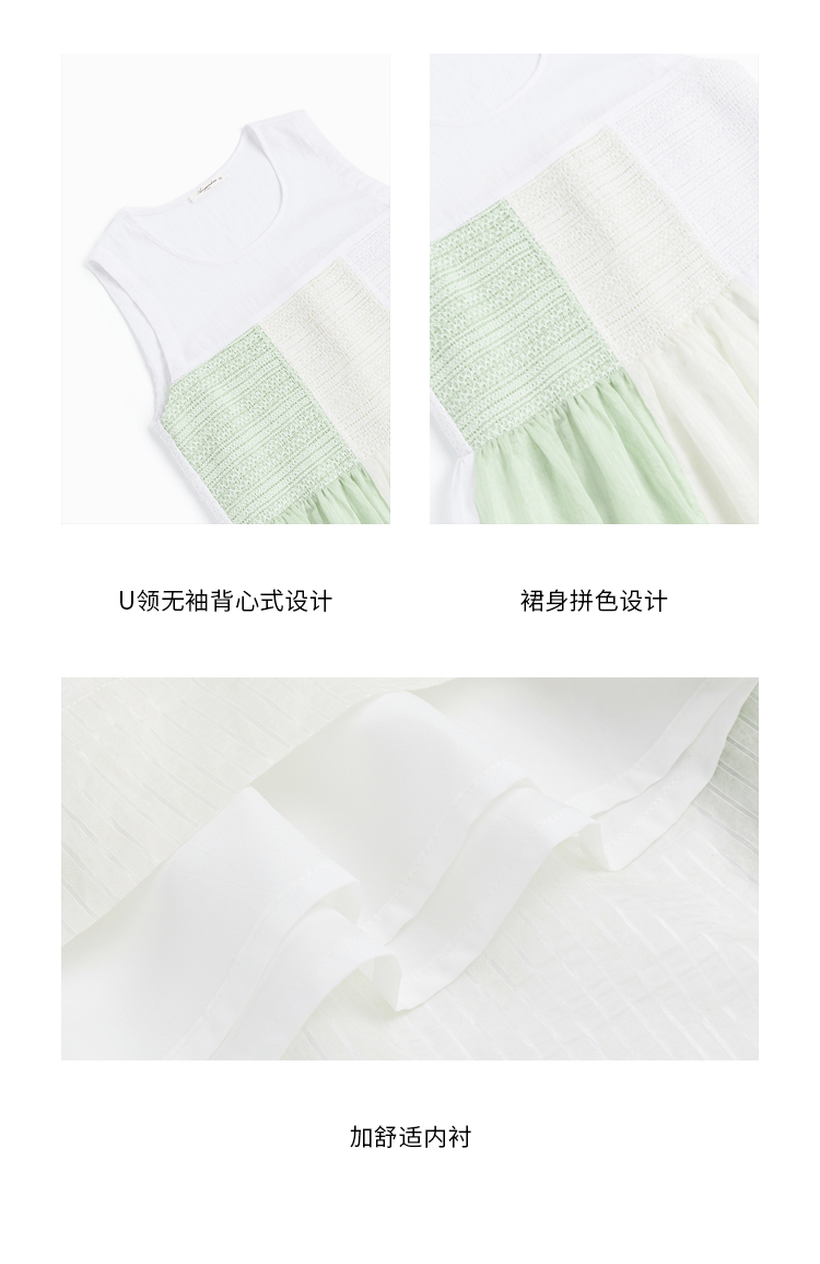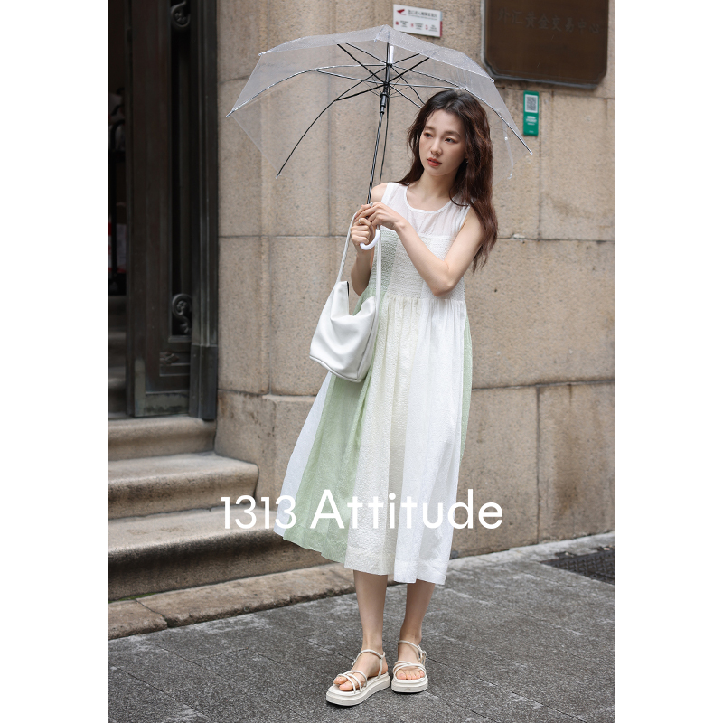 1313重工編織冰青檸拼色90%天絲背心長裙2023夏女白色肌理洋裝