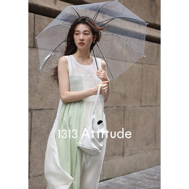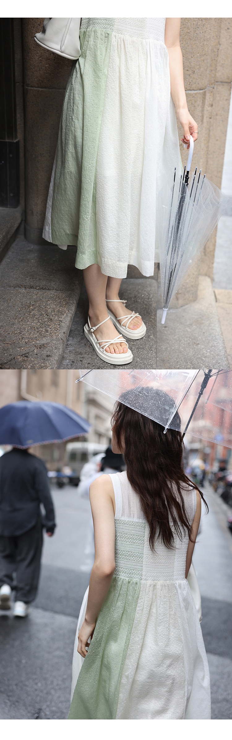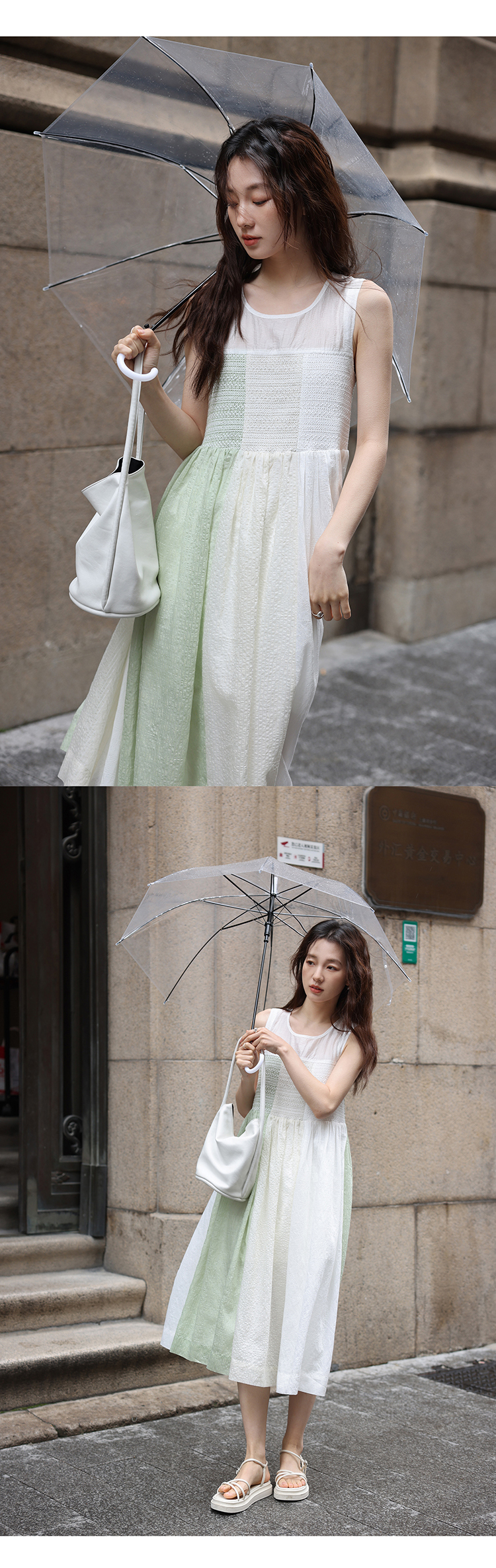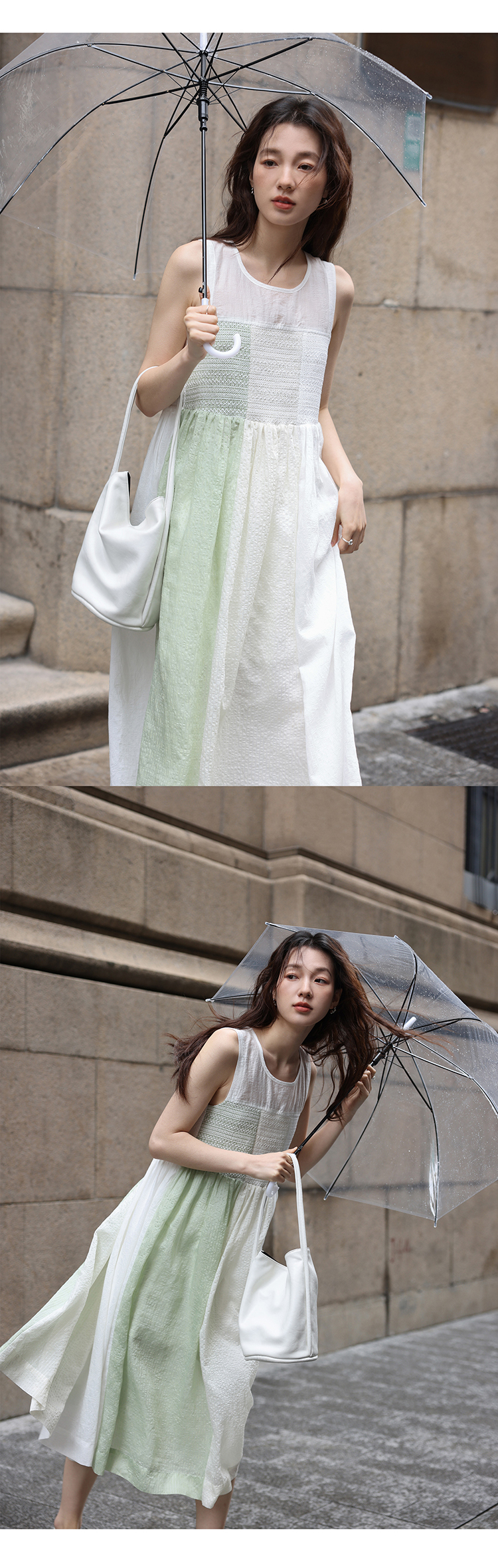 1313重工編織冰青檸拼色90%天絲背心長裙2023夏女白色肌理洋裝