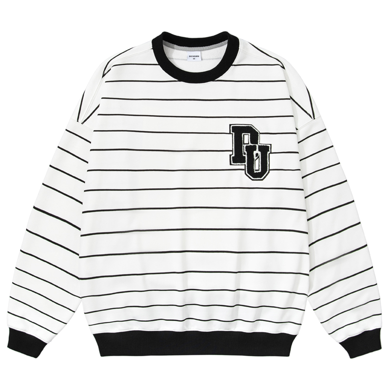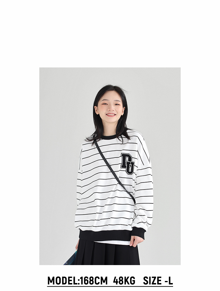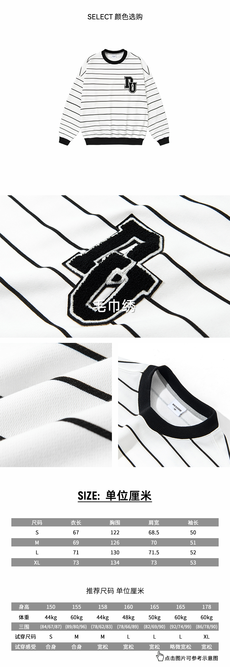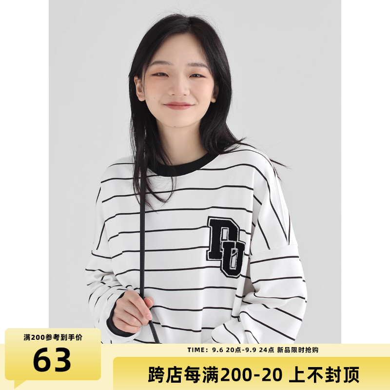 DESSUU 毛巾刺繡學院風條紋圓領厚棉T女2023秋季新款寬鬆套頭上衣