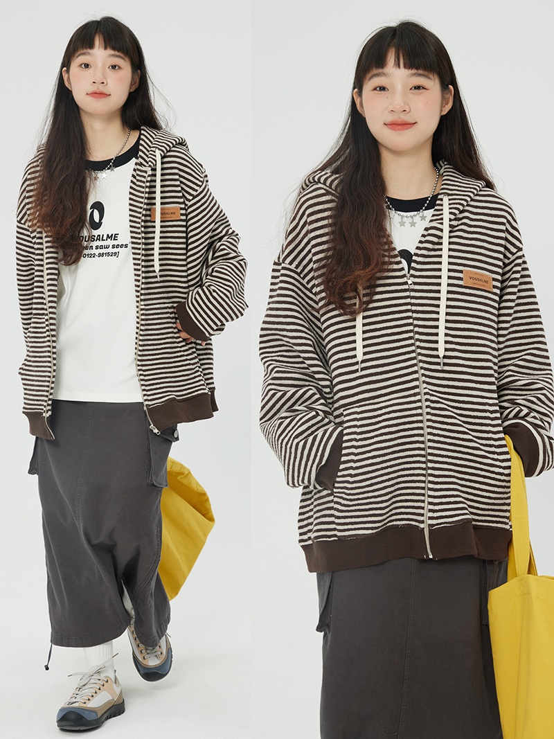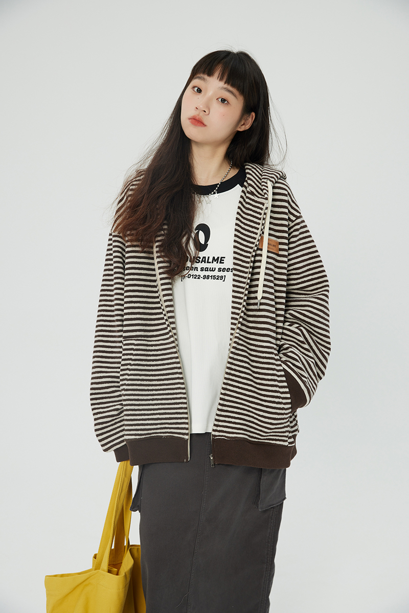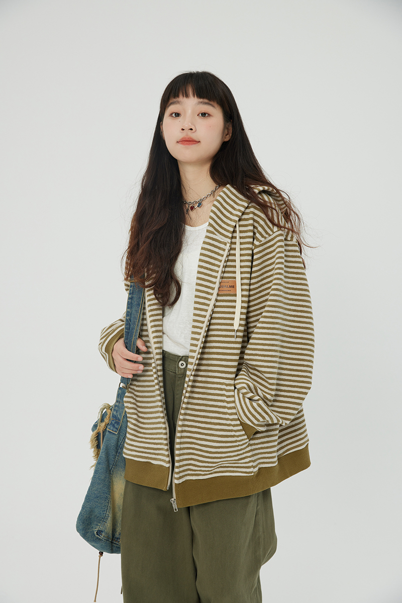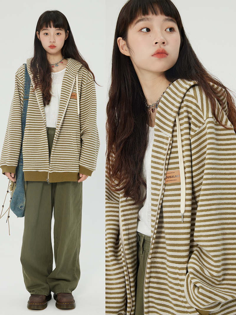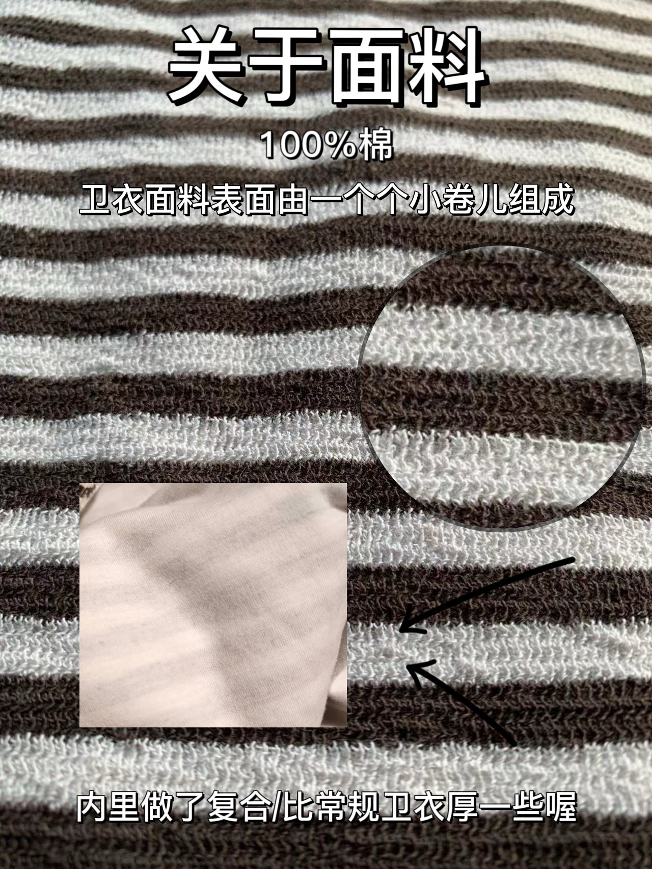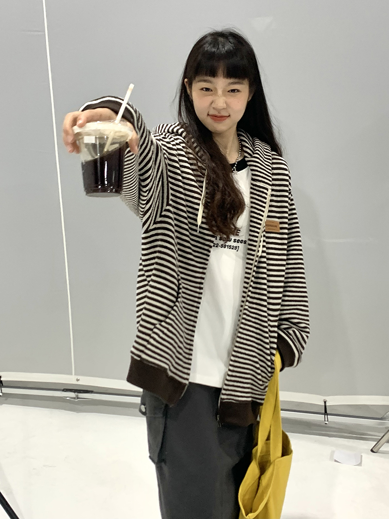 北原山貓 22ss/原創秋季條紋連帽運動衫女休閒寬鬆加厚長袖開衫外套