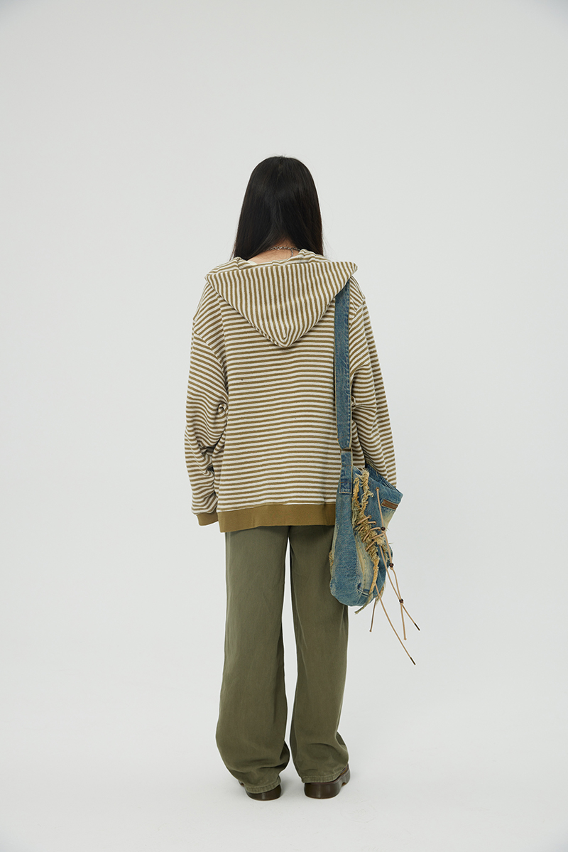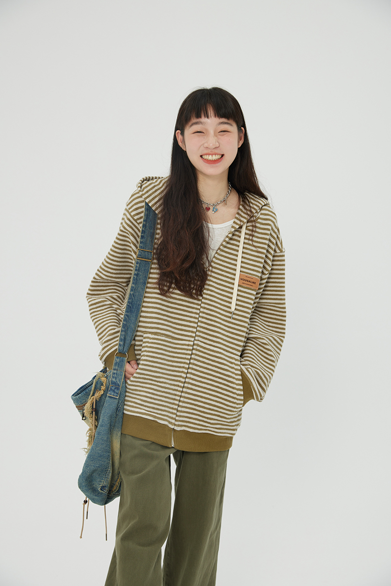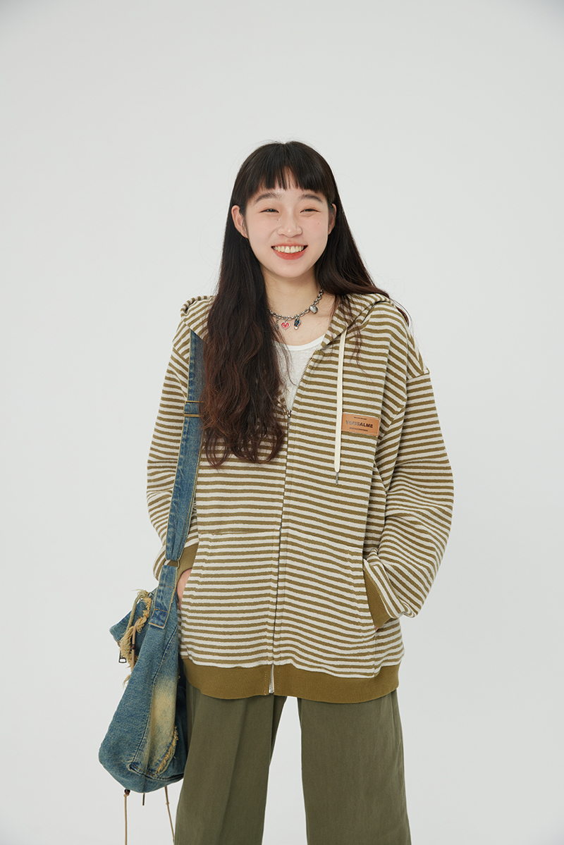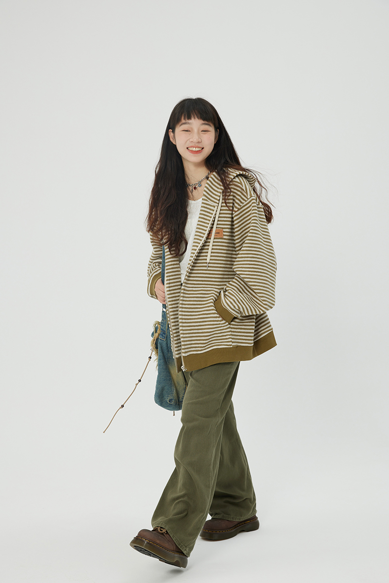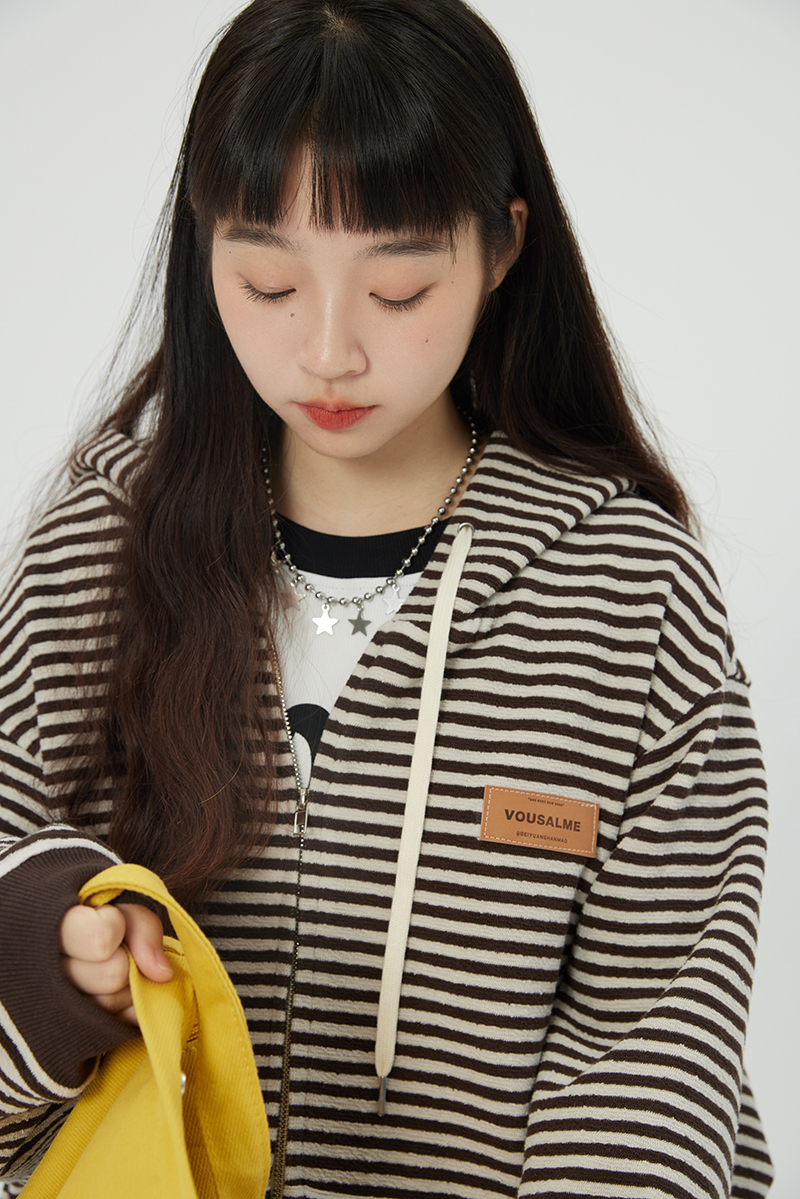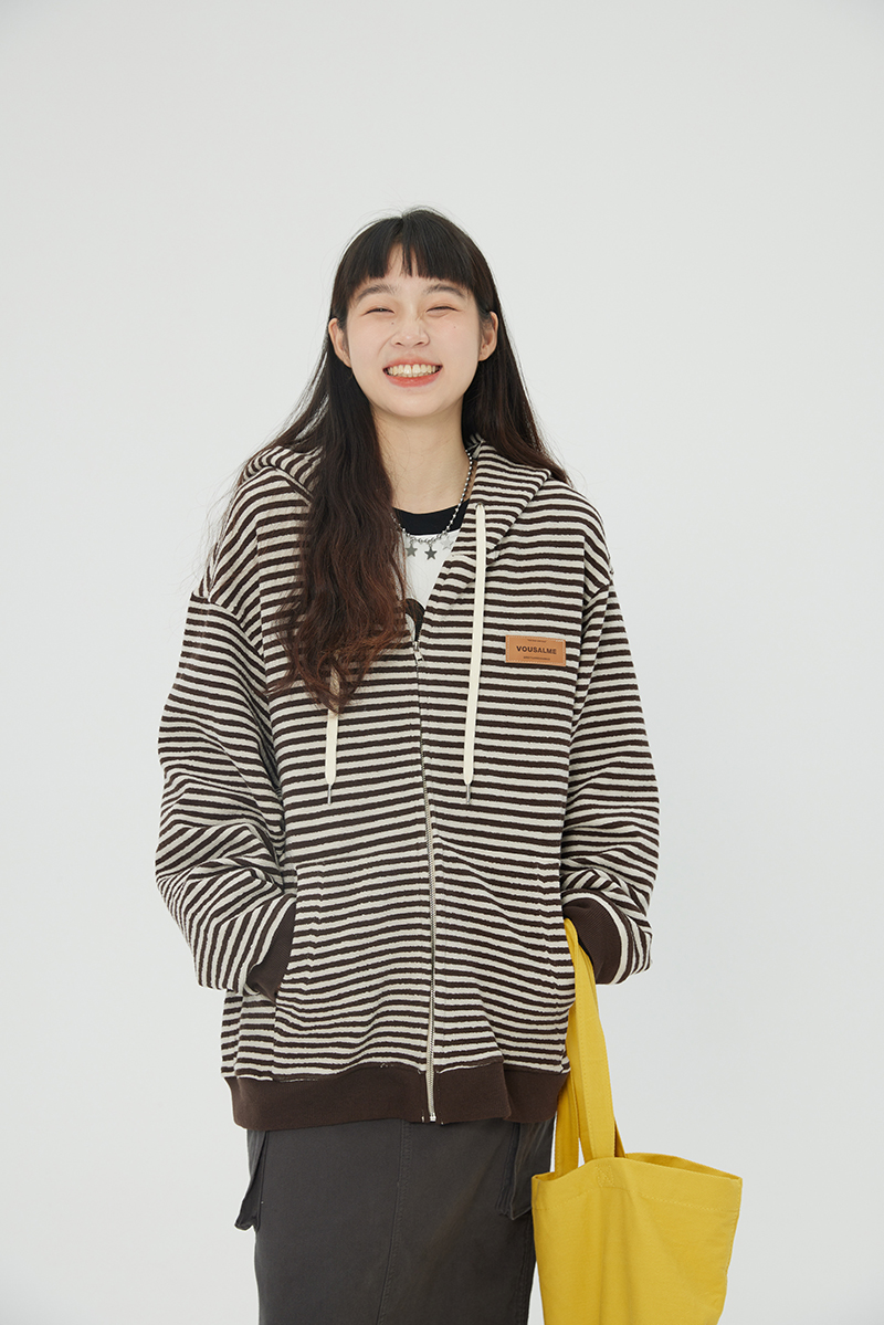 北原山貓 22ss/原創秋季條紋連帽運動衫女休閒寬鬆加厚長袖開衫外套