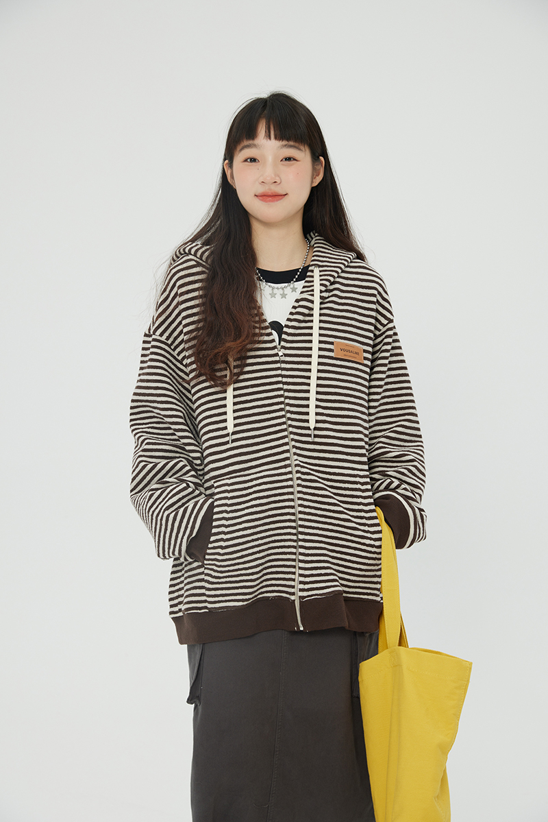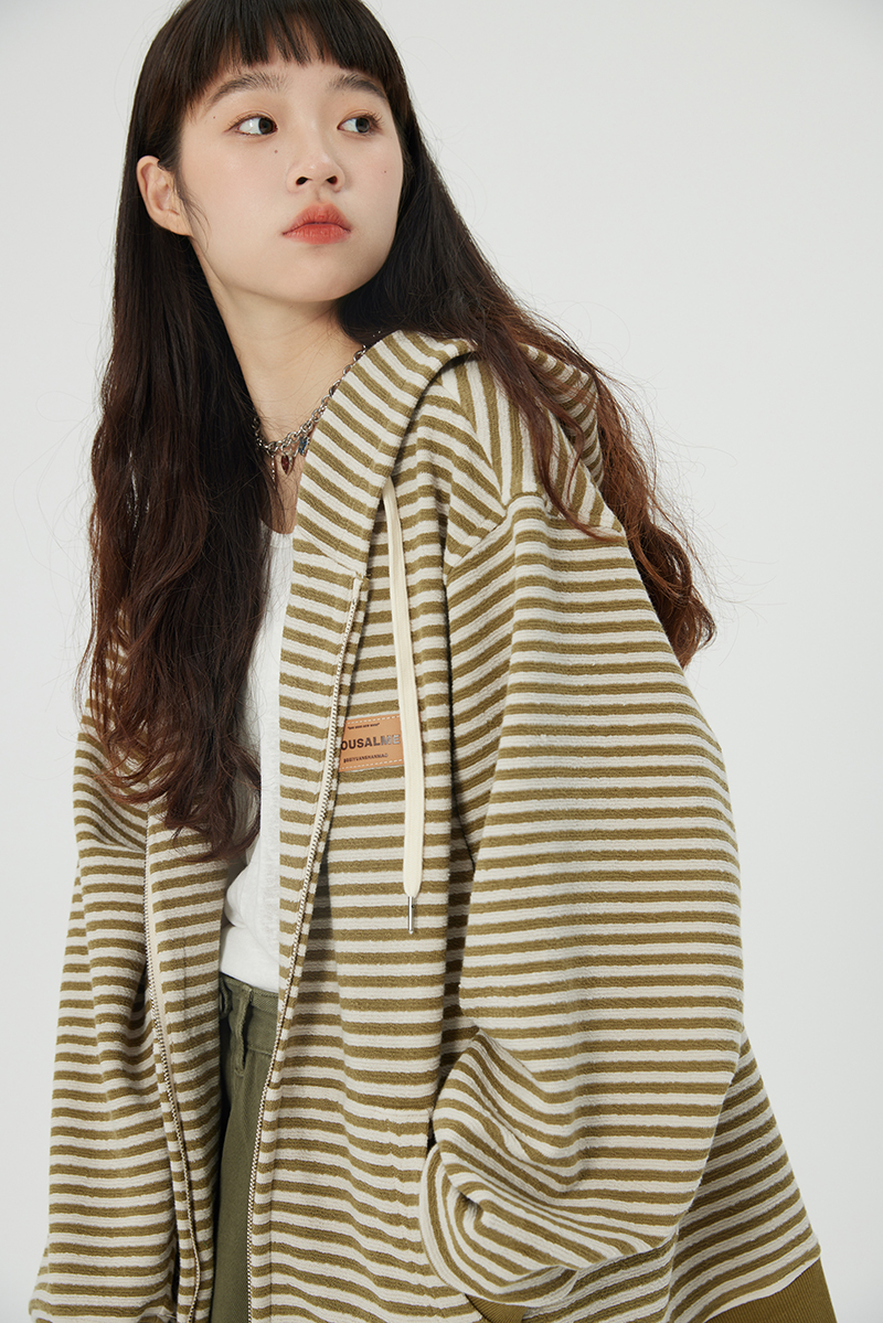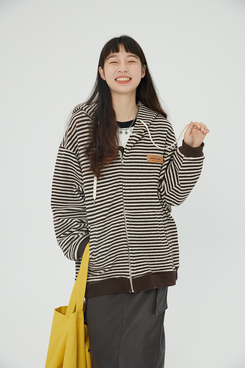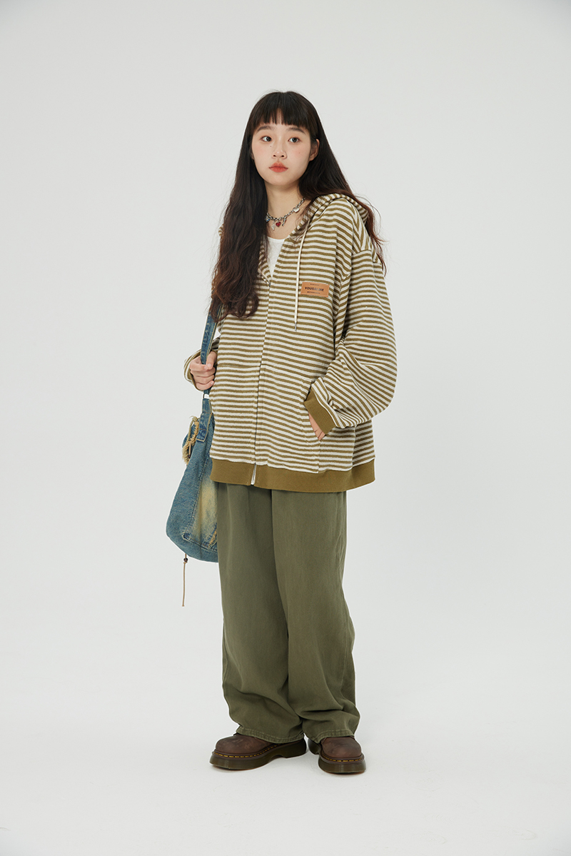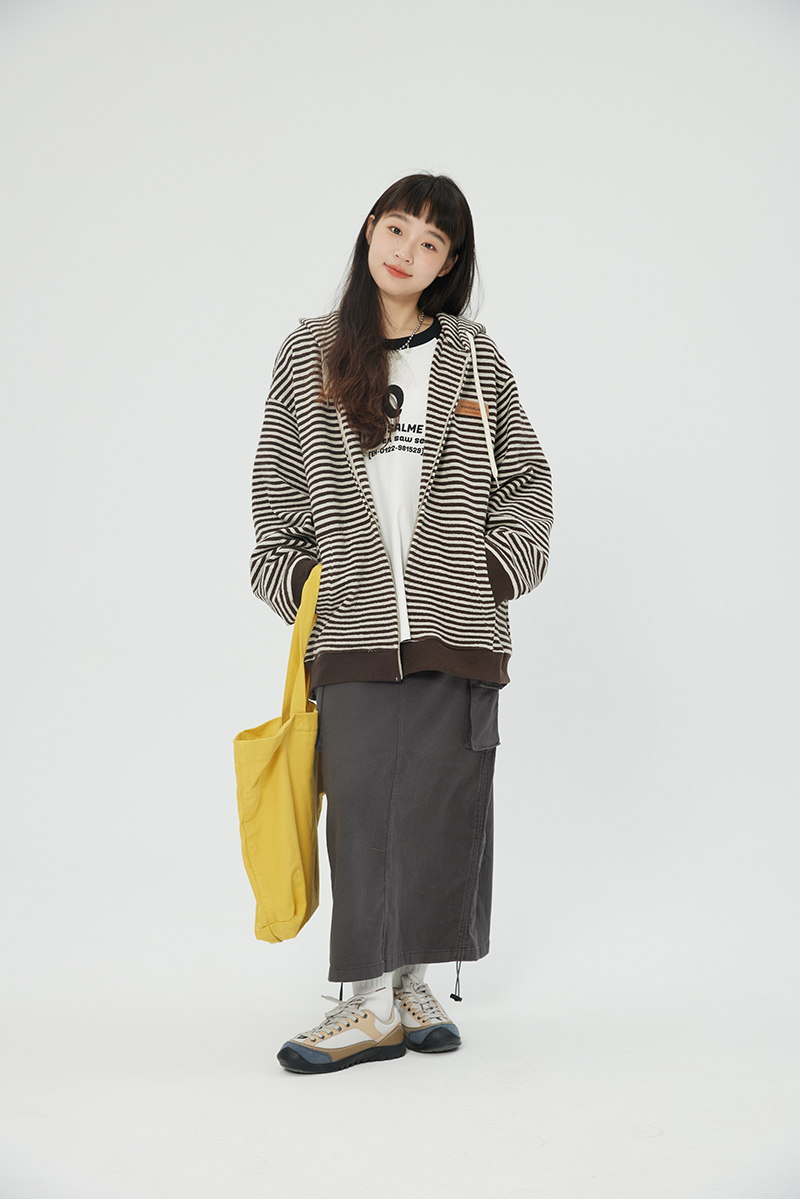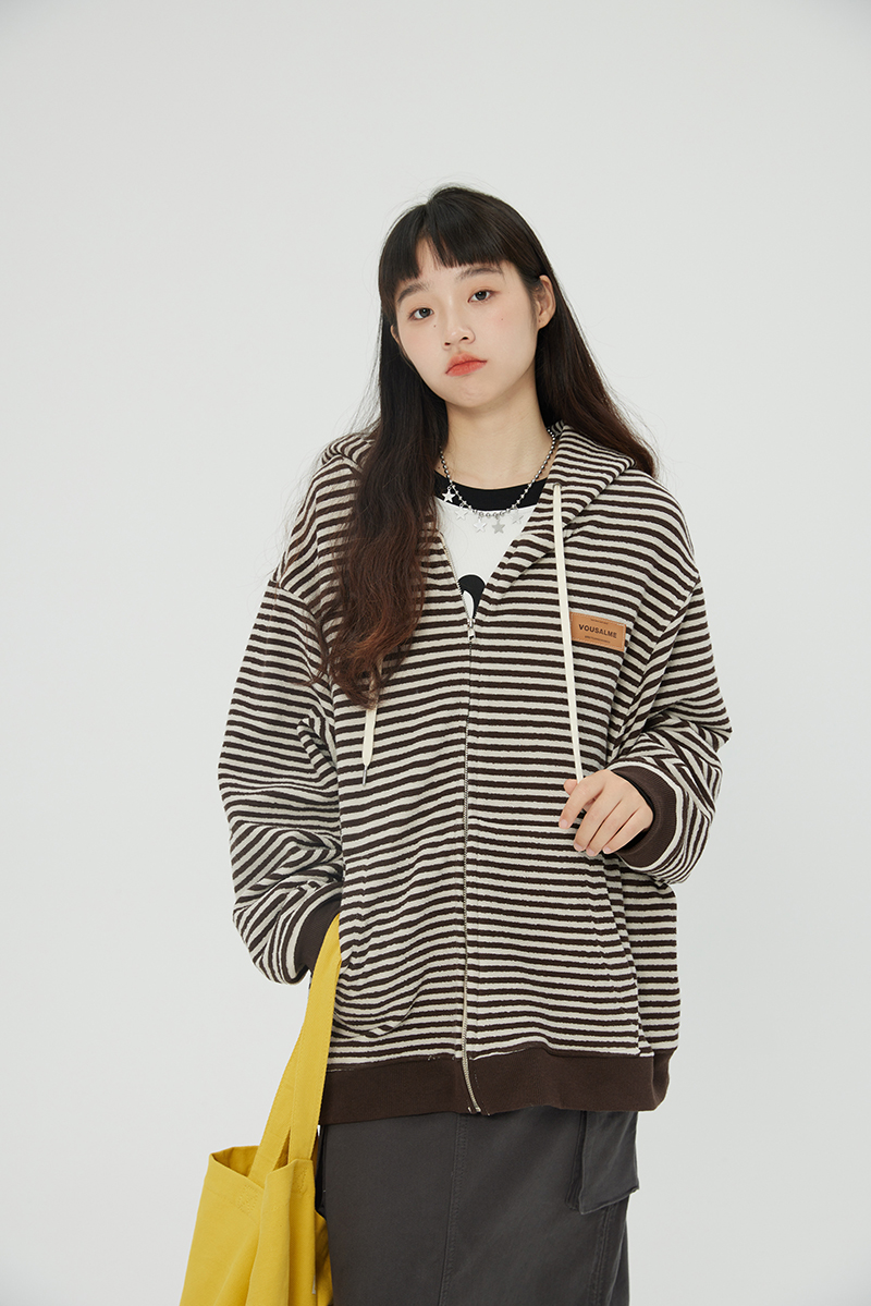 北原山貓 22ss/原創秋季條紋連帽運動衫女休閒寬鬆加厚長袖開衫外套