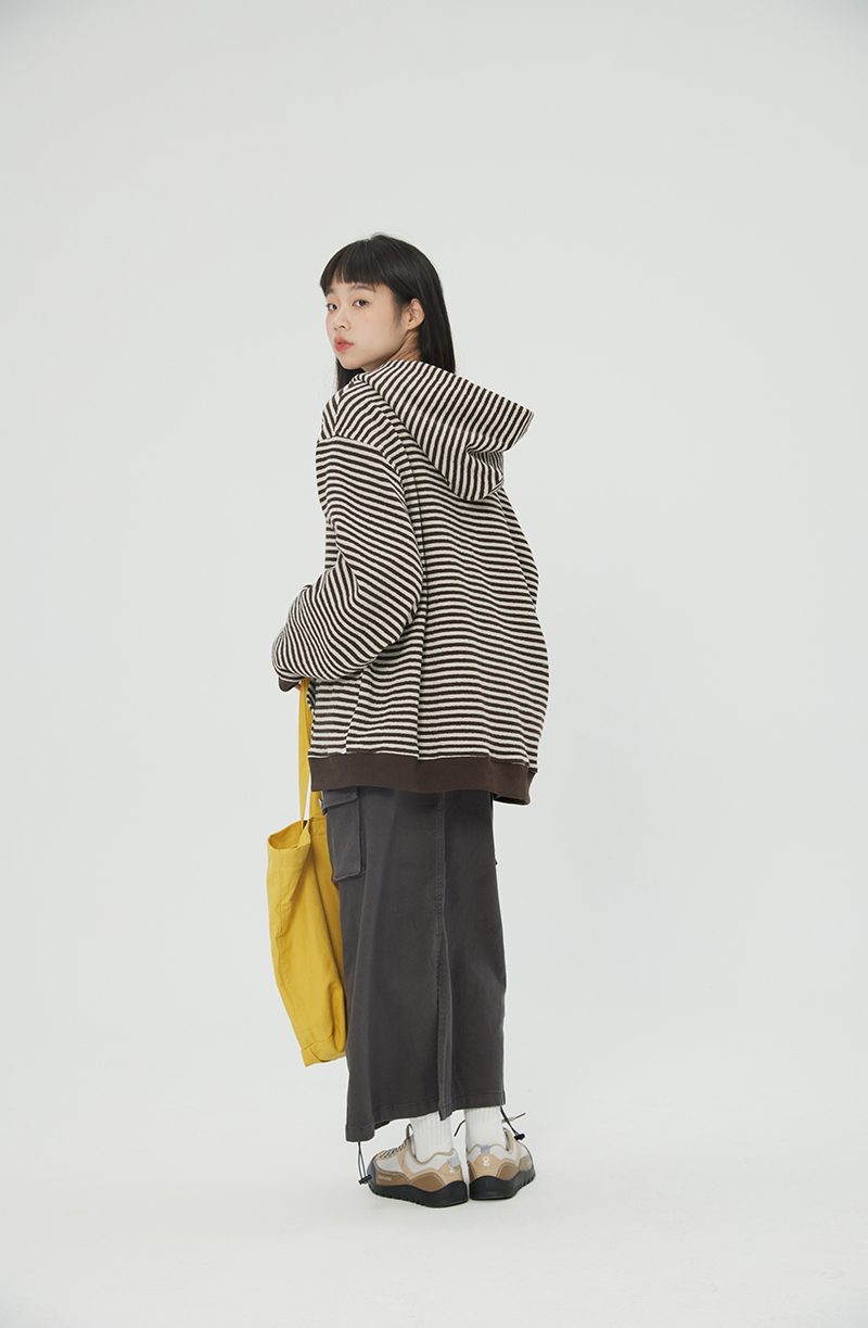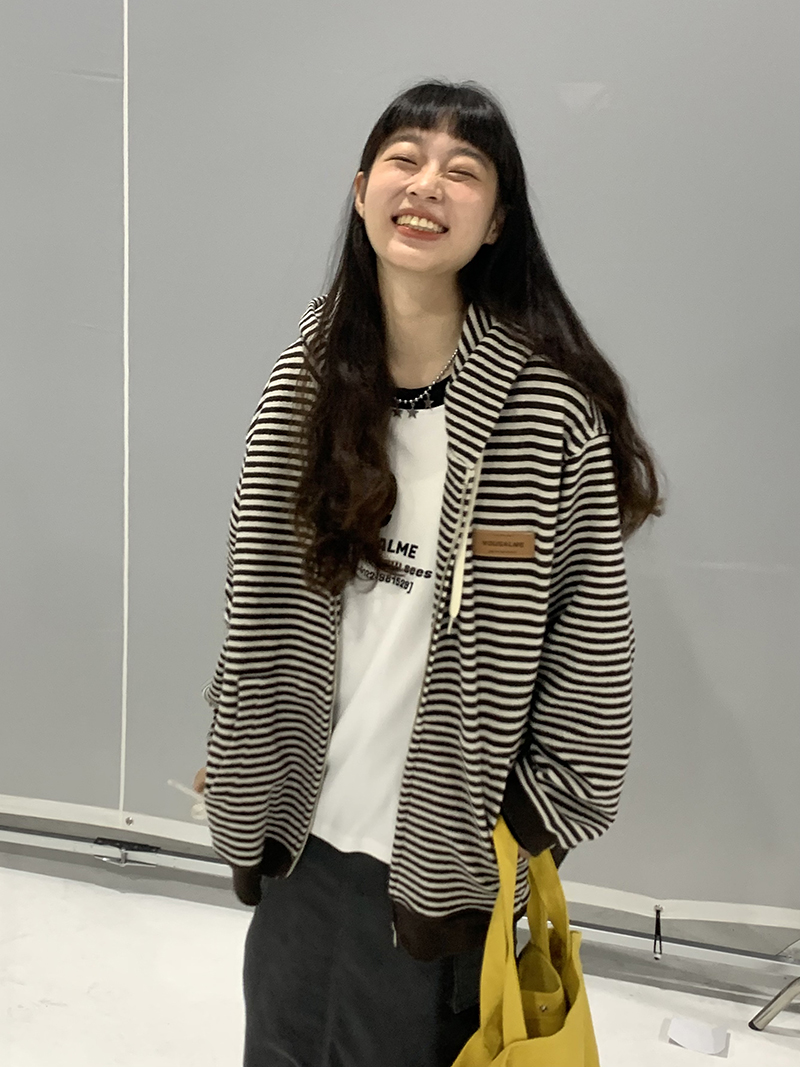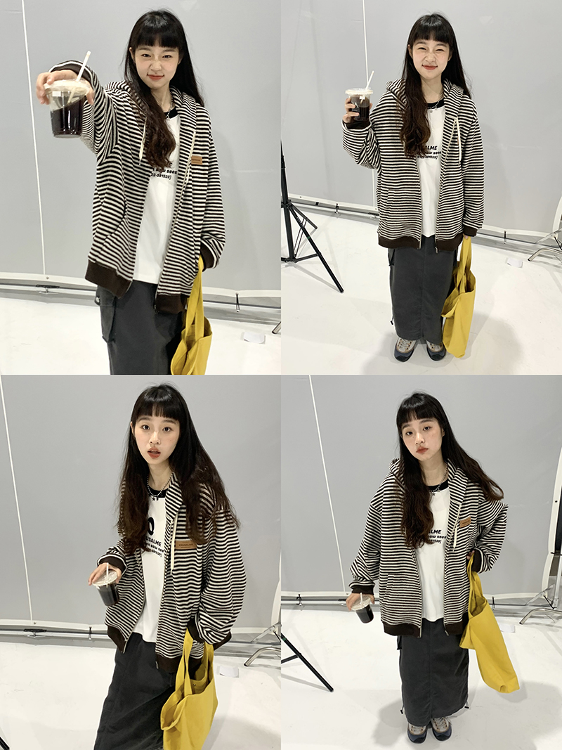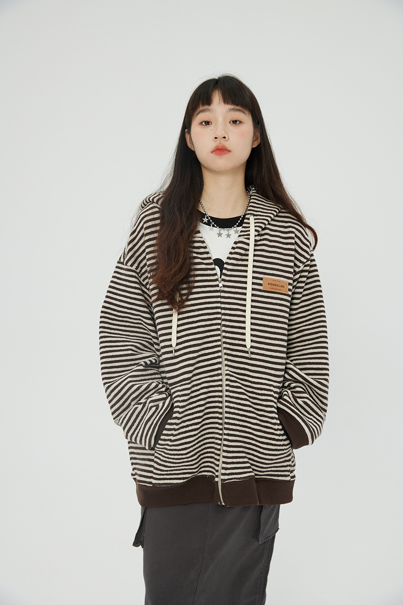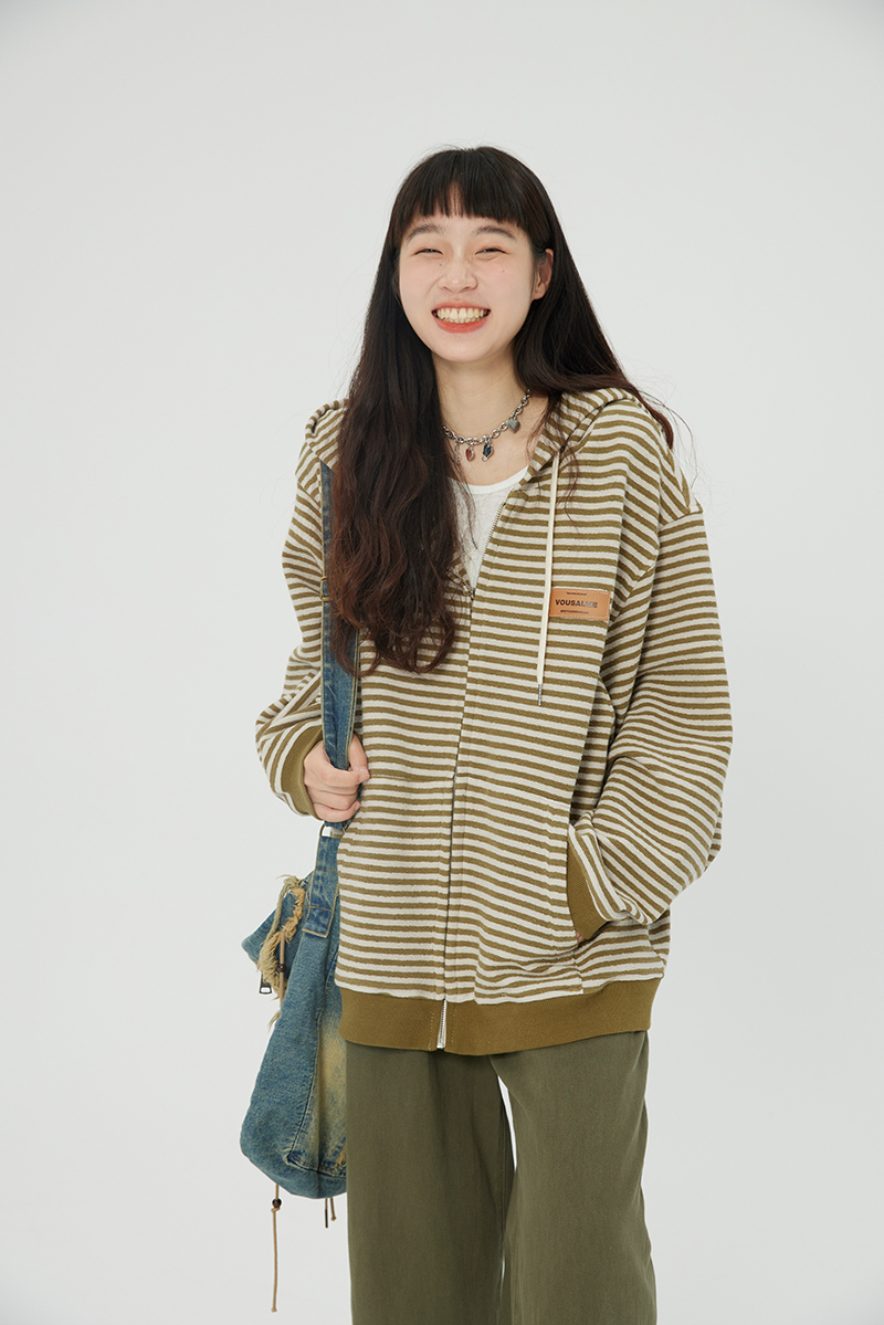 北原山貓 22ss/原創秋季條紋連帽運動衫女休閒寬鬆加厚長袖開衫外套