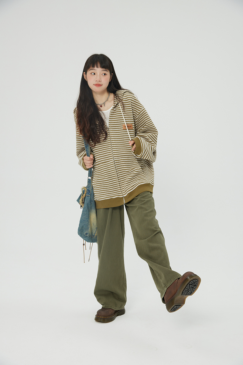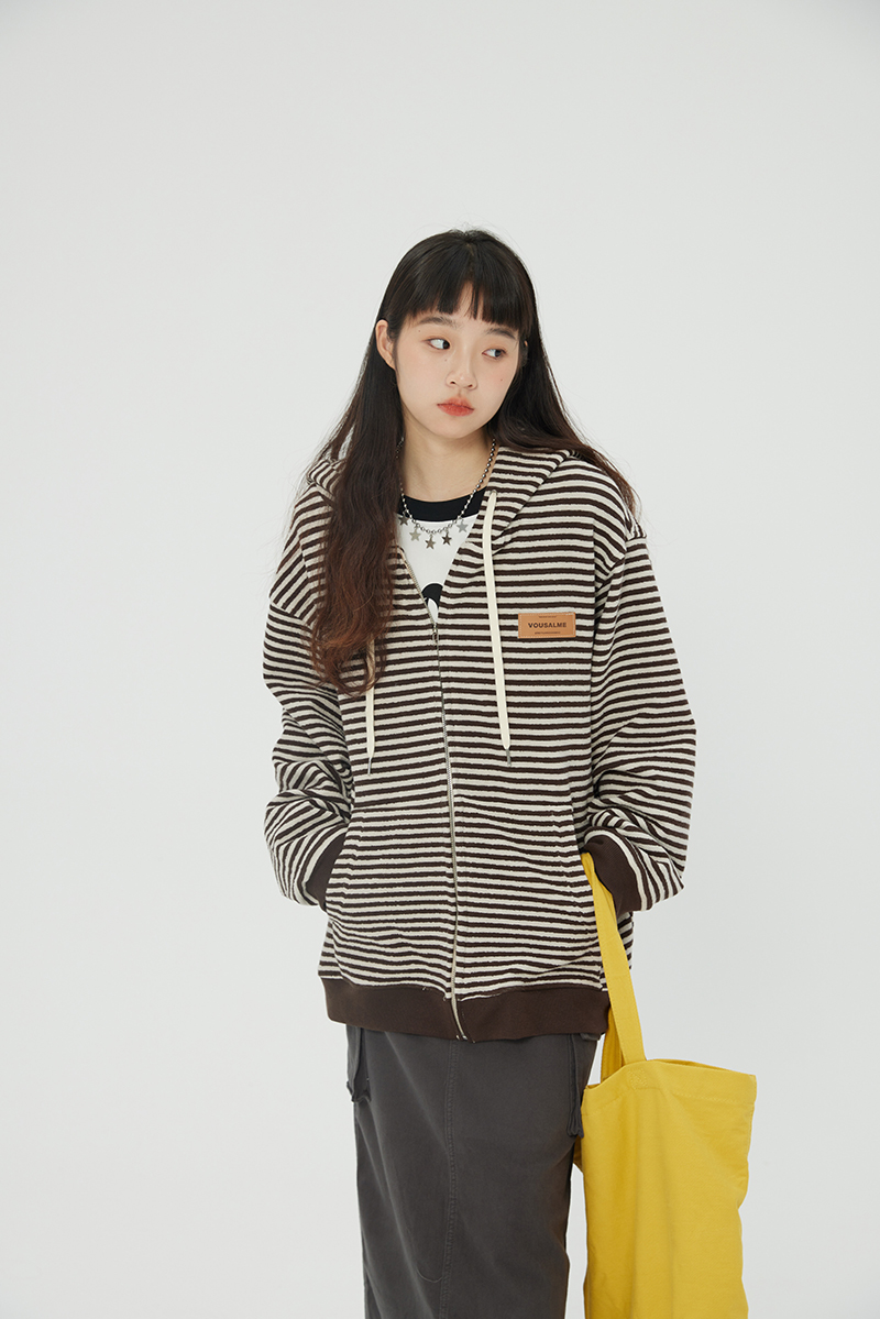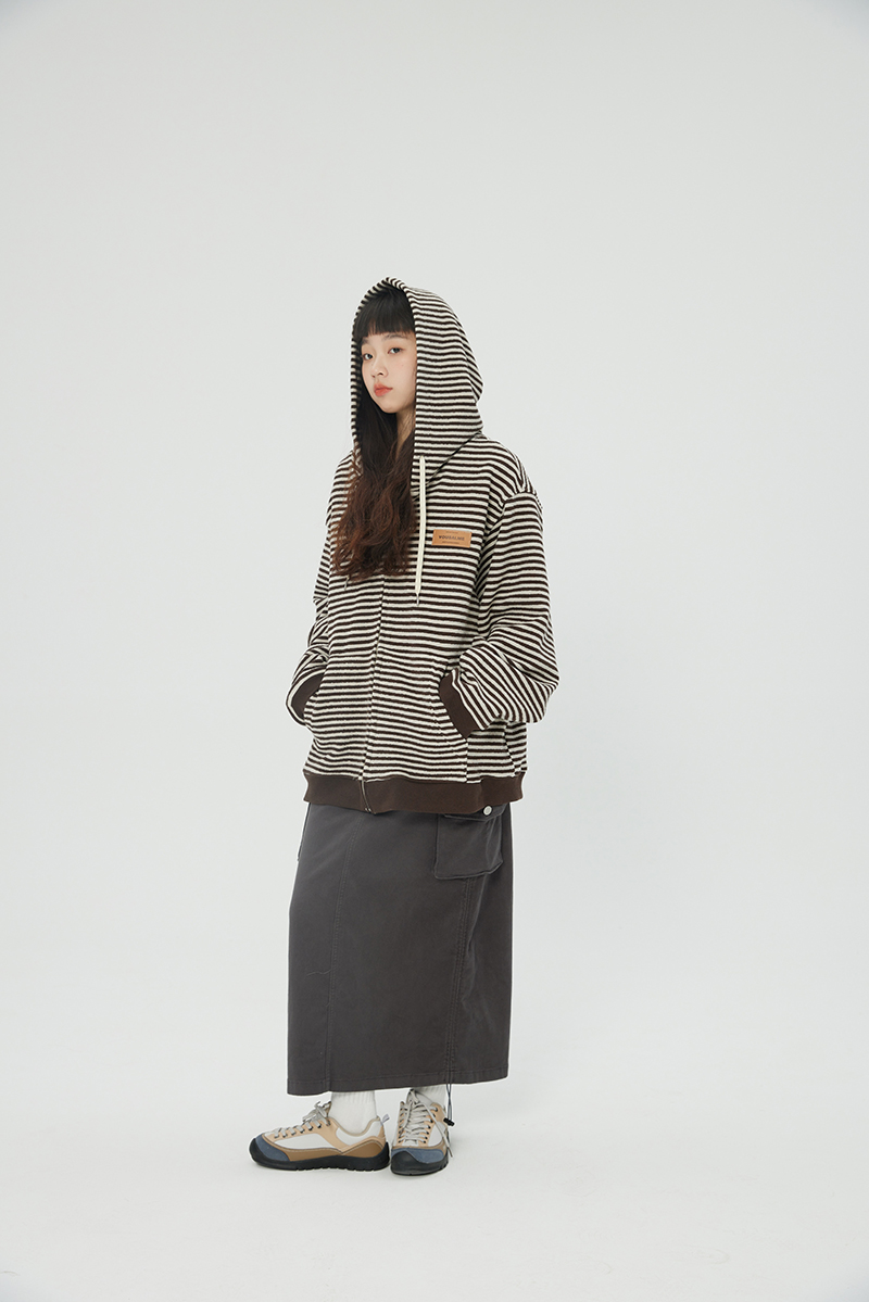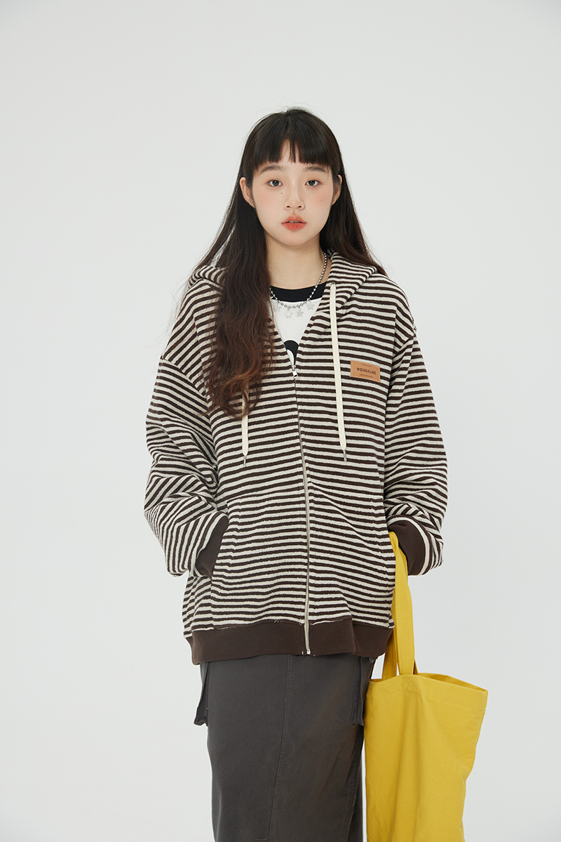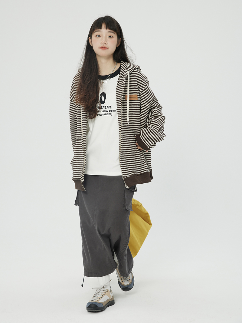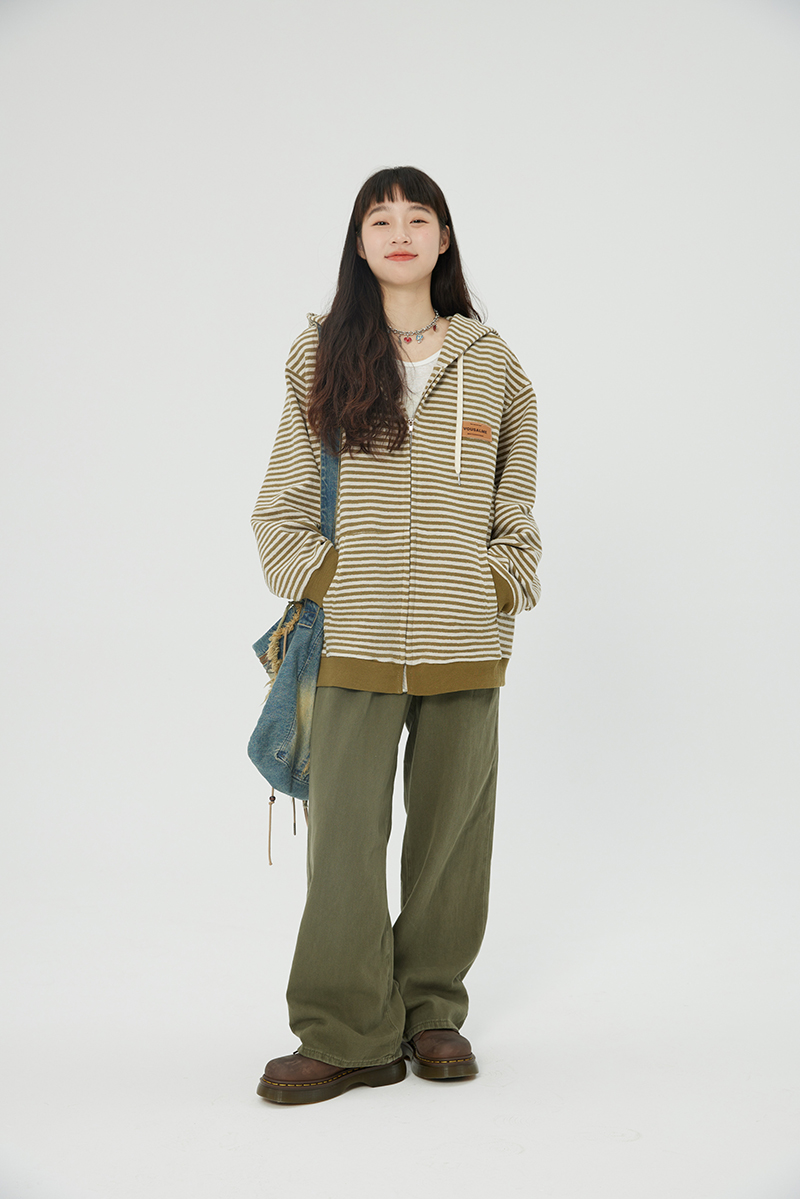 北原山貓 22ss/原創秋季條紋連帽運動衫女休閒寬鬆加厚長袖開衫外套