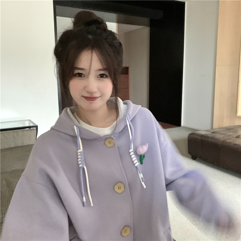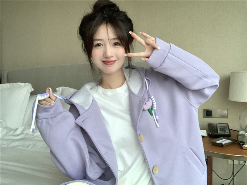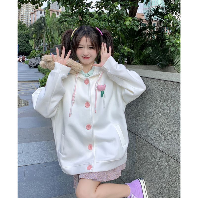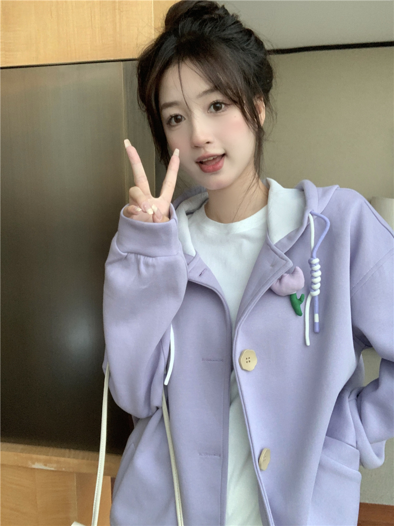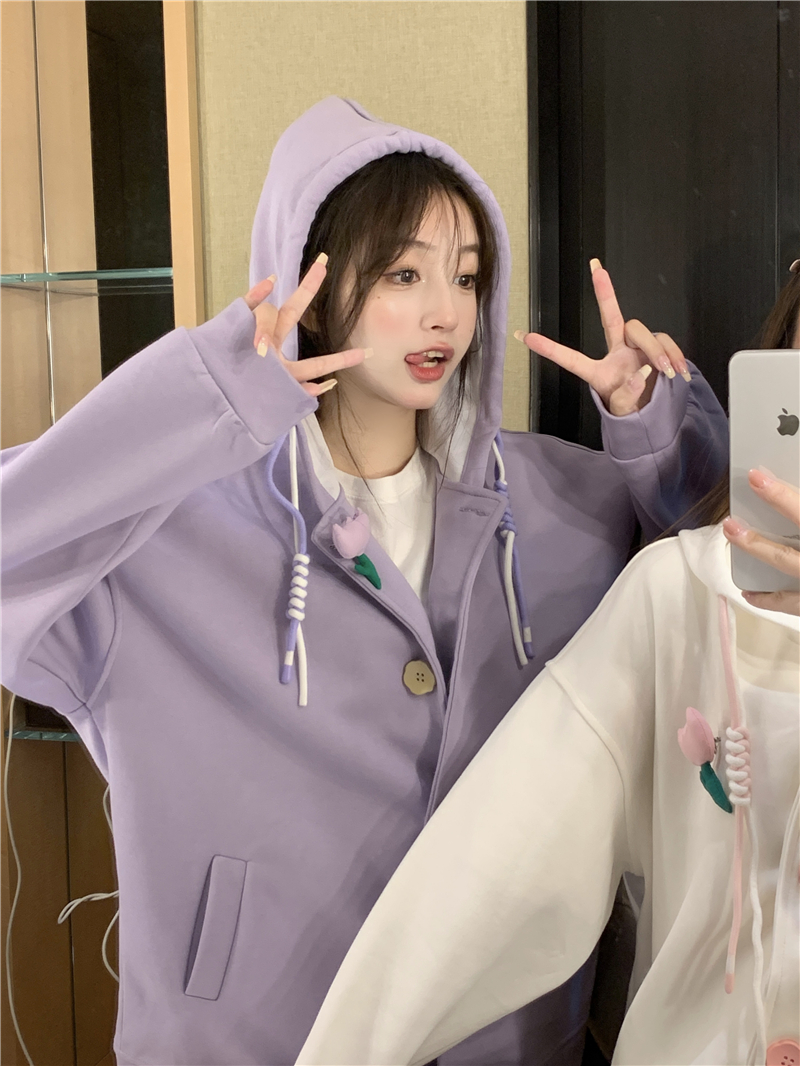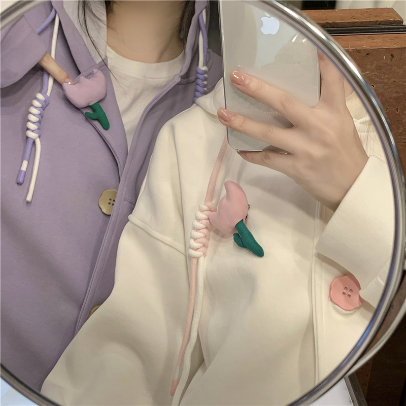 甜美森系設計感連帽長袖厚棉T女裝秋季2023新款時尚加厚寬鬆外套潮