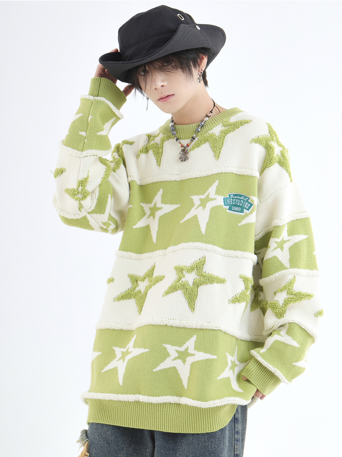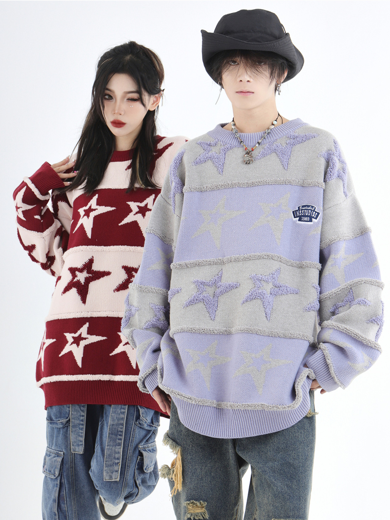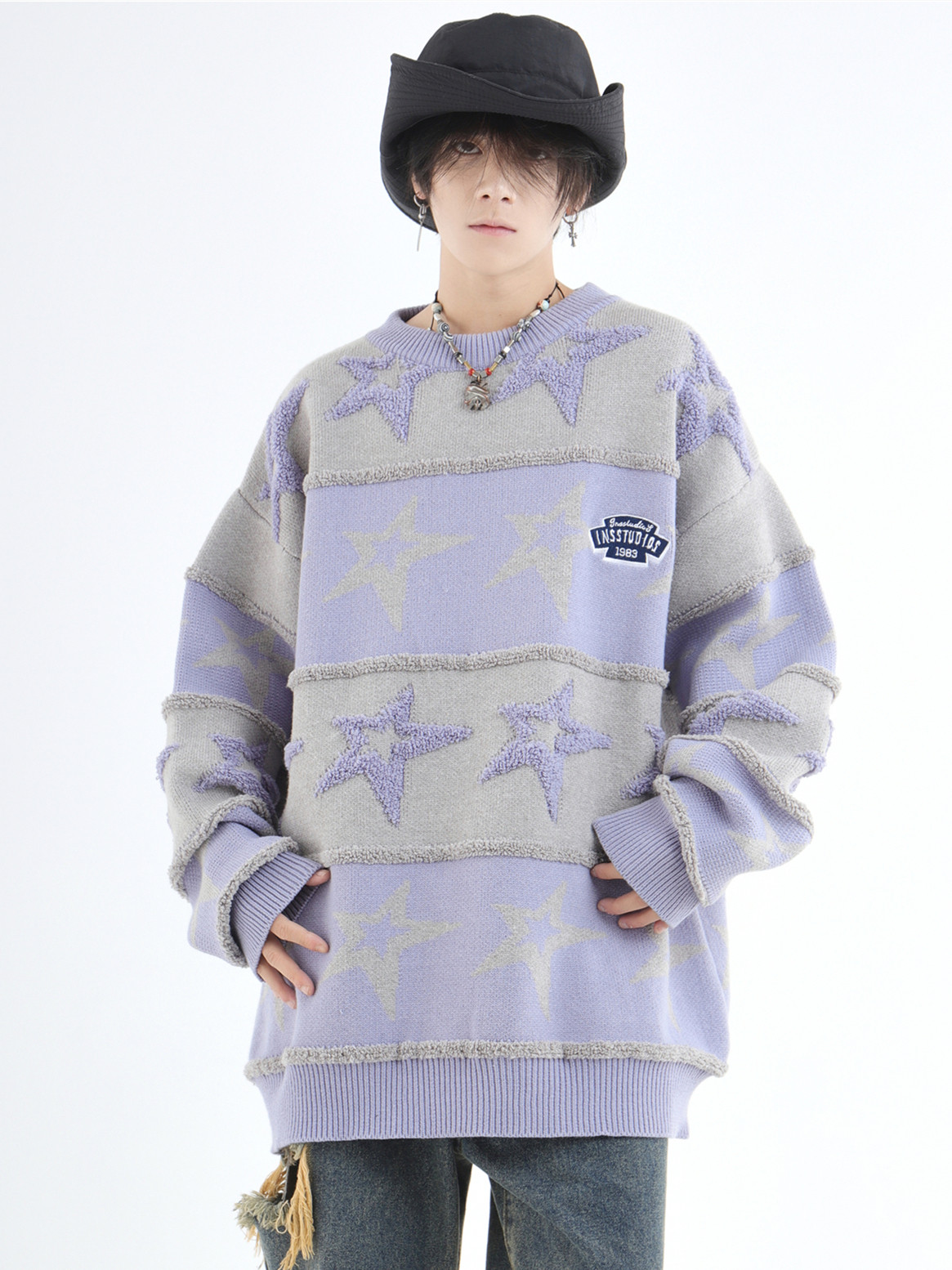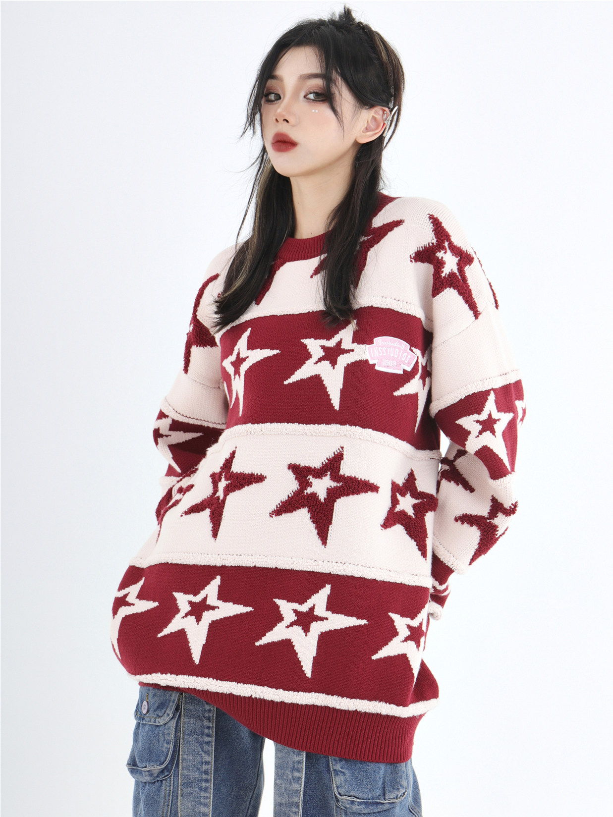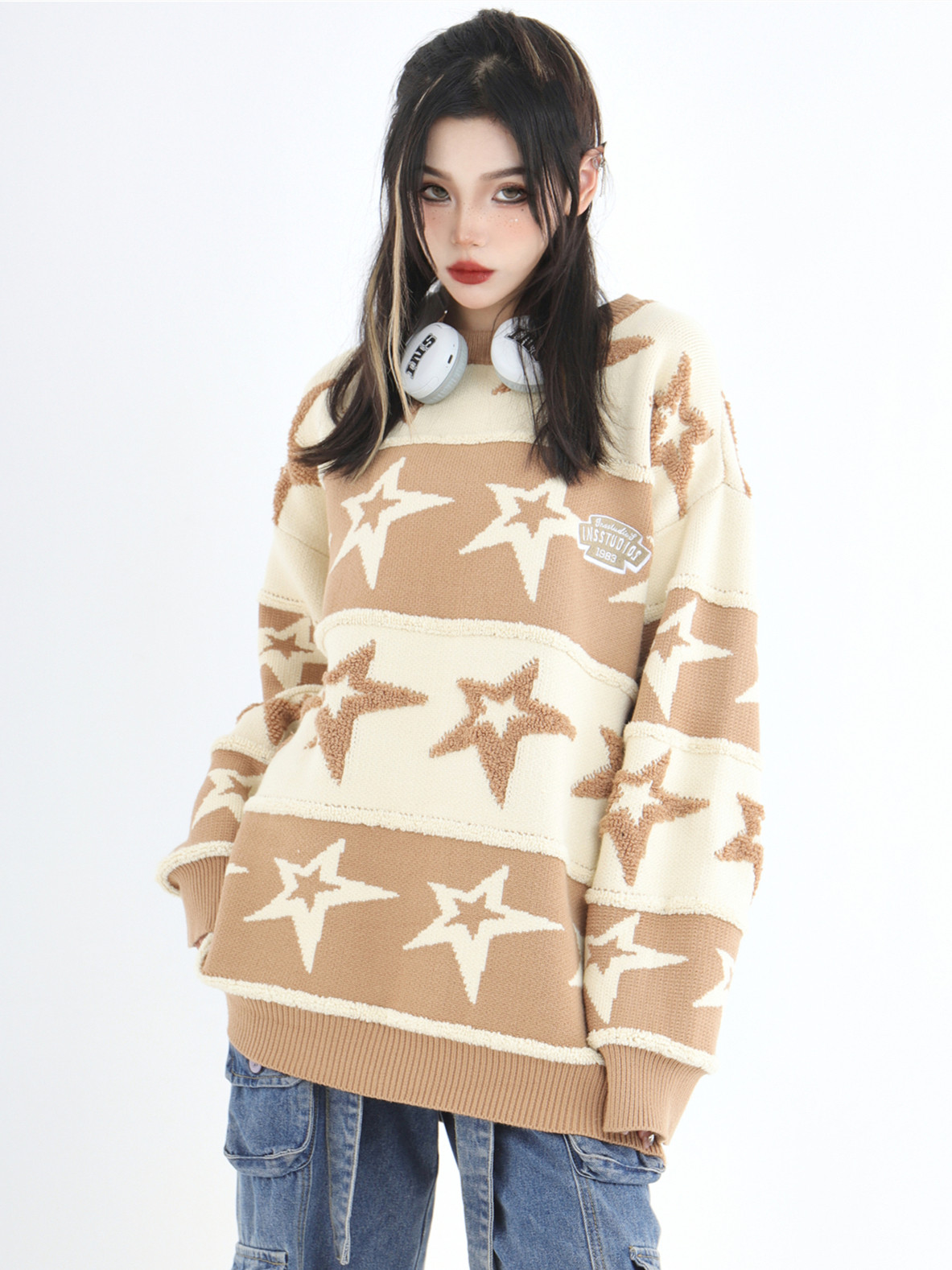 INSstudios 國潮牌情侶美式植絨提花星星條紋套頭毛衣加厚針織衫