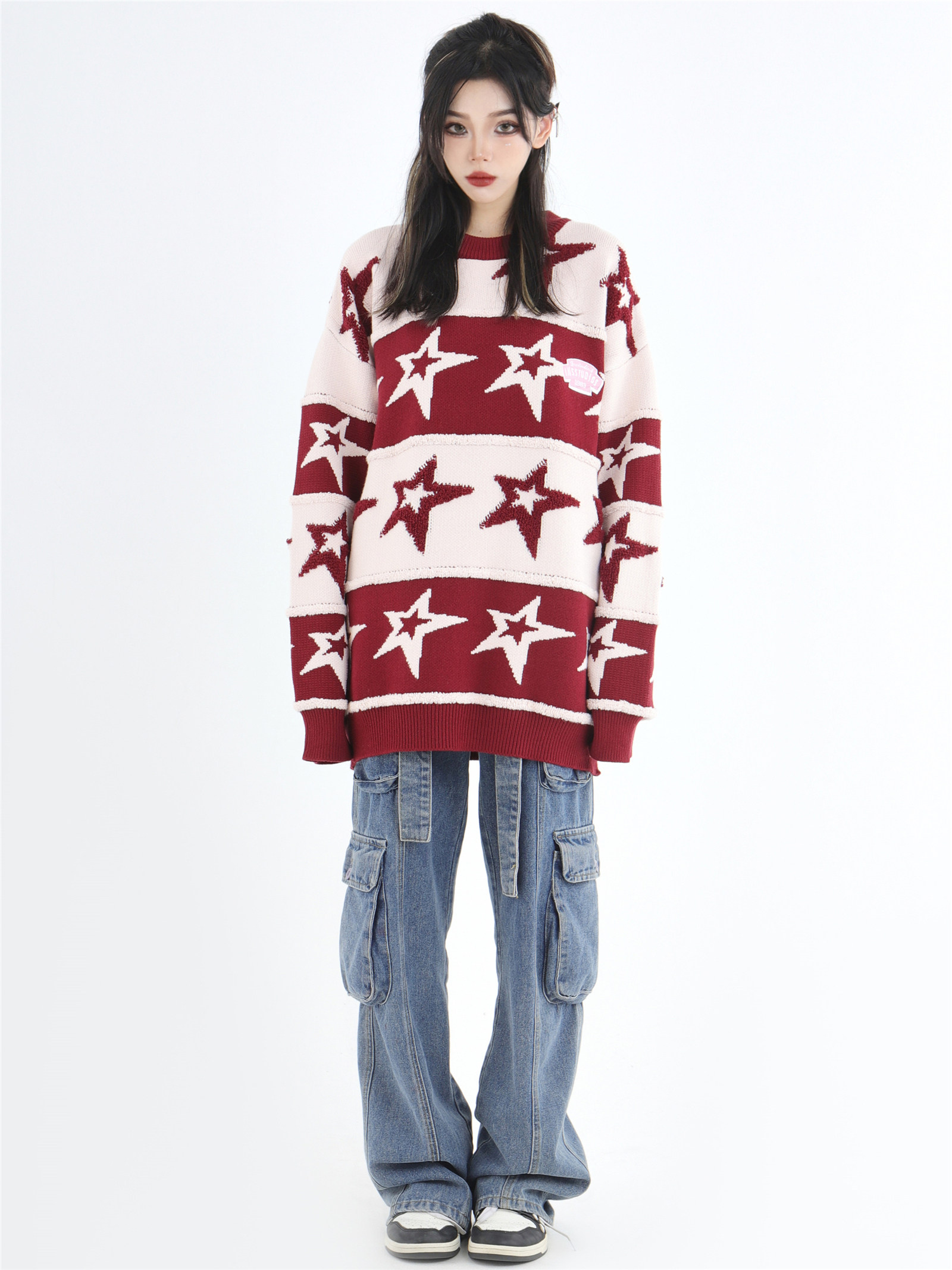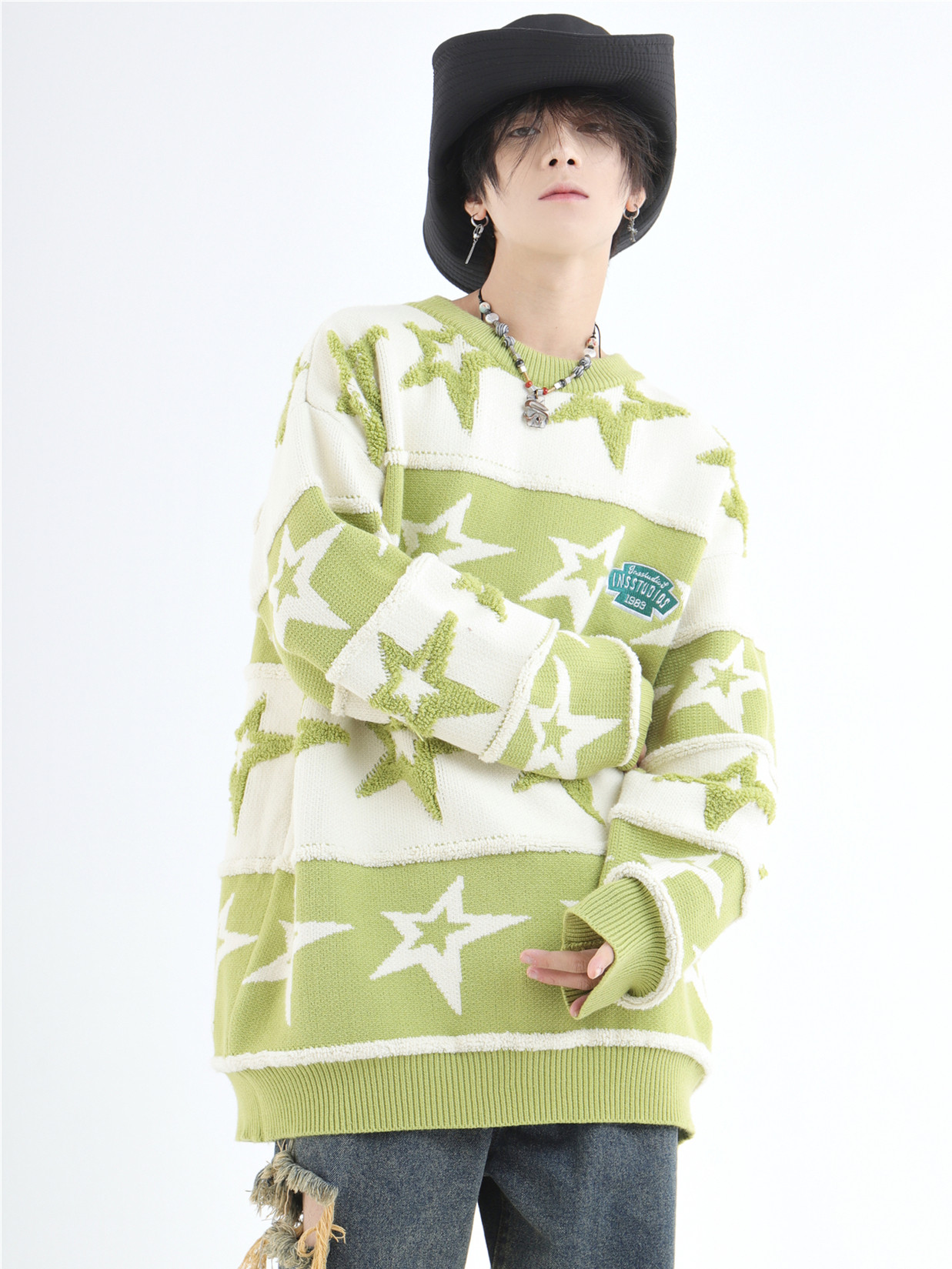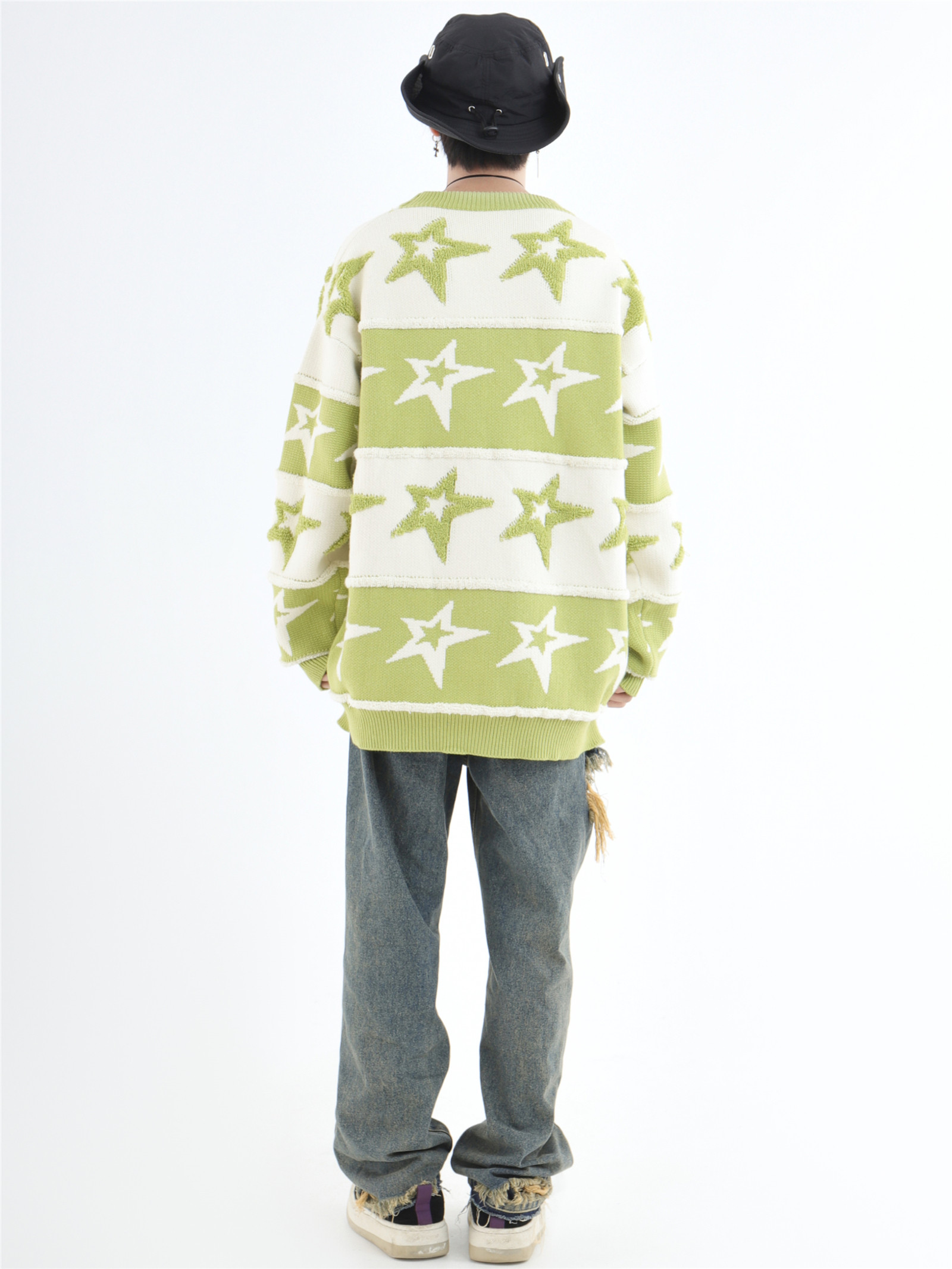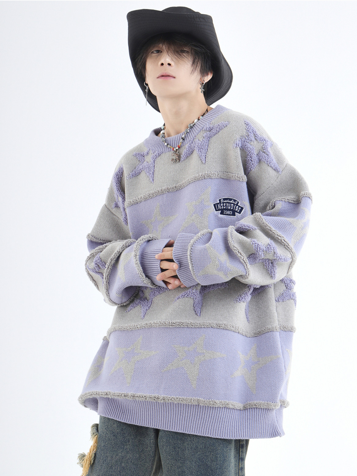 INSstudios 國潮牌情侶美式植絨提花星星條紋套頭毛衣加厚針織衫