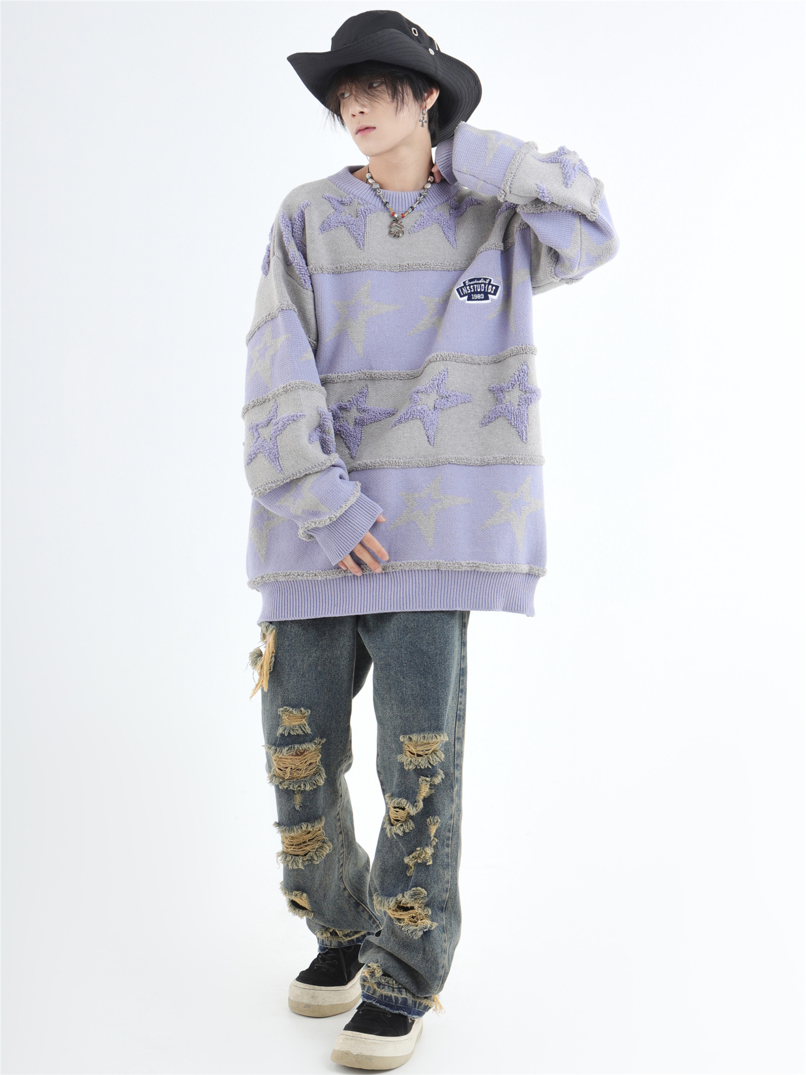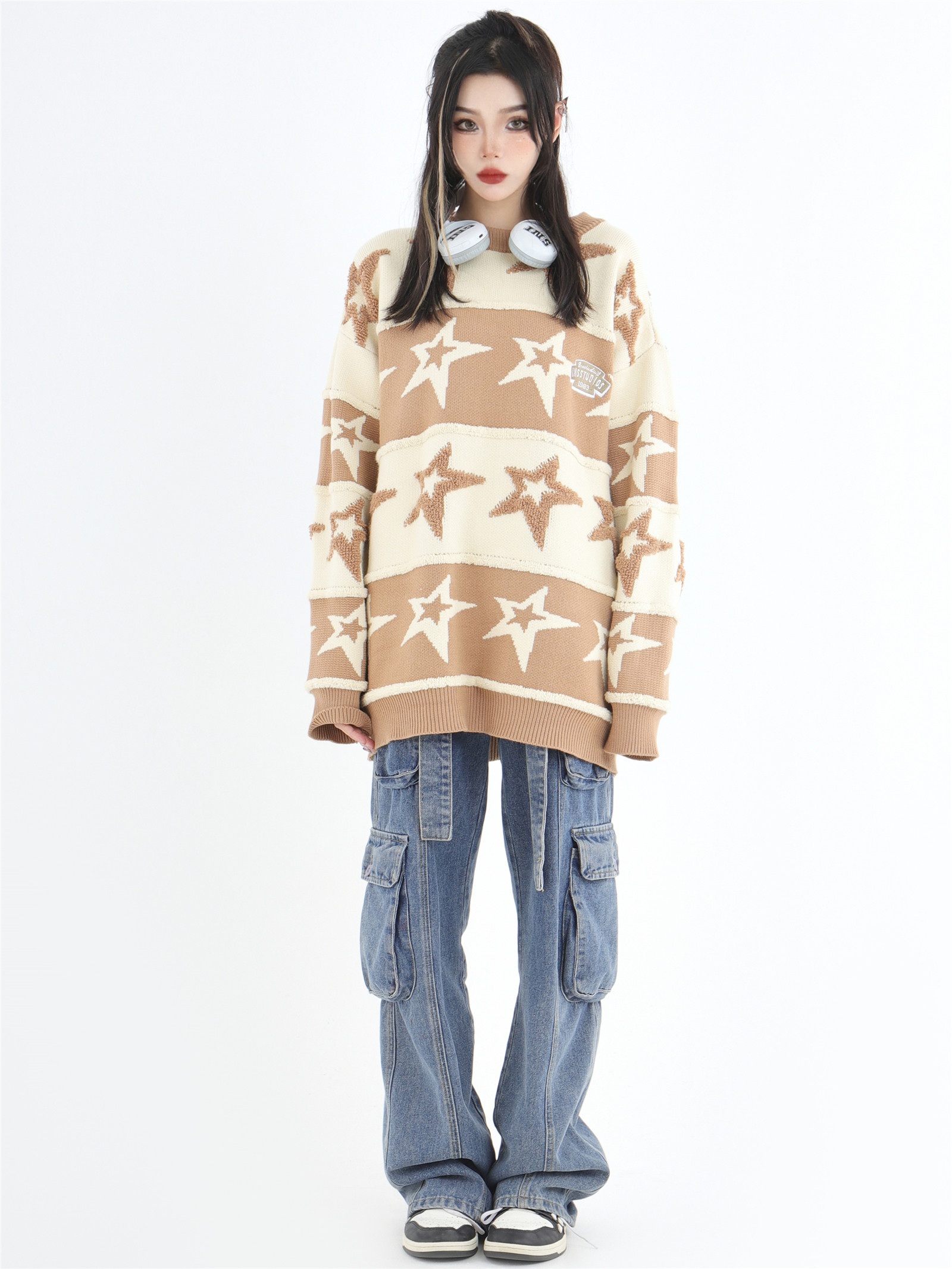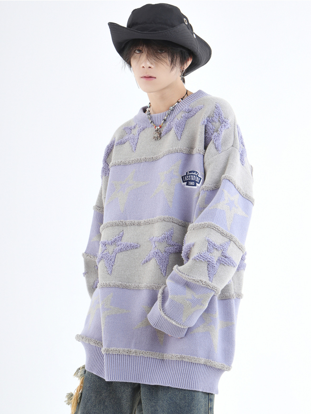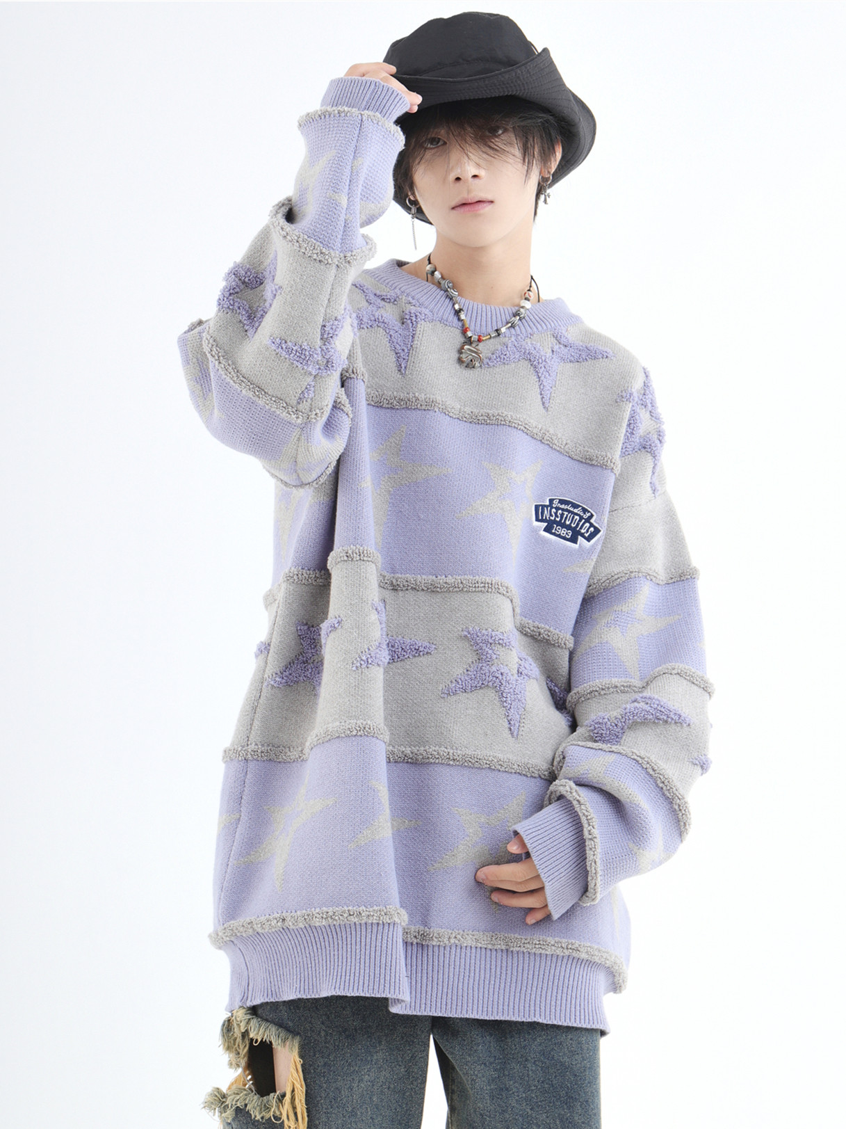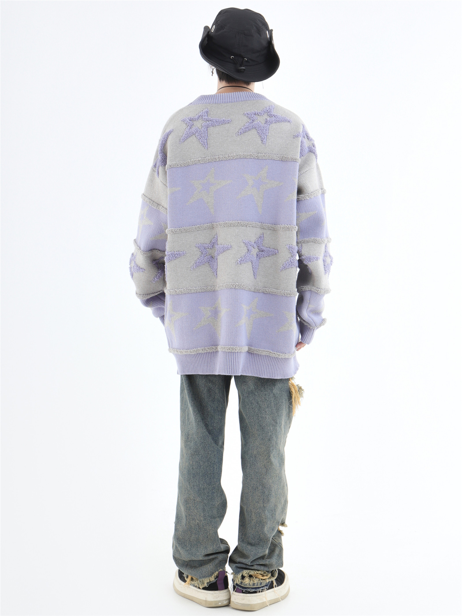 INSstudios 國潮牌情侶美式植絨提花星星條紋套頭毛衣加厚針織衫