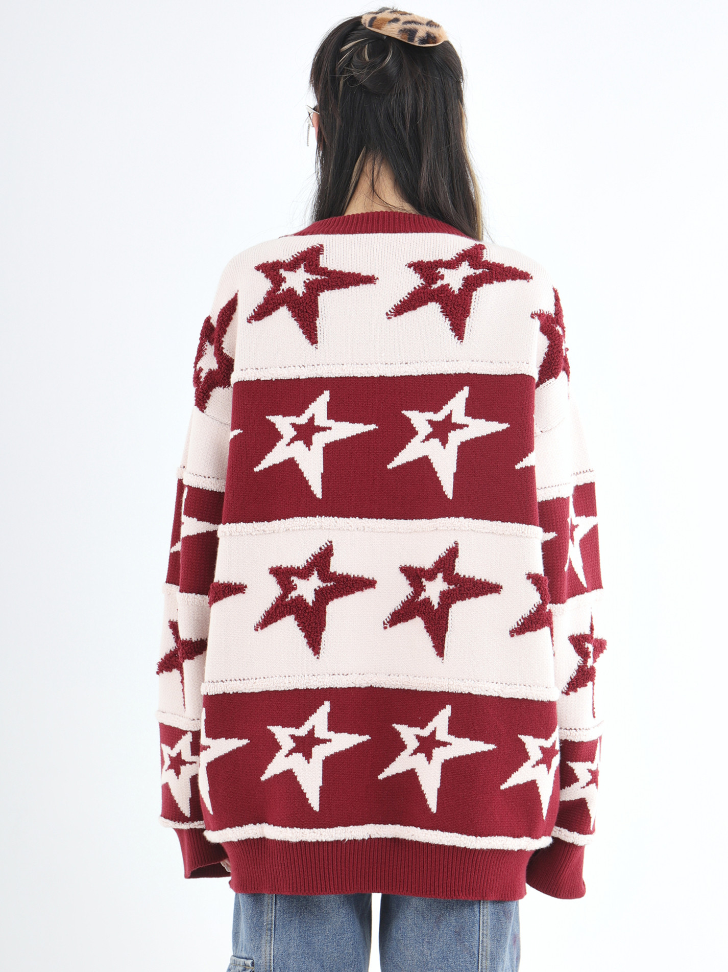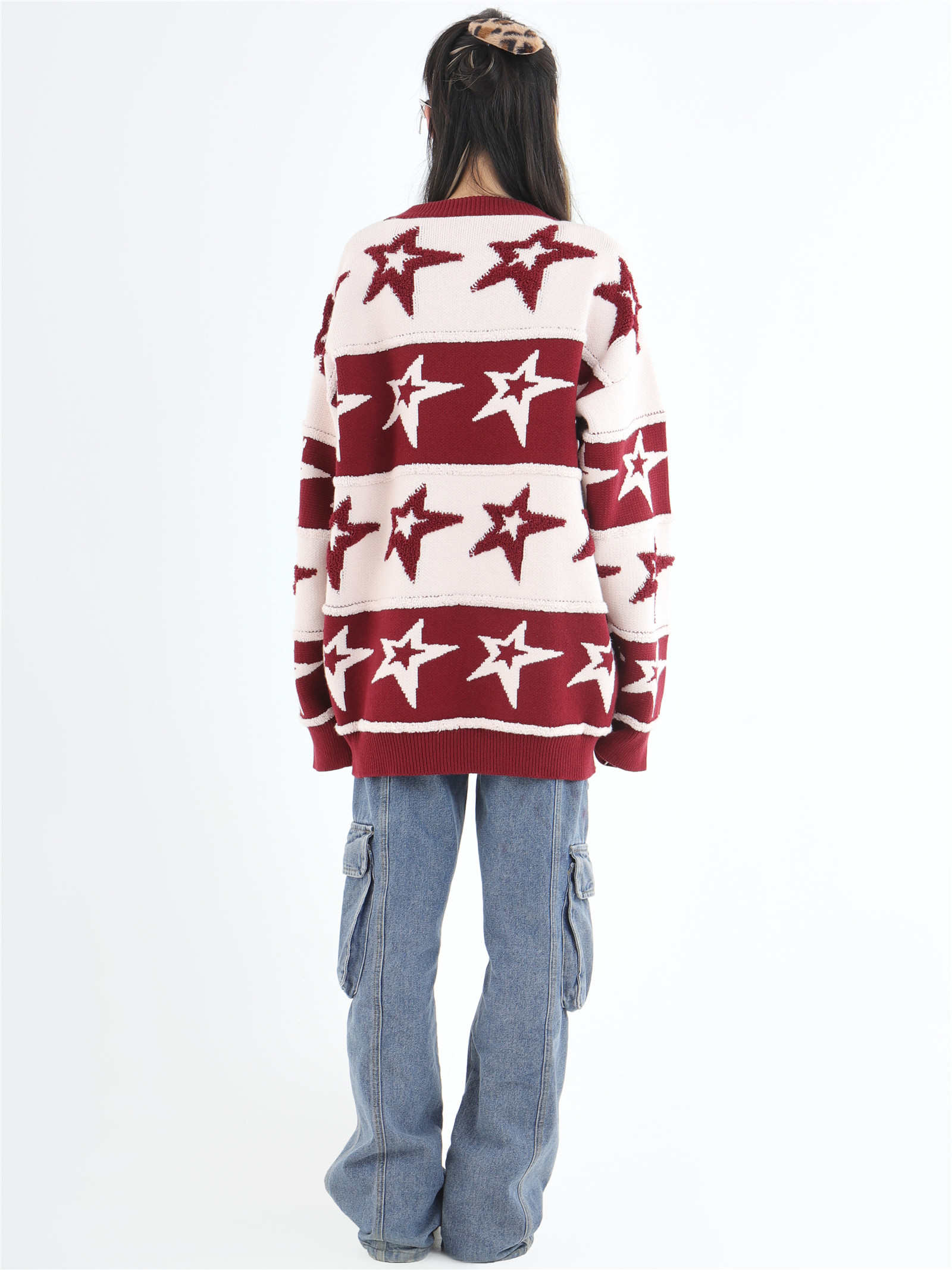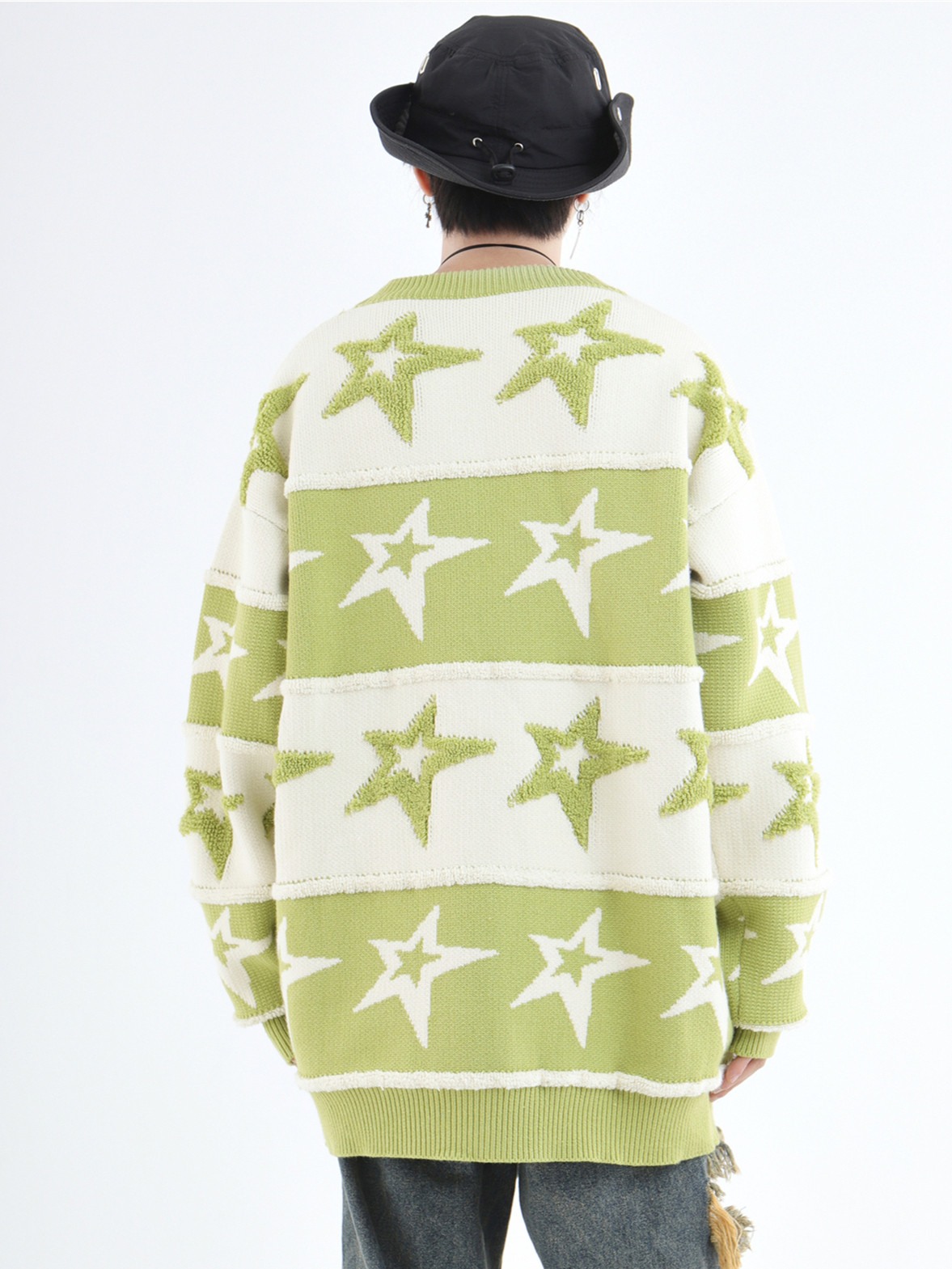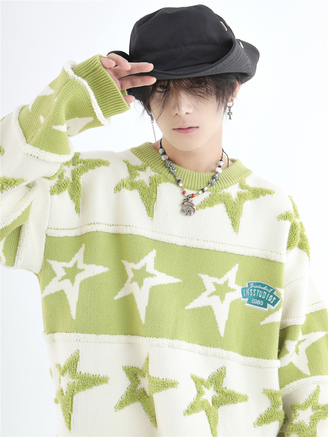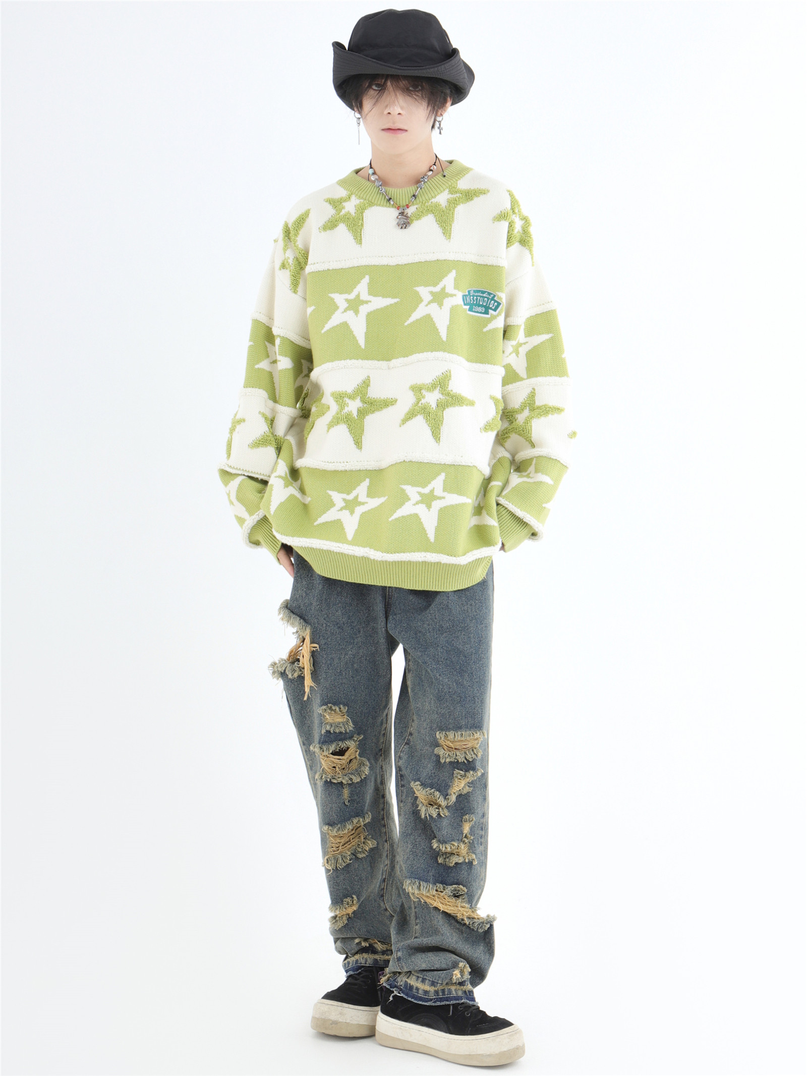 INSstudios 國潮牌情侶美式植絨提花星星條紋套頭毛衣加厚針織衫