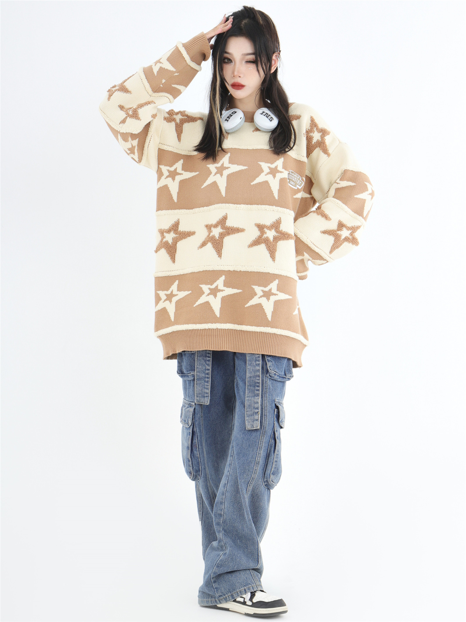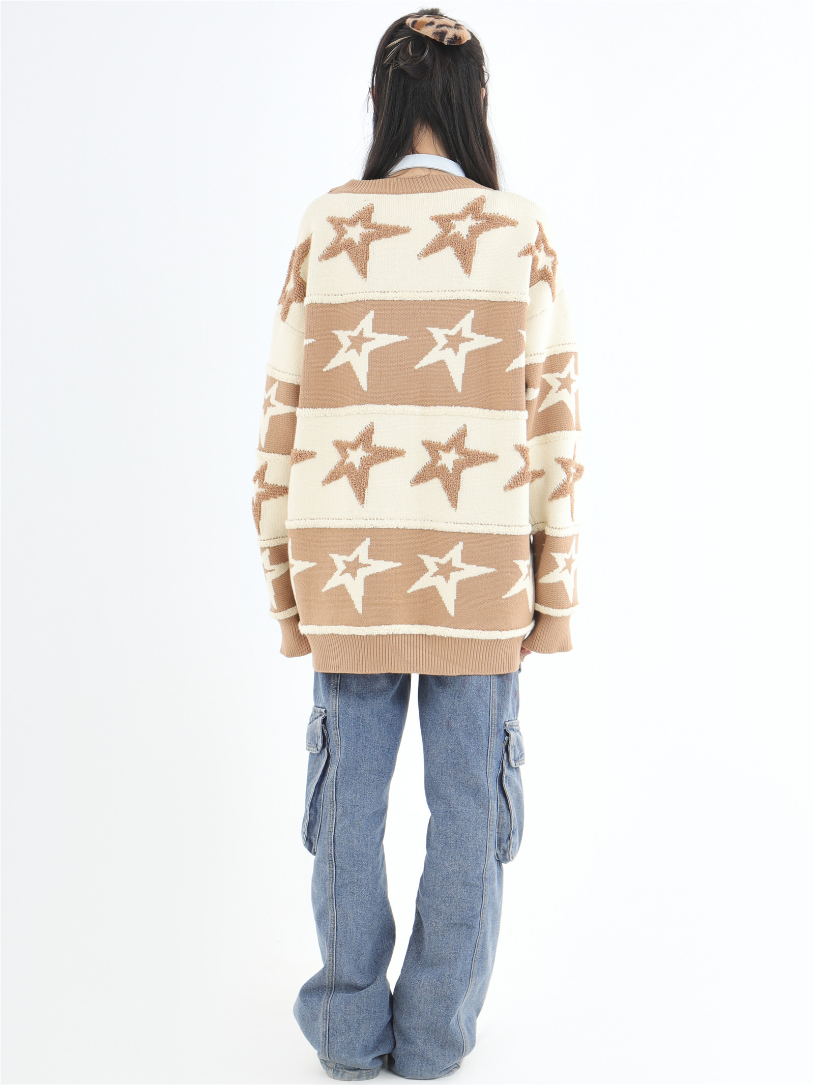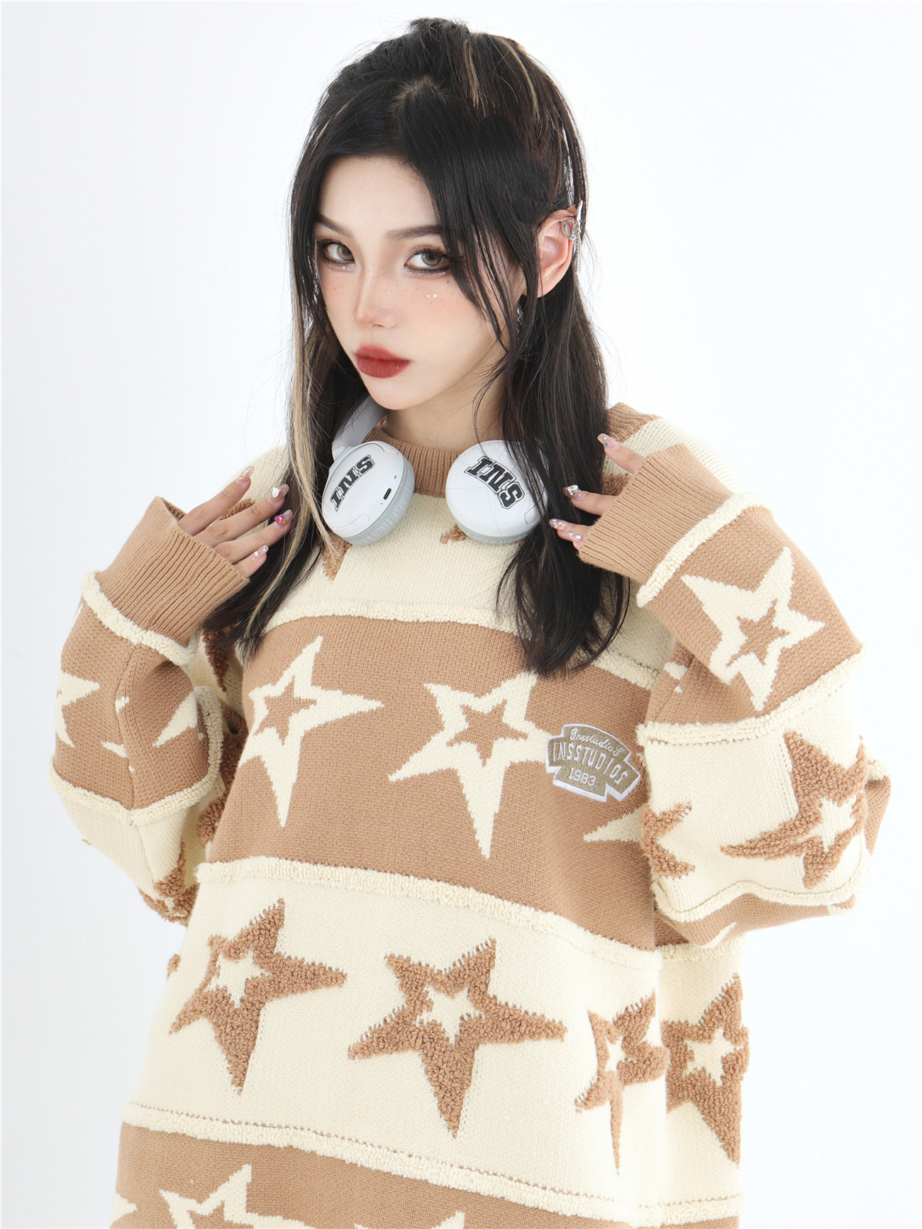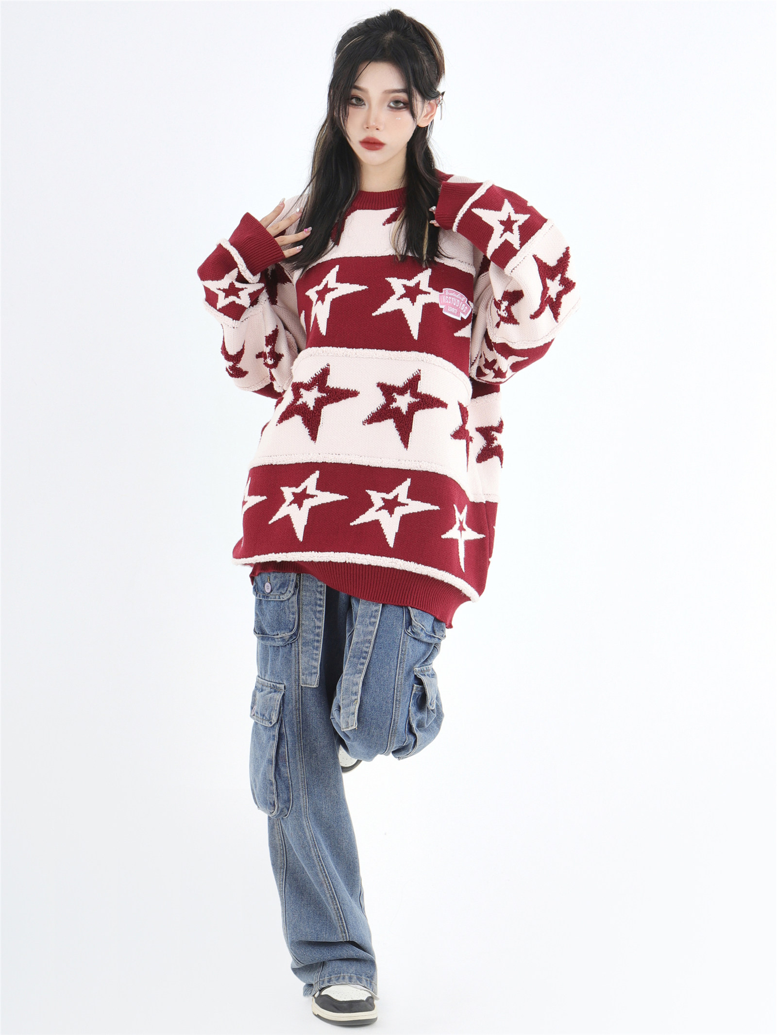 INSstudios 國潮牌情侶美式植絨提花星星條紋套頭毛衣加厚針織衫