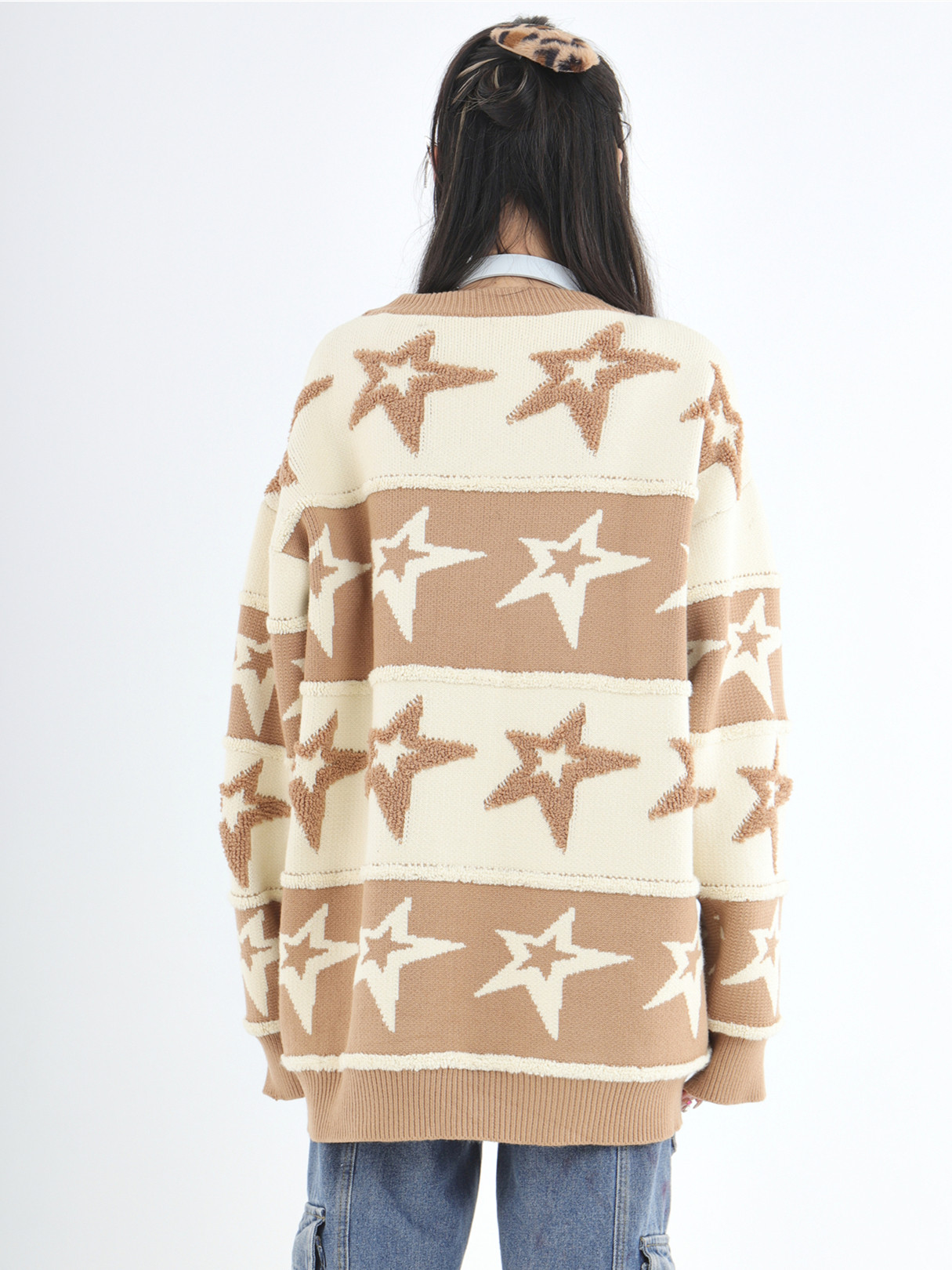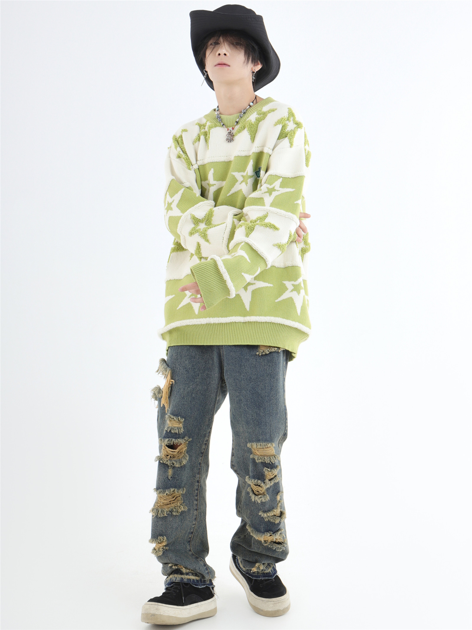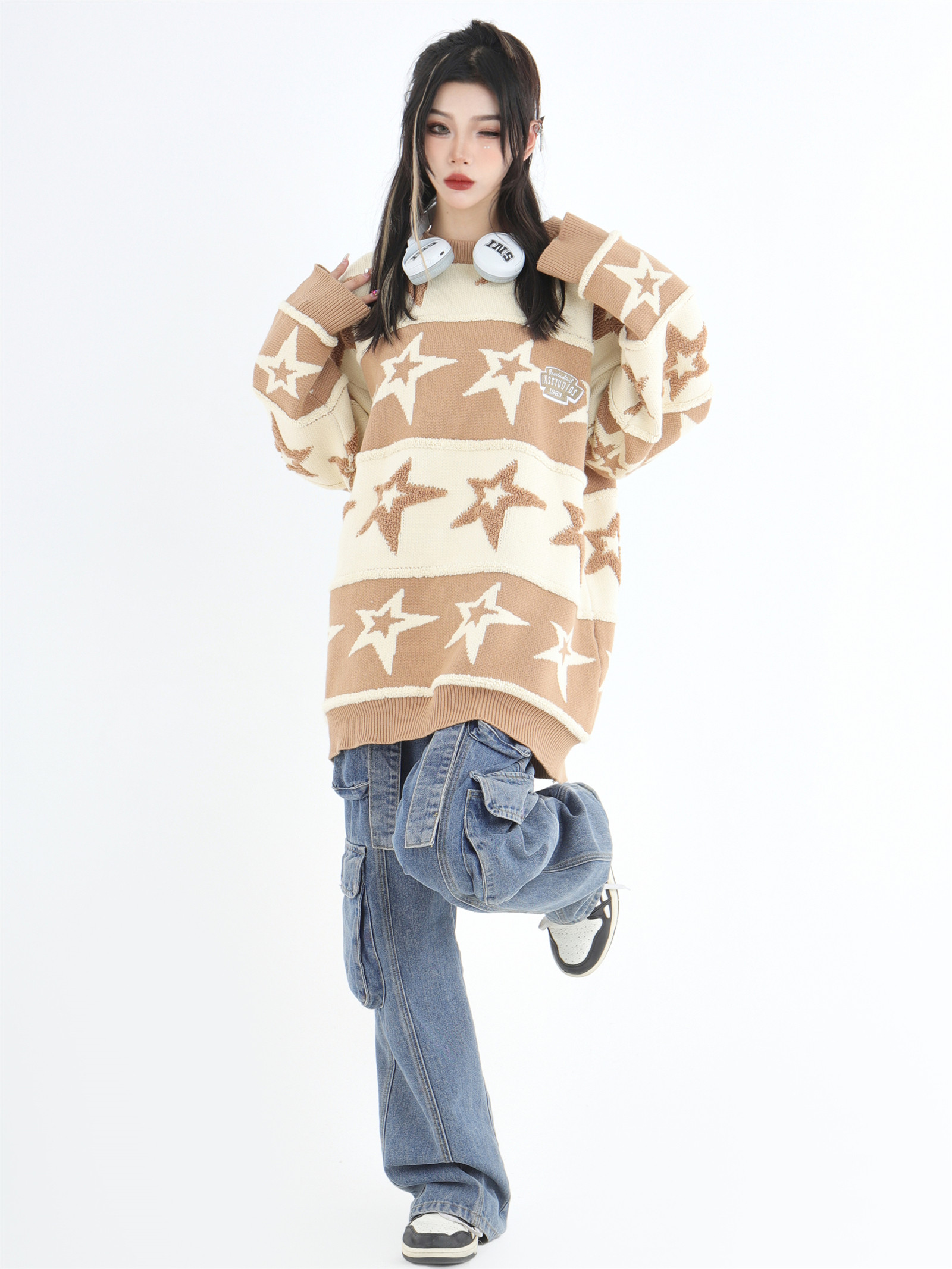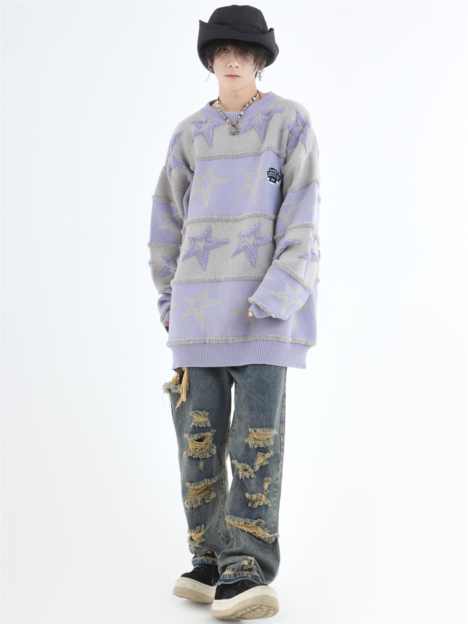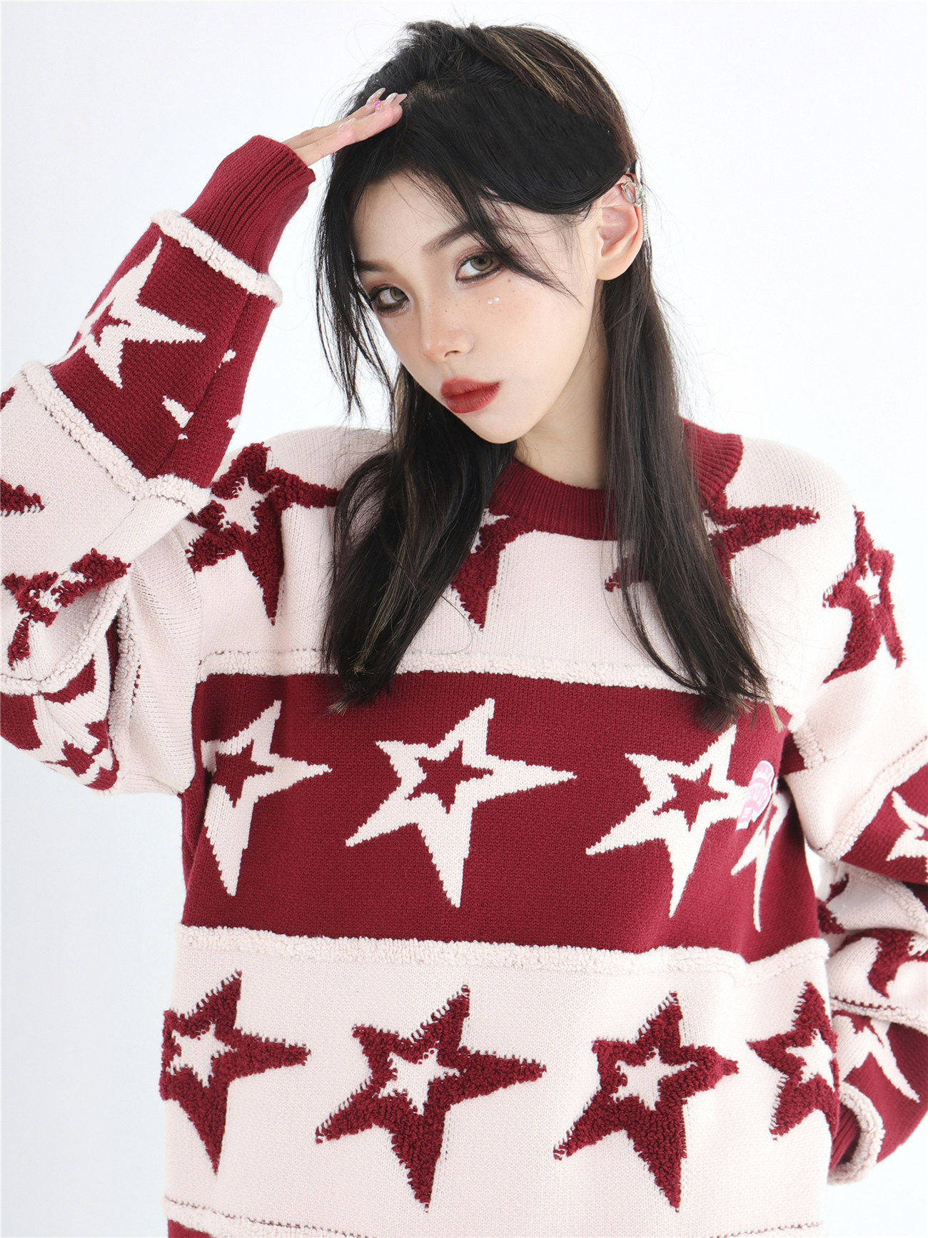 INSstudios 國潮牌情侶美式植絨提花星星條紋套頭毛衣加厚針織衫