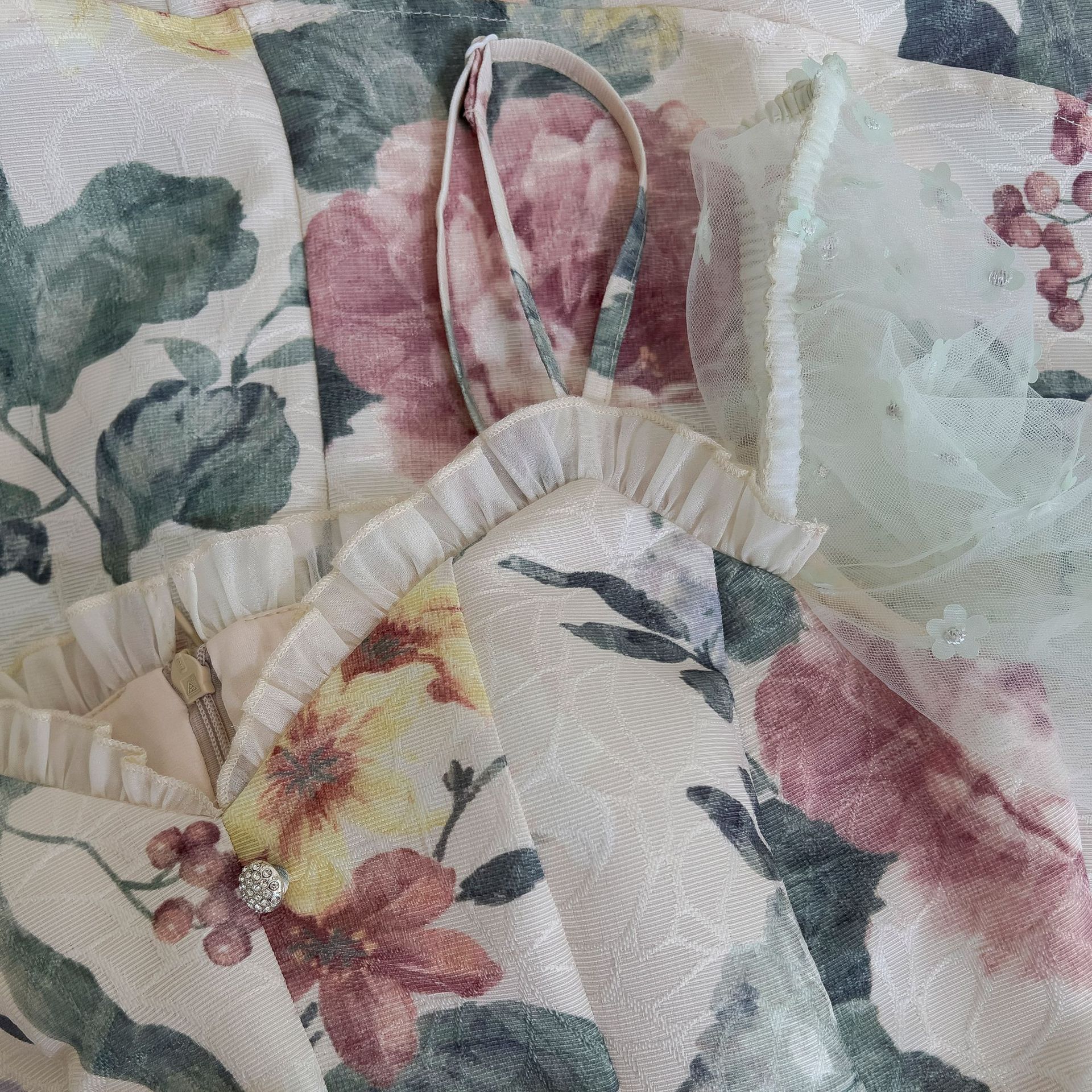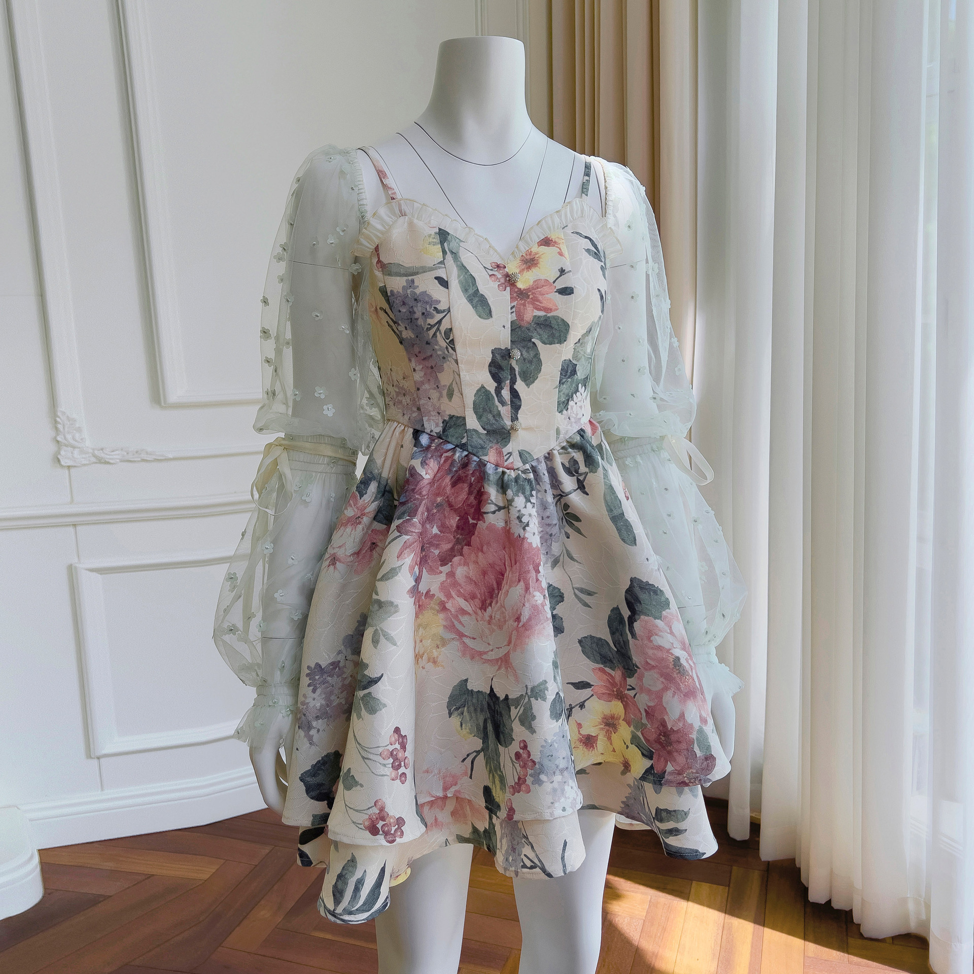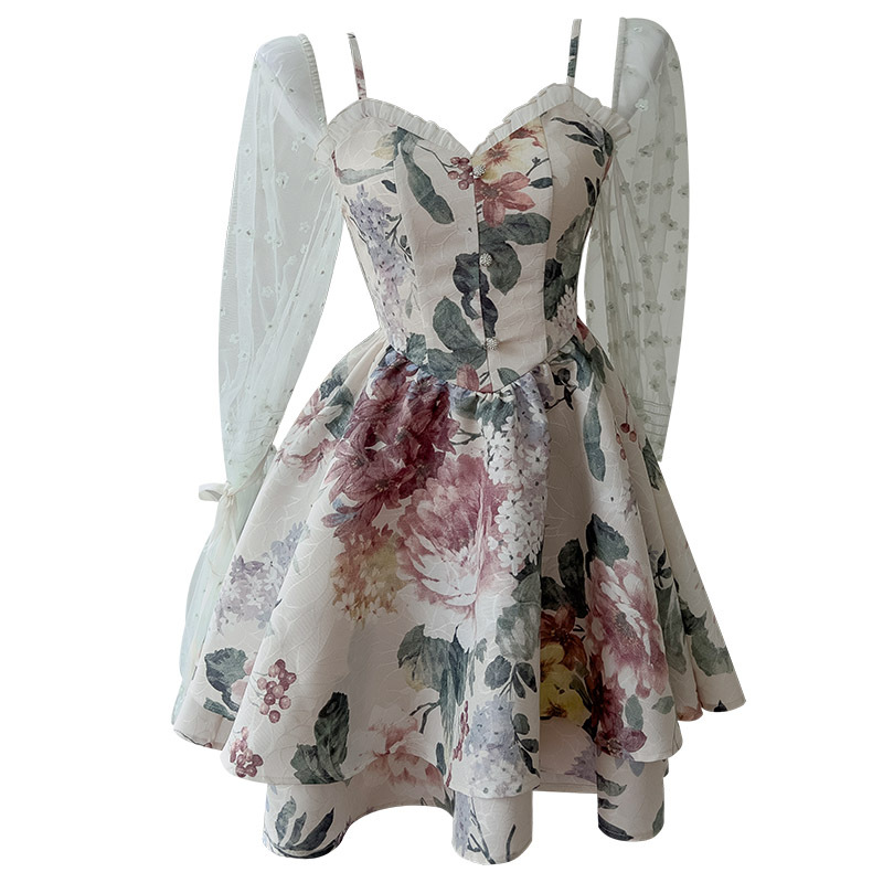 法式碎花喇叭袖抹胸吊带长袖连衣裙小众小个子收腰印花短裙 67887