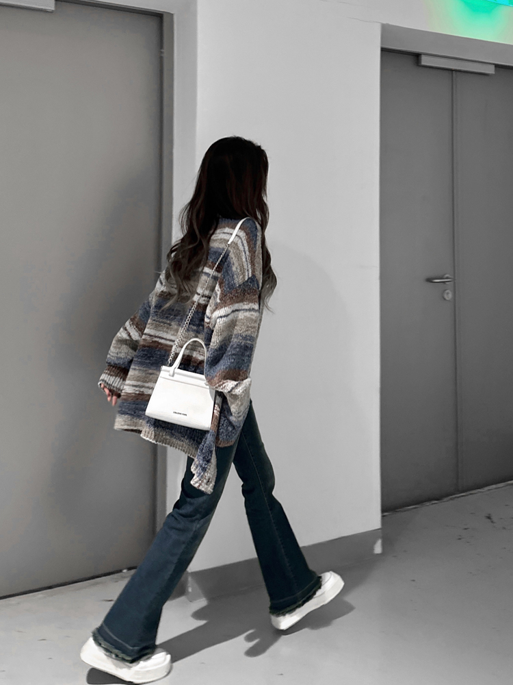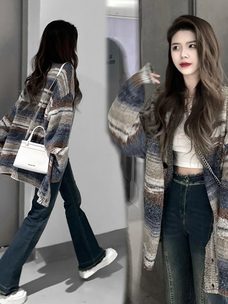 韓版撞色條紋開襟外套毛衣外套女秋冬薄款設計感小眾寬鬆慵懶針織上衣