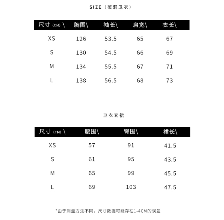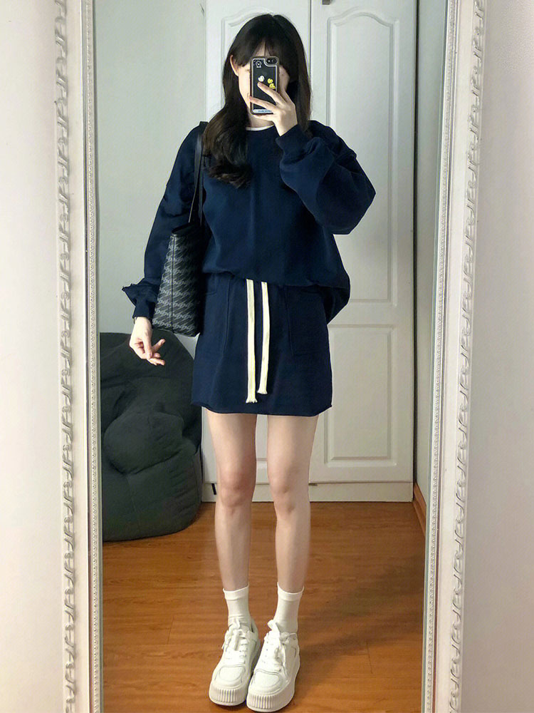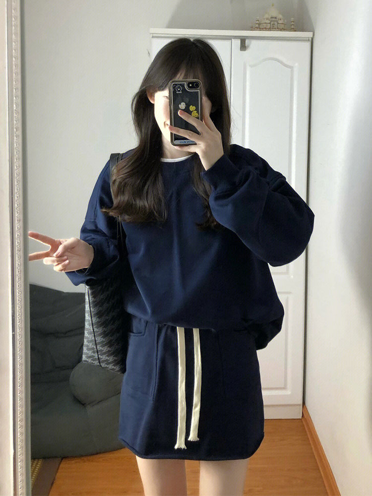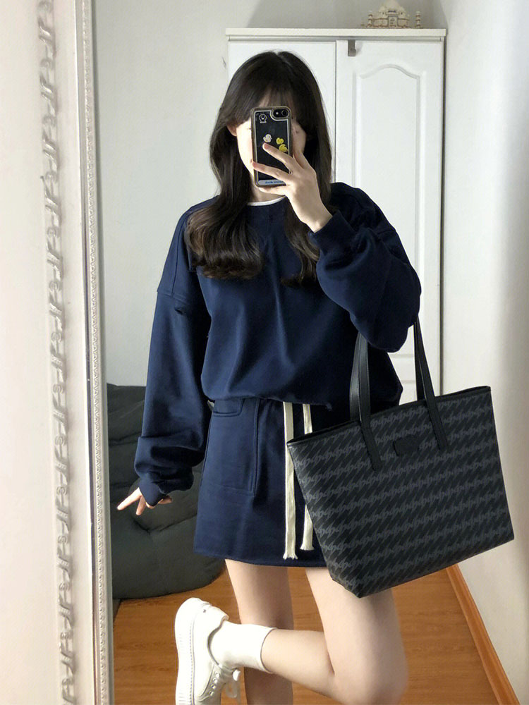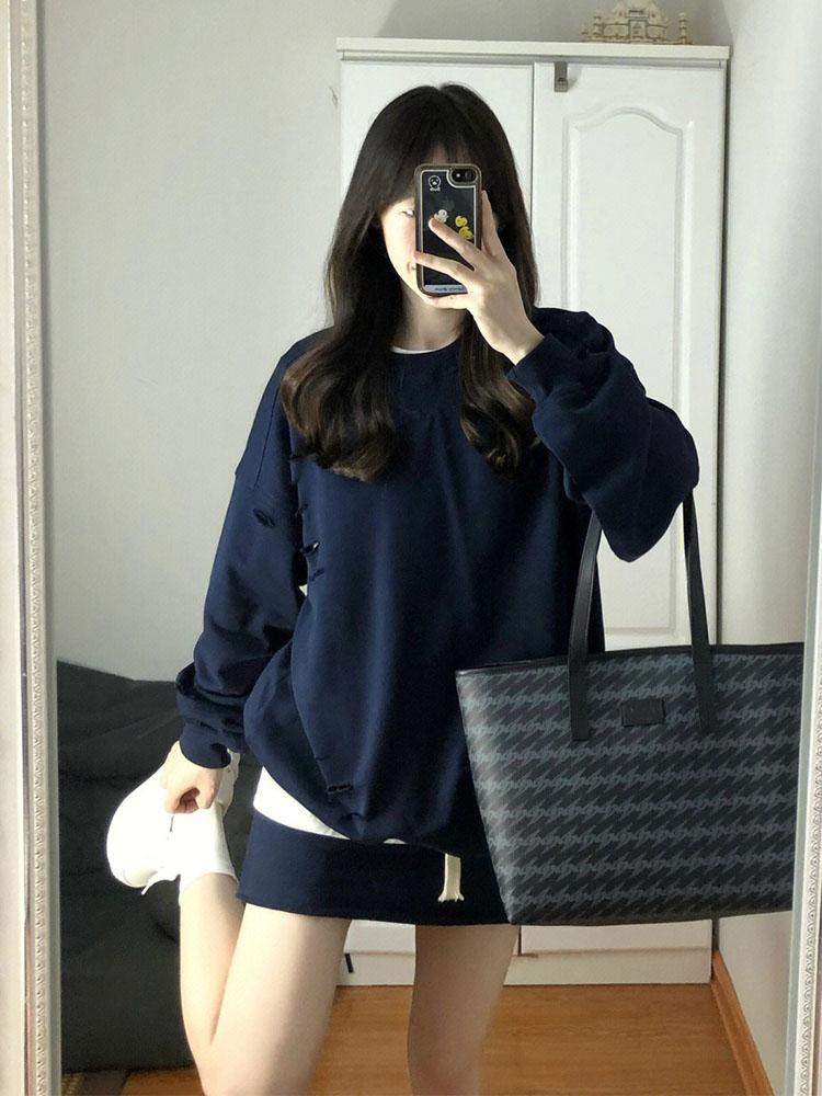 aaaaxbbb 遊廊海域 懶人時尚破洞衛衣高腰藏青色半身裙早秋套裝女