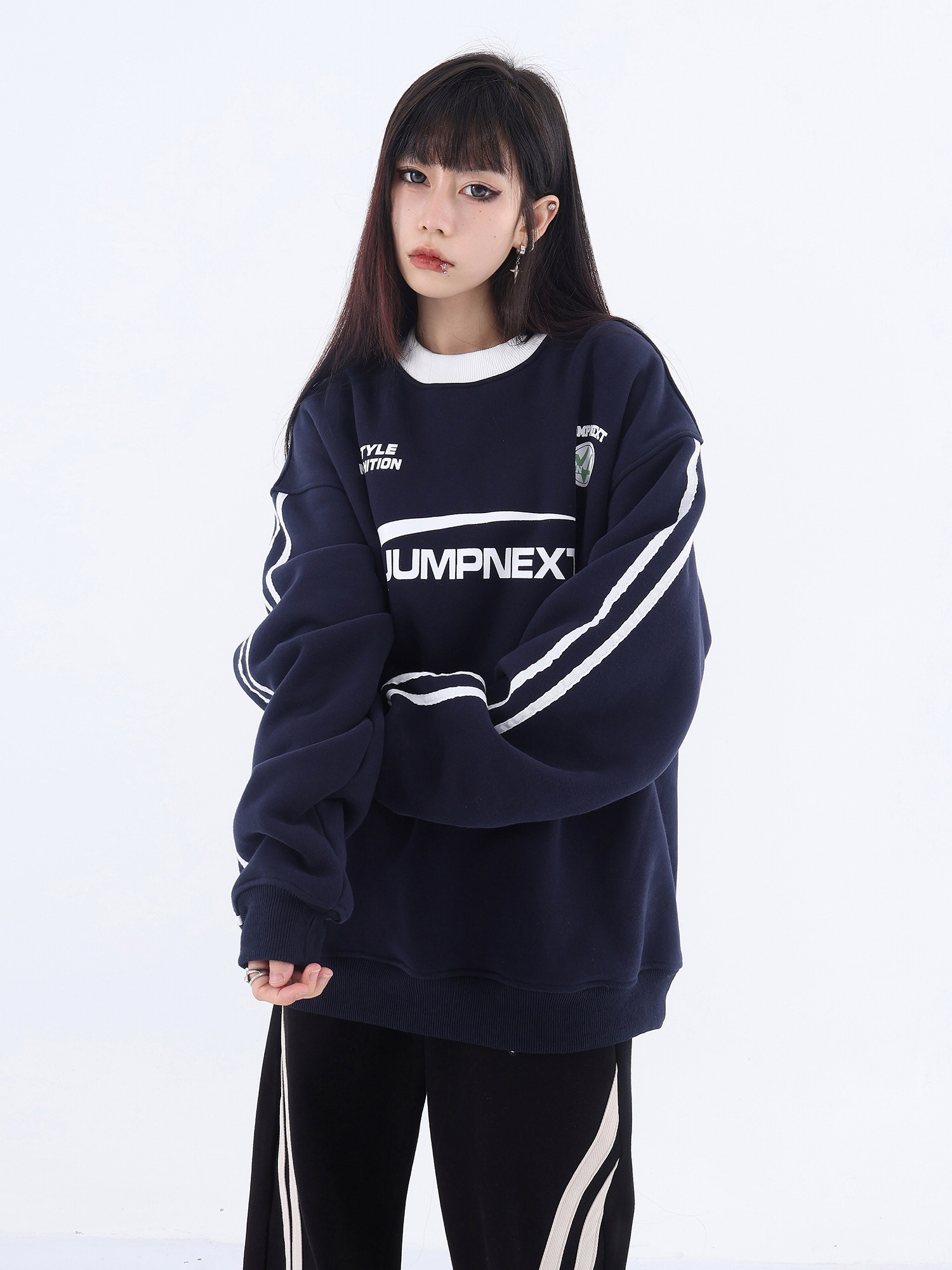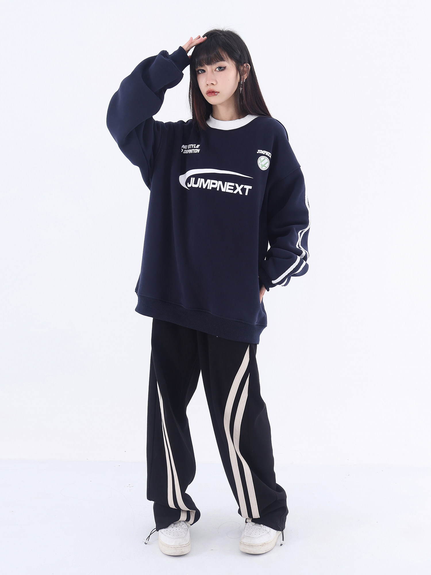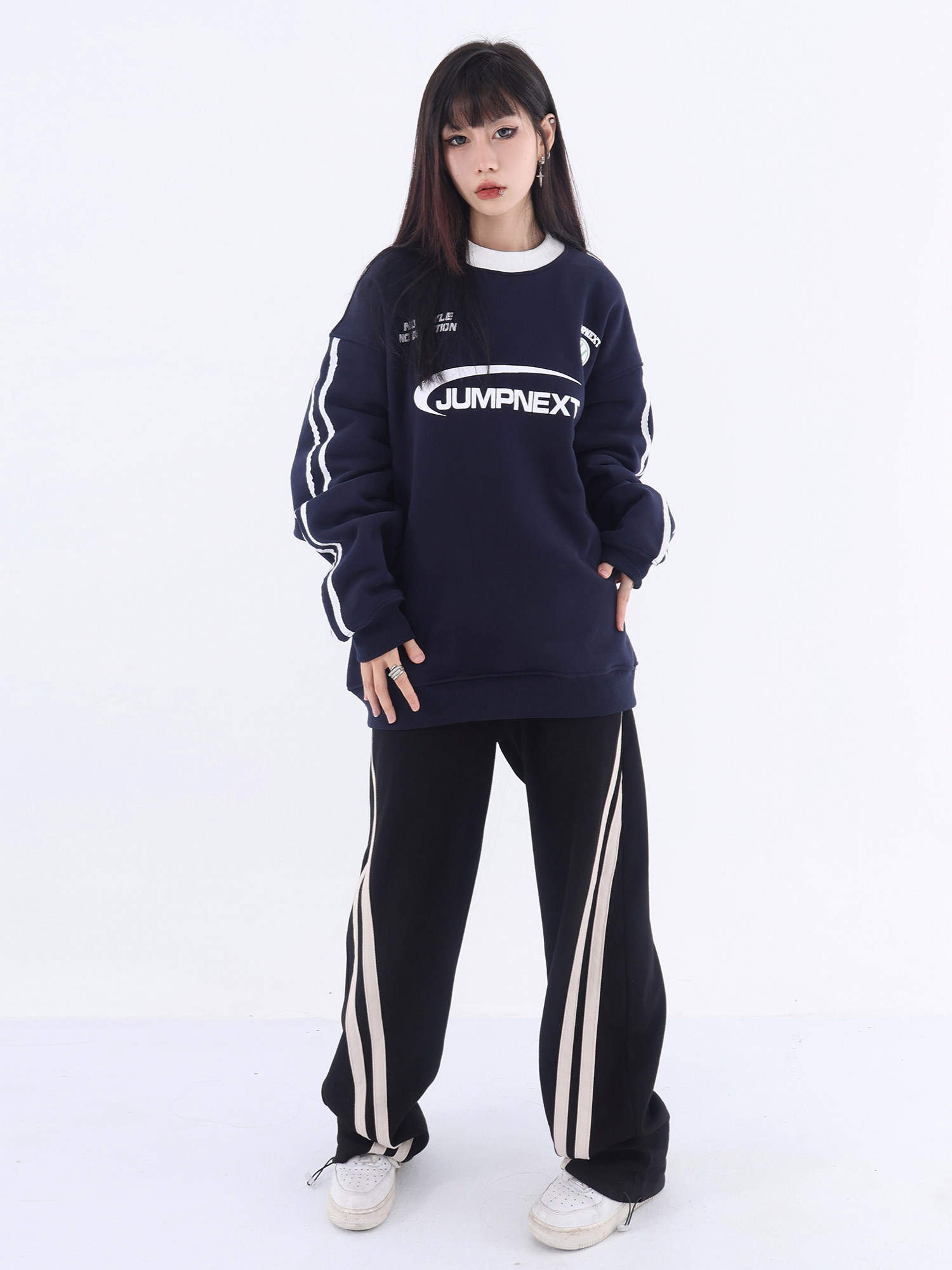 JUMPNEXT國潮牌美式復古運動風字母印花圓領加絨情侶寬鬆套頭休閒上衣