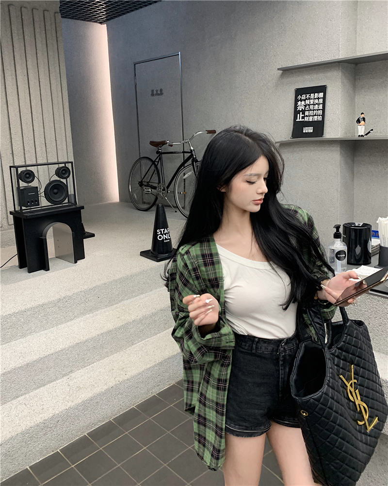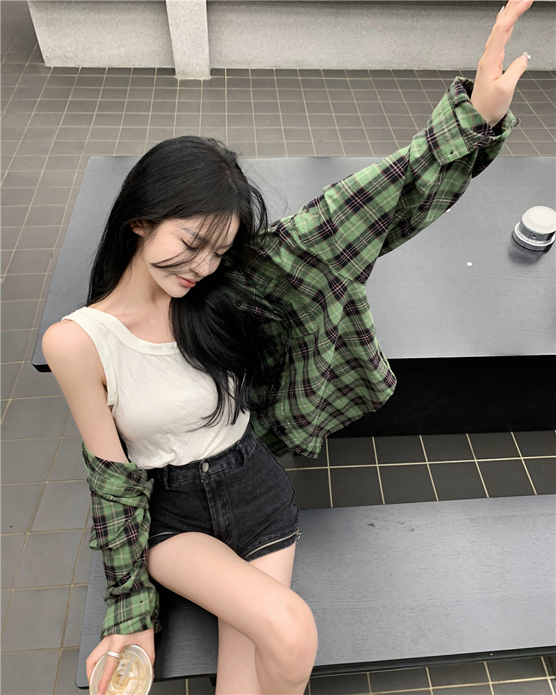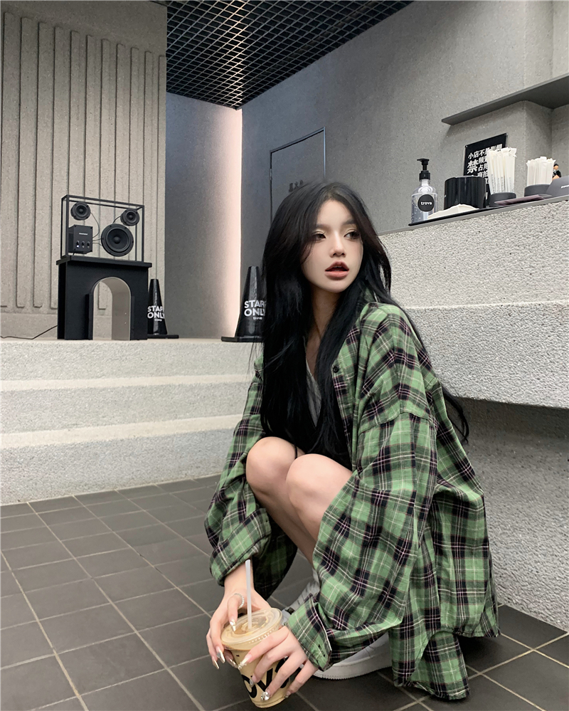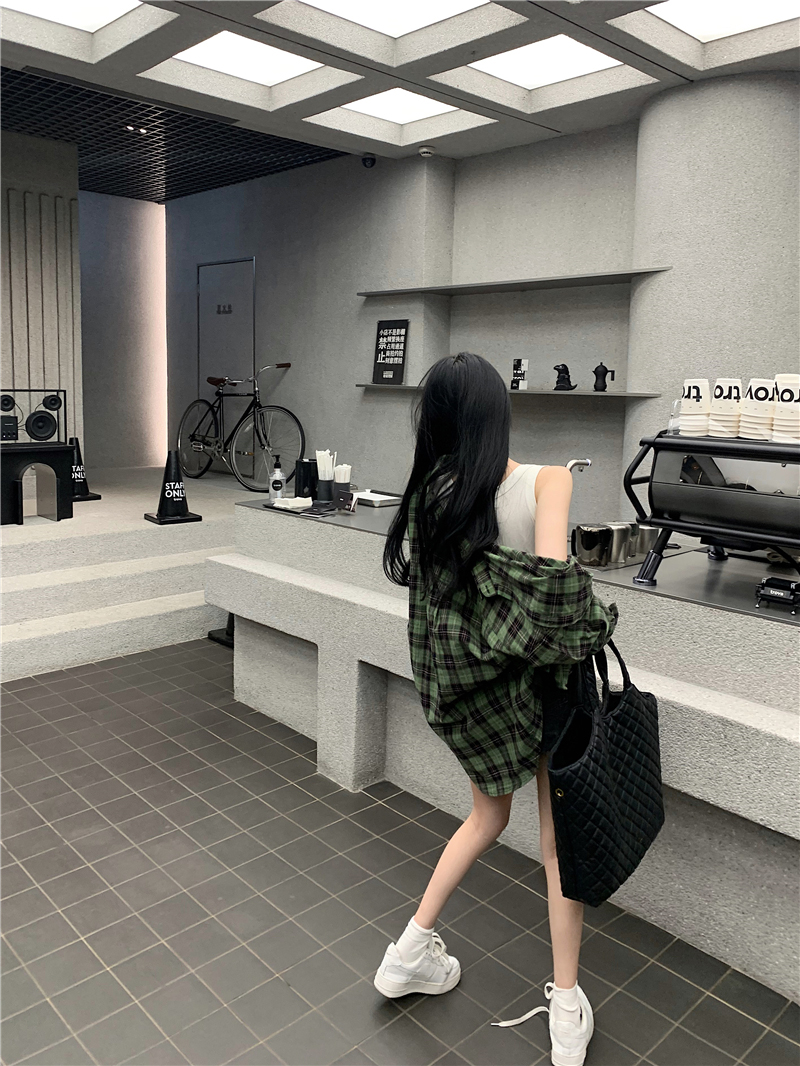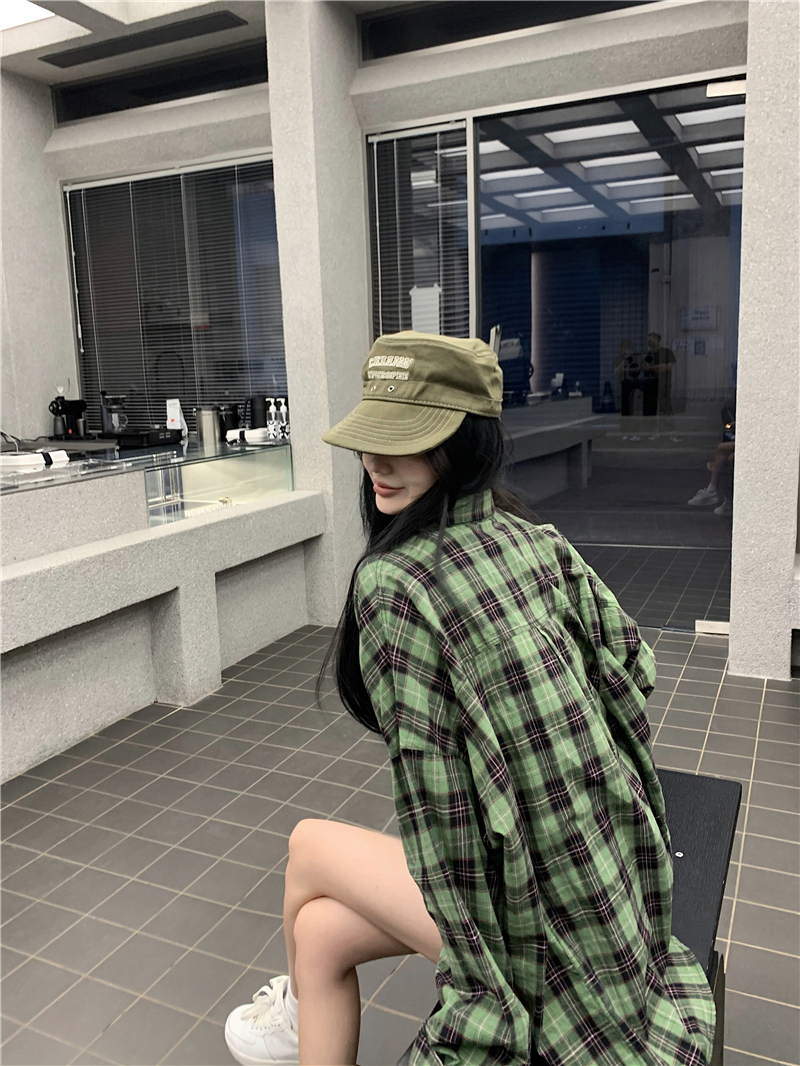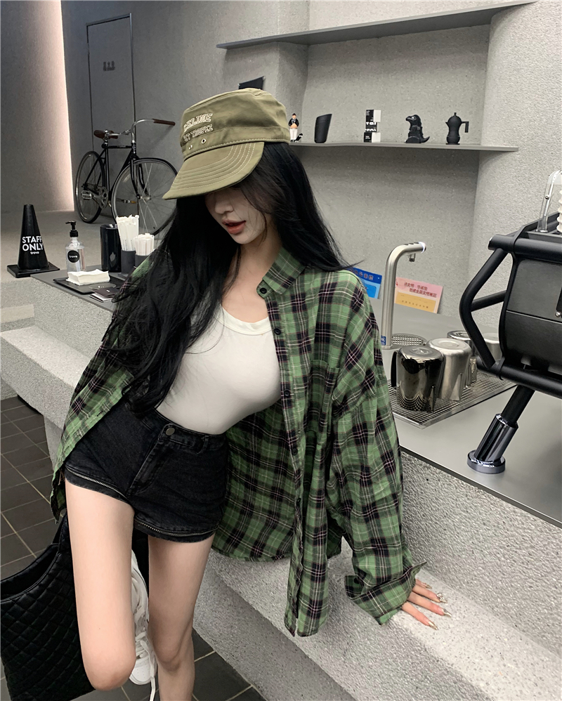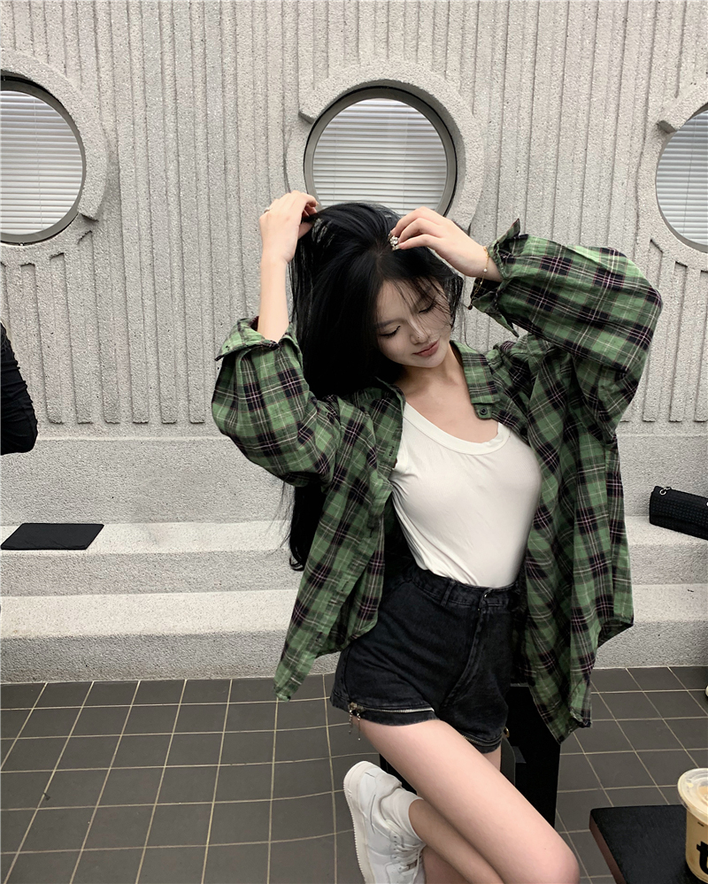 韓版polo領格子長袖襯衫女裝秋季綠色薄款寬鬆中長版防曬外套上衣
