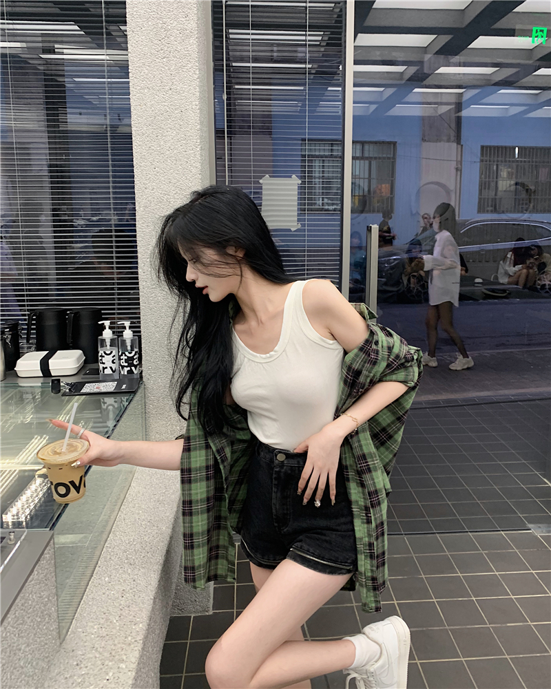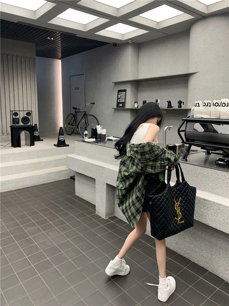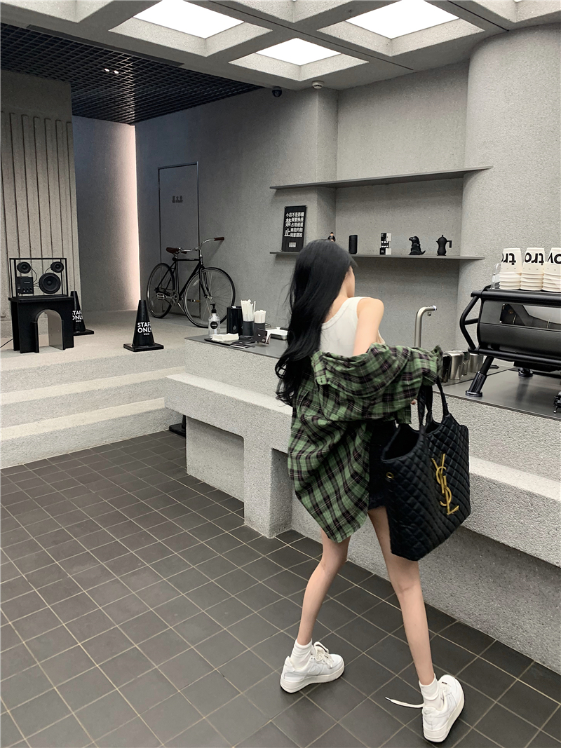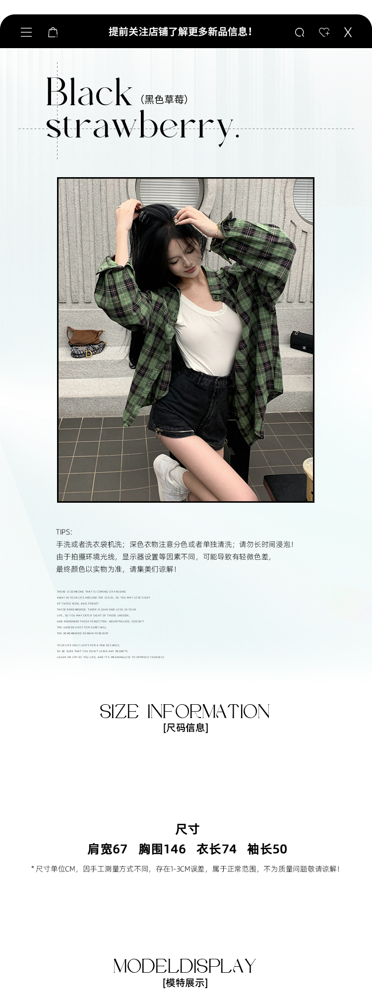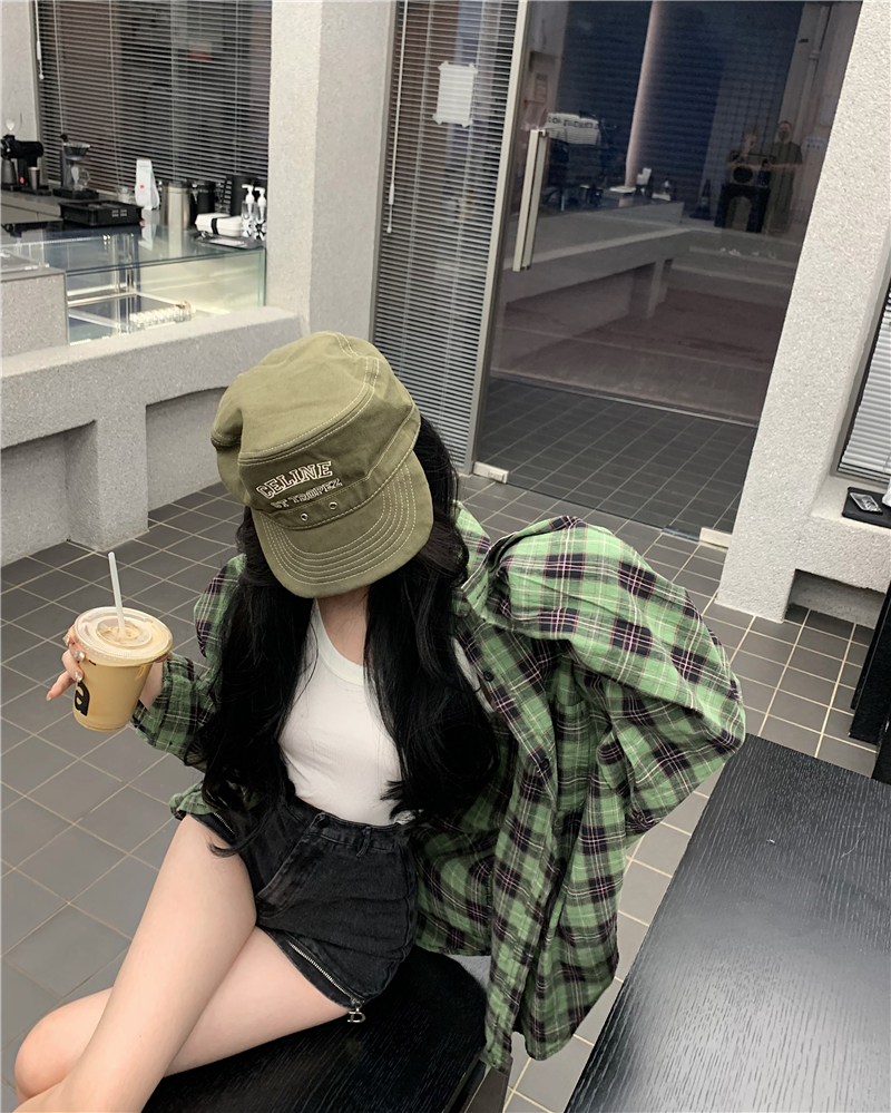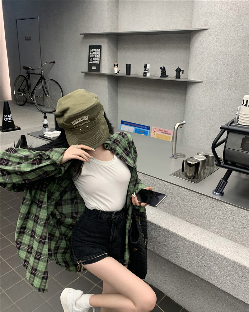 韓版polo領格子長袖襯衫女裝秋季綠色薄款寬鬆中長版防曬外套上衣
