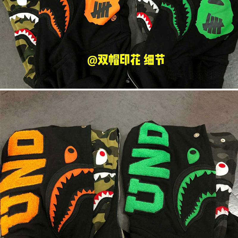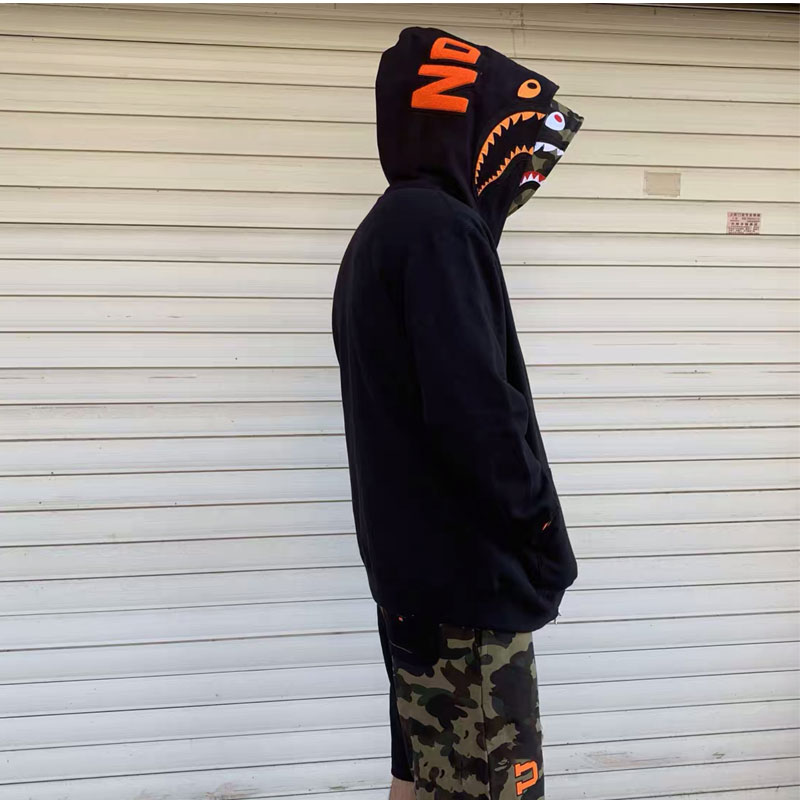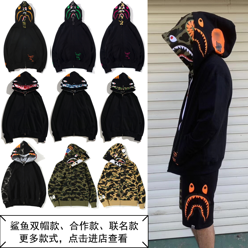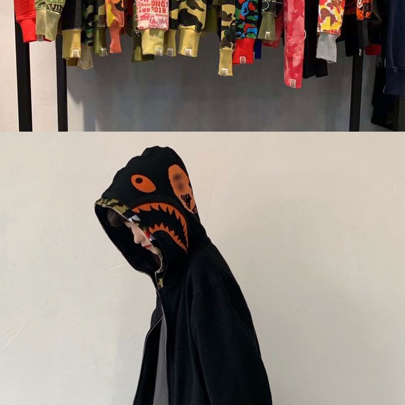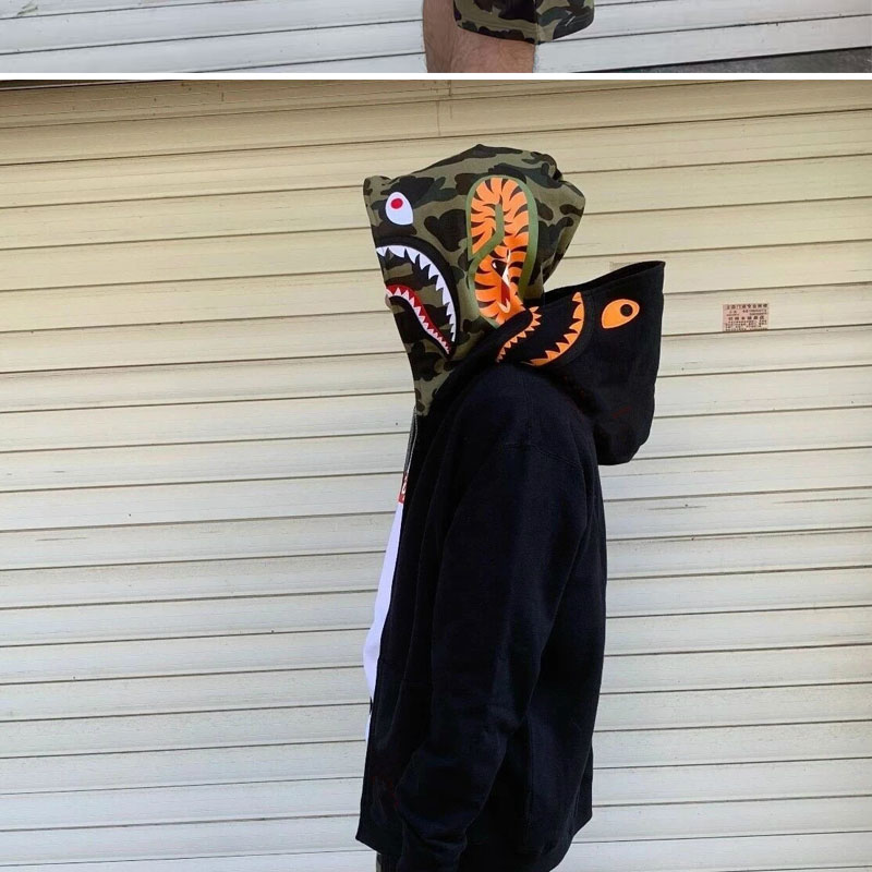 ins鯊魚雙帽外套連帽運動衫迷彩開衫寬鬆情侶男女學生潮牌夜光猿人