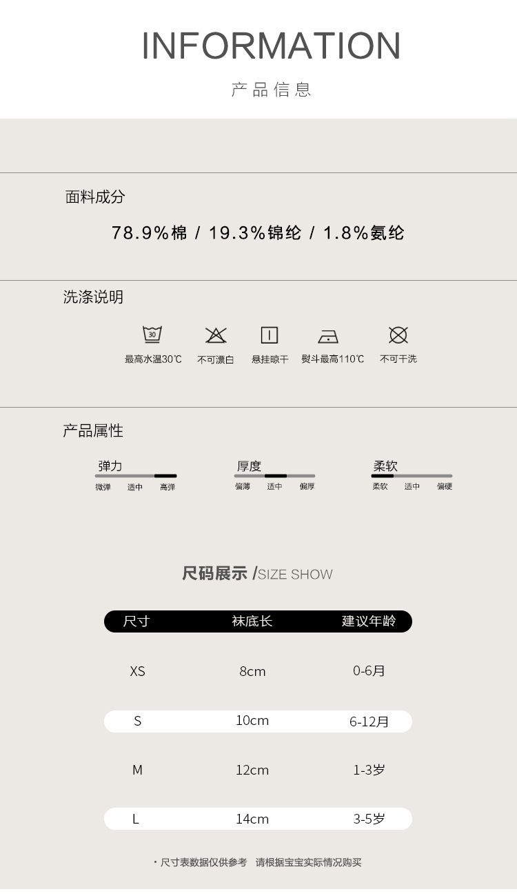 童袜尺码 XS码0-6个月,S码6-12个月,M码1-3岁,L码3-5岁