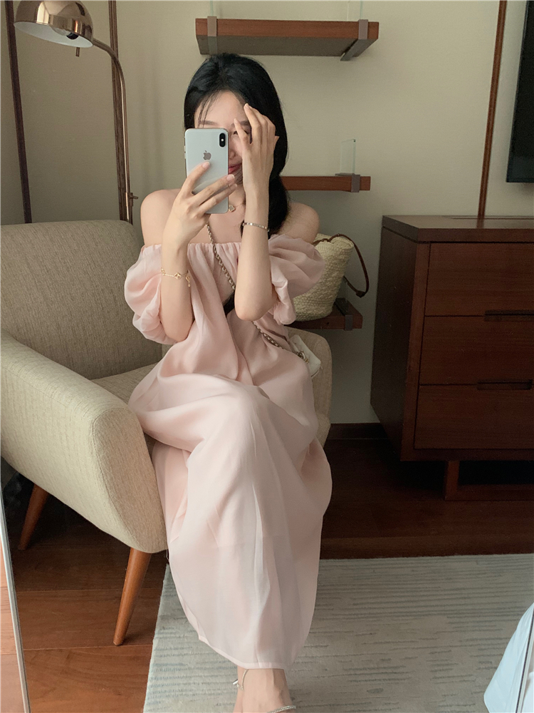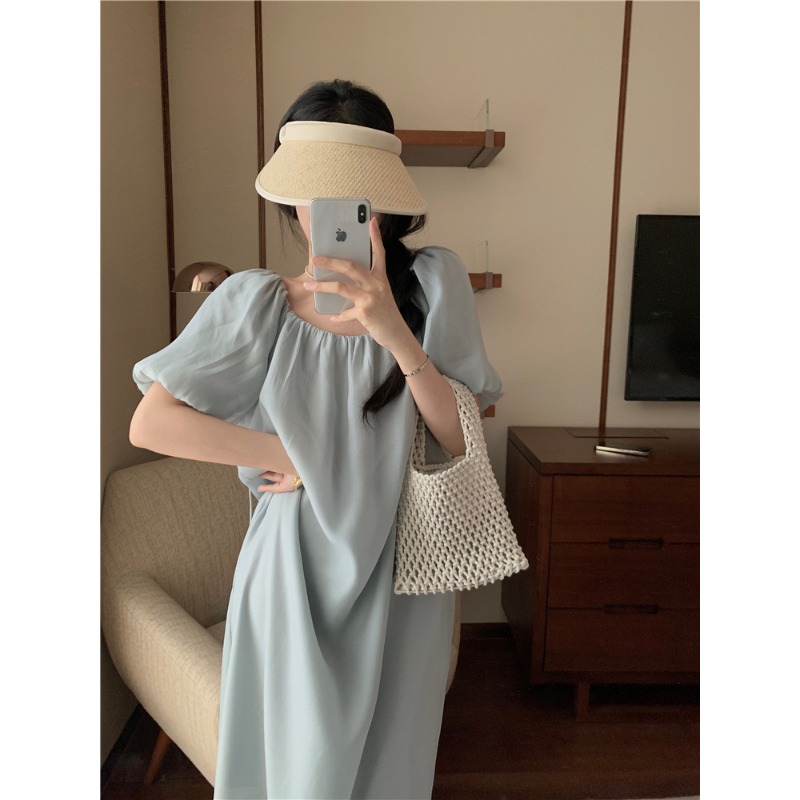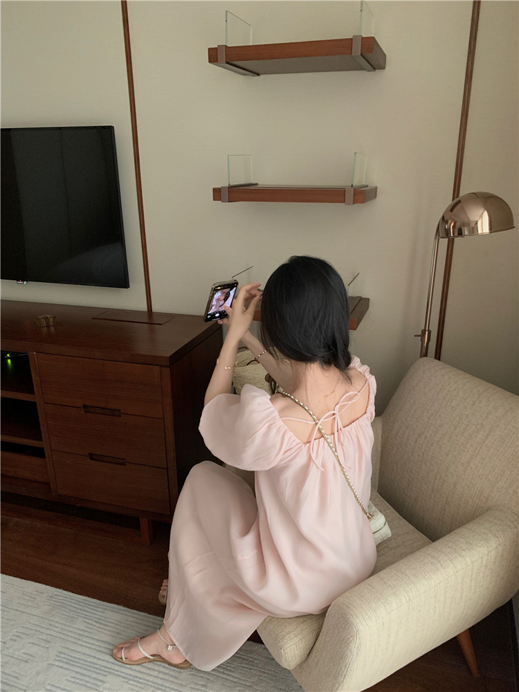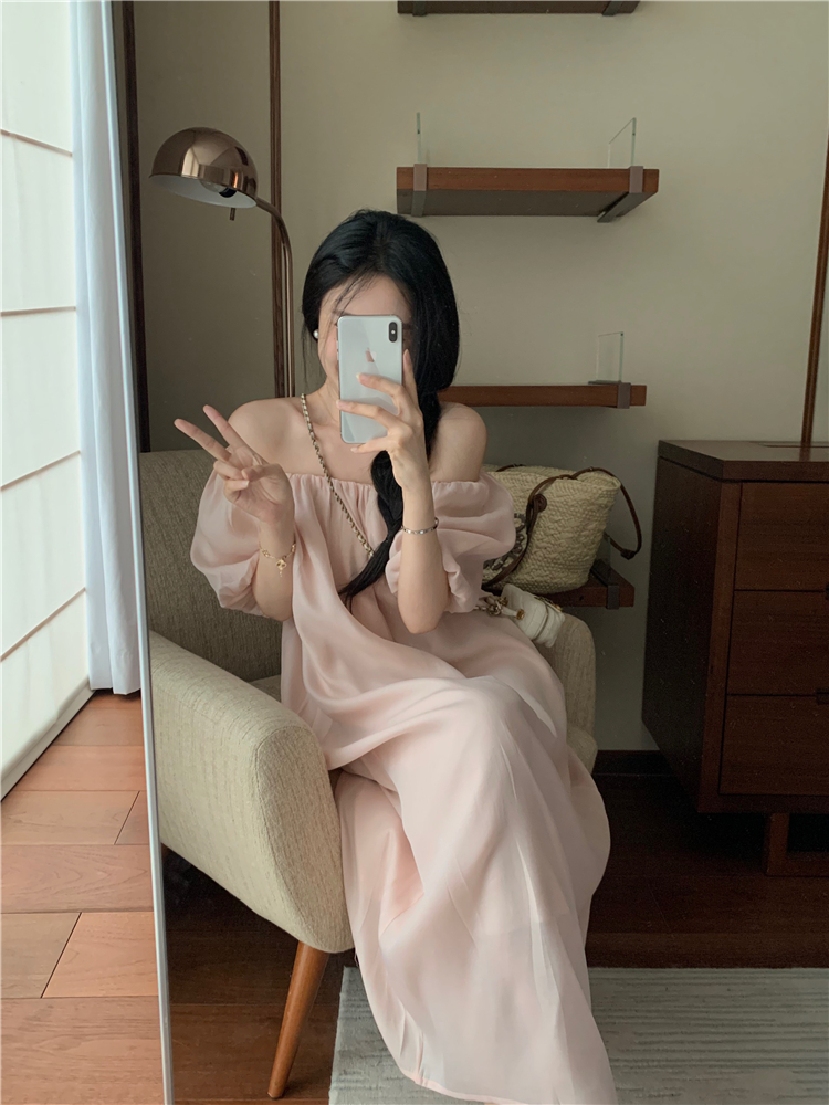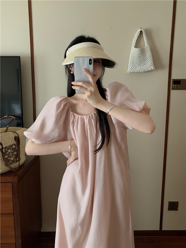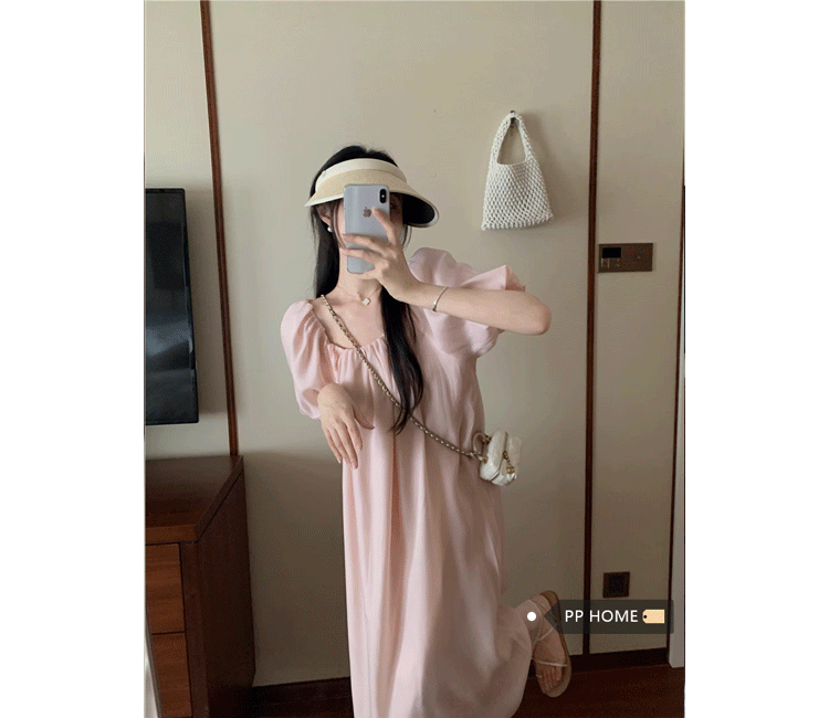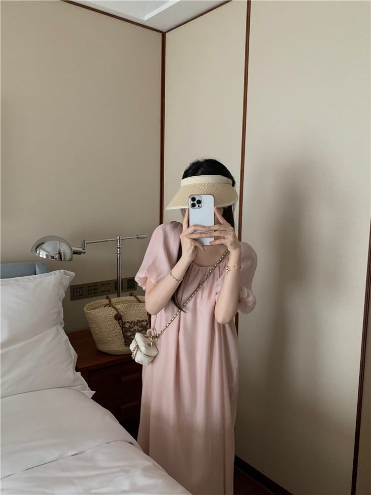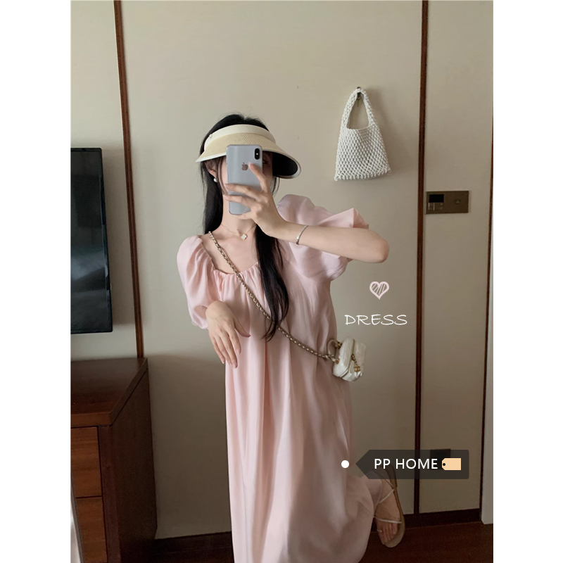 PPHOME白霧甜桃~氣質潮仙氣洋裝韓版圓領收腰設計顯瘦通勤長裙