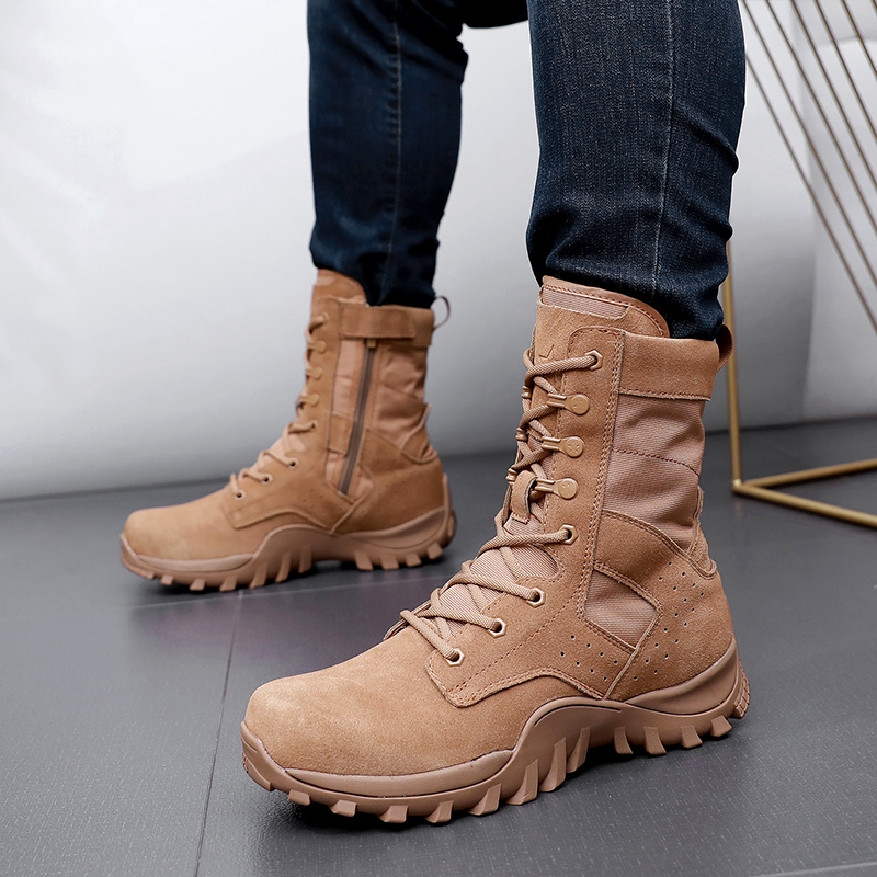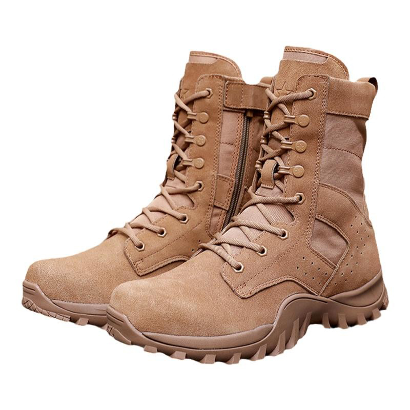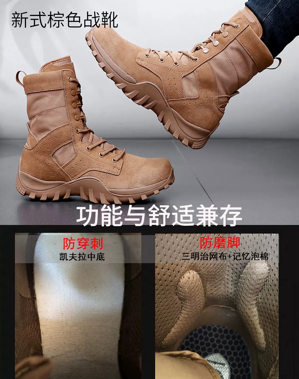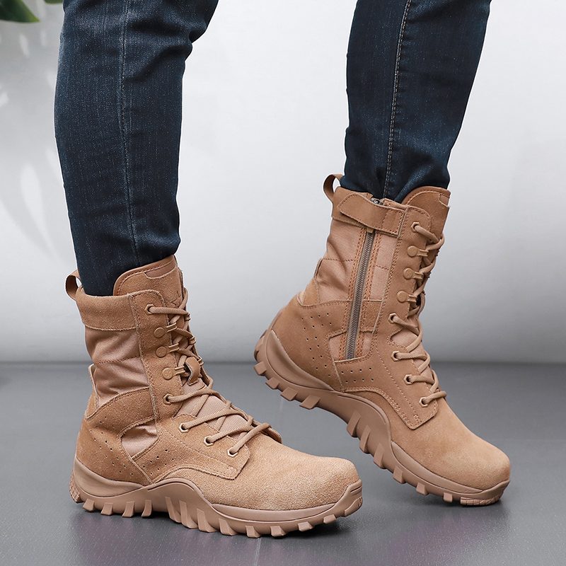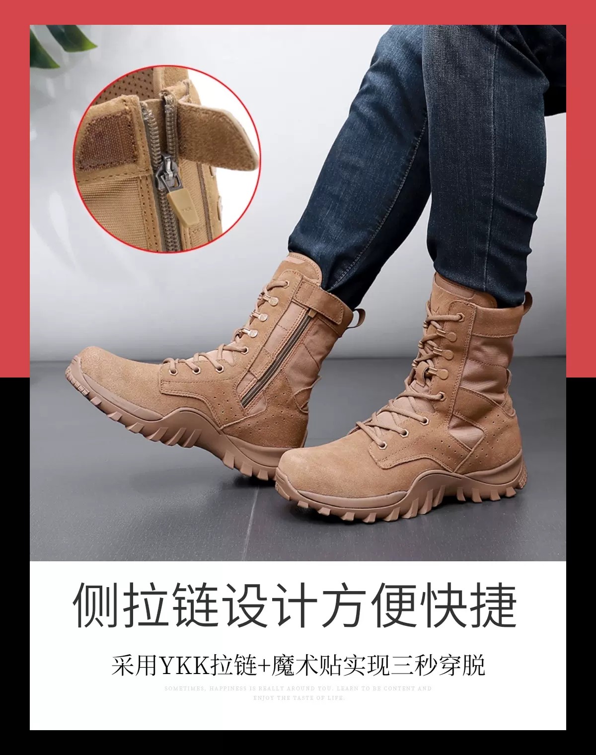 新款君洛克棕色防刺拉鍊作戰靴男女高筒輕便戰術戶外登山沙漠靴