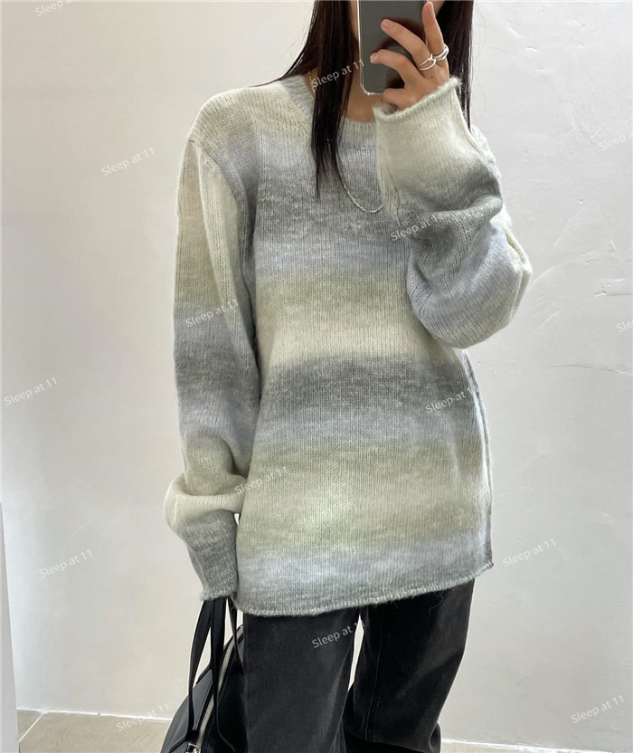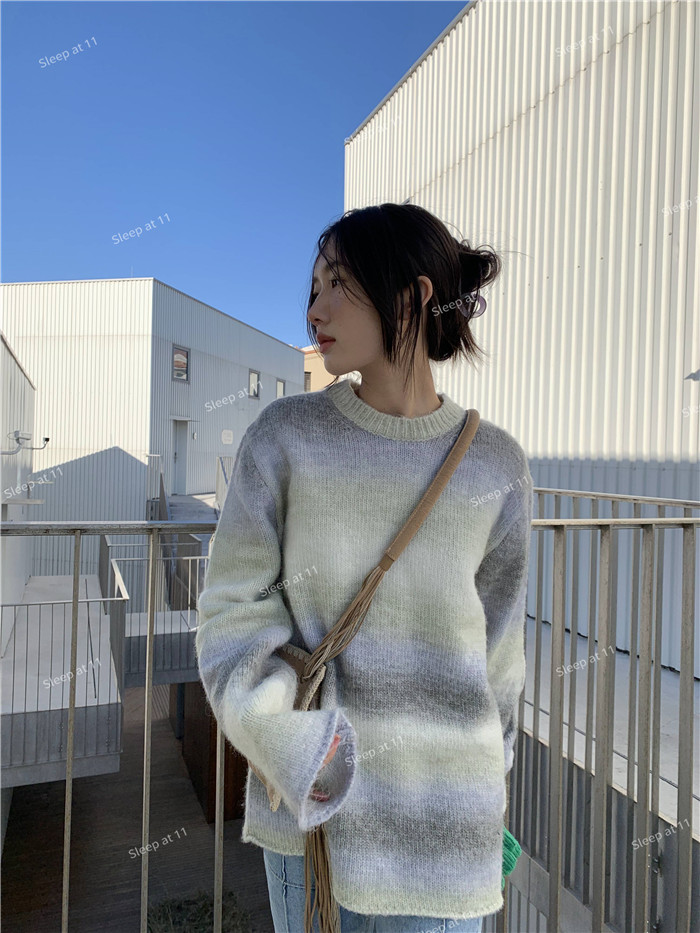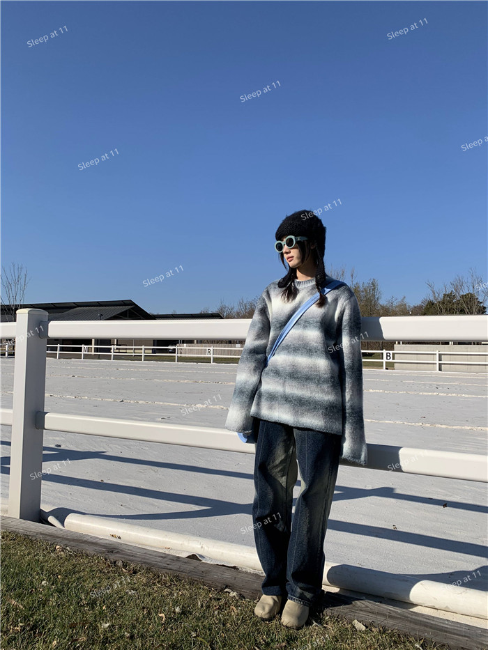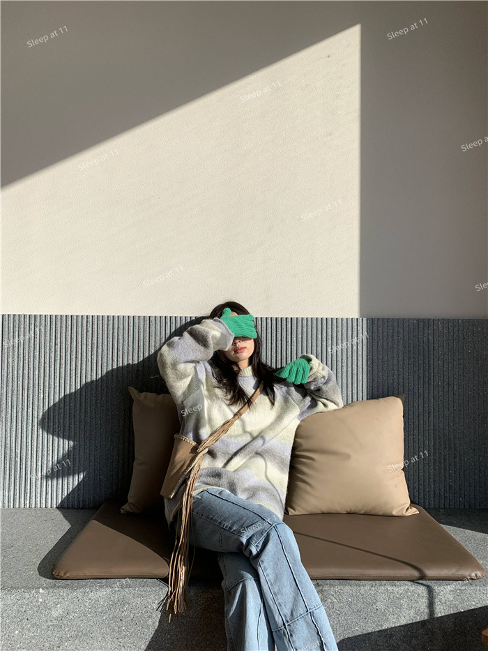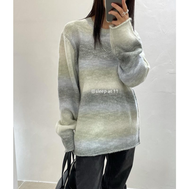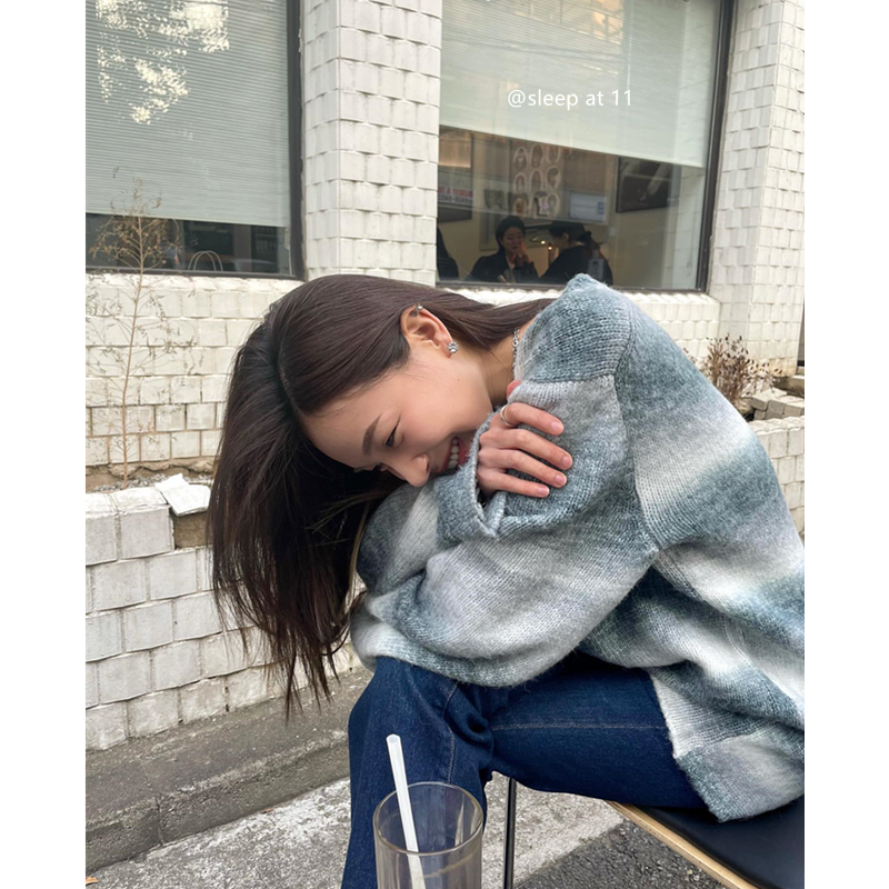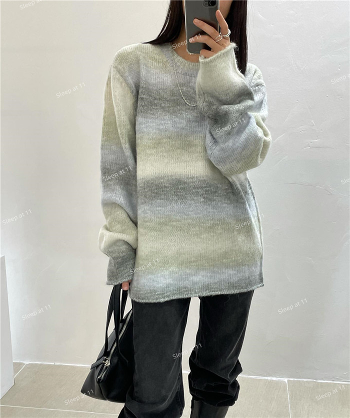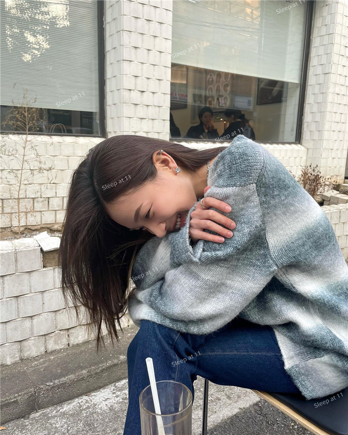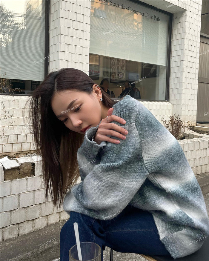 sleep at 11變身韓劇溫柔女主 慵懶個性漸層寬鬆舒適條紋圓領毛衣