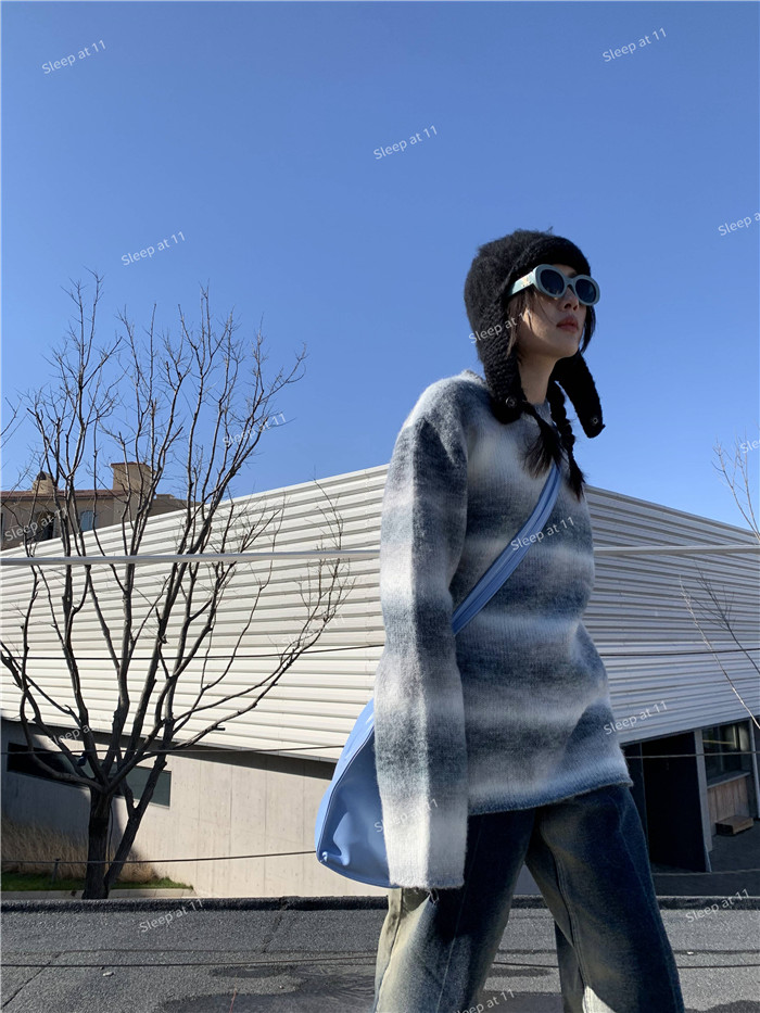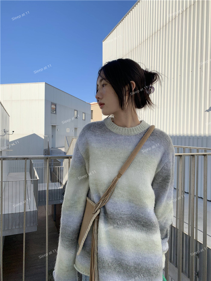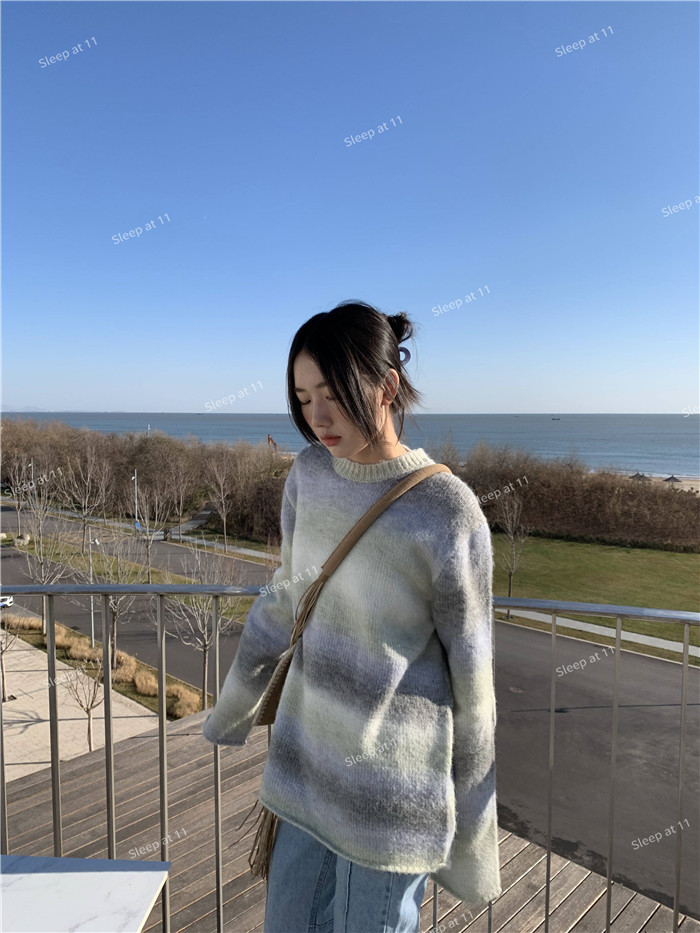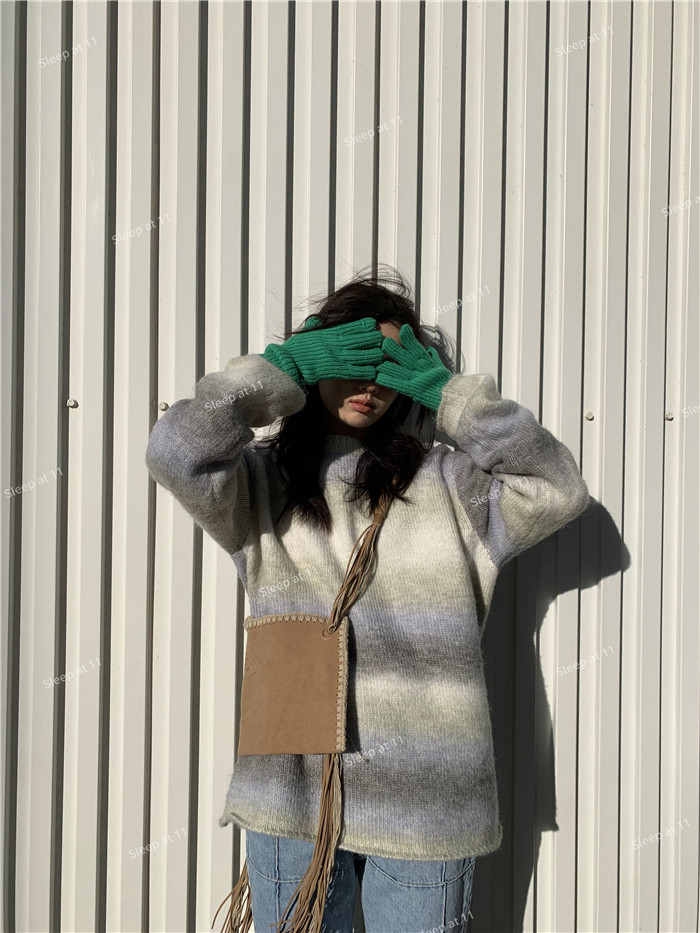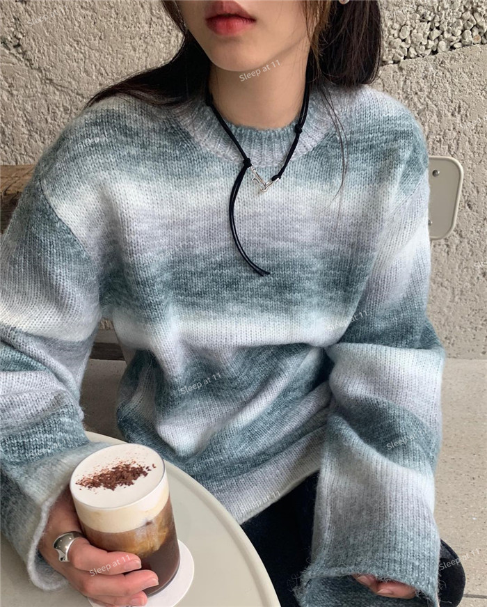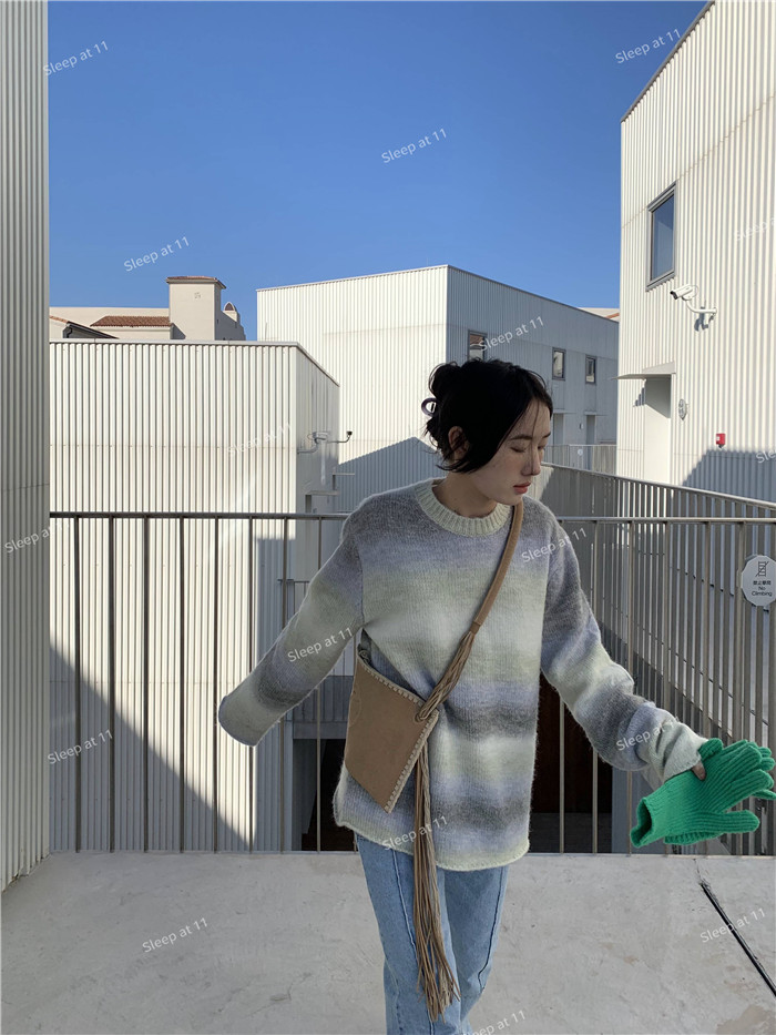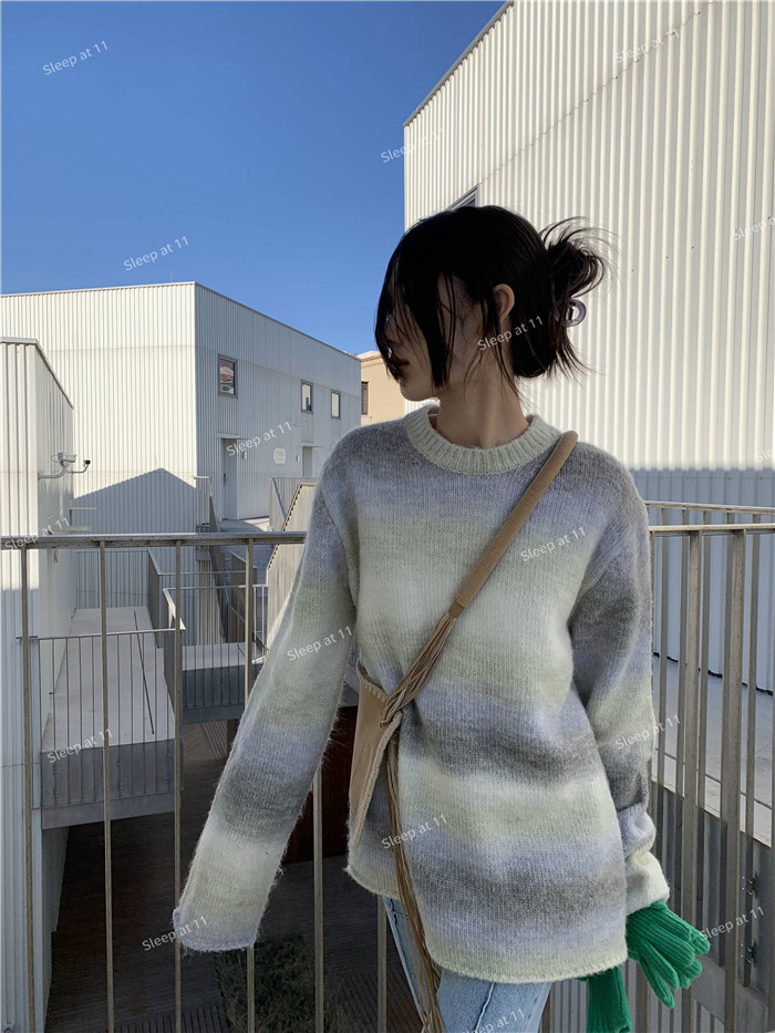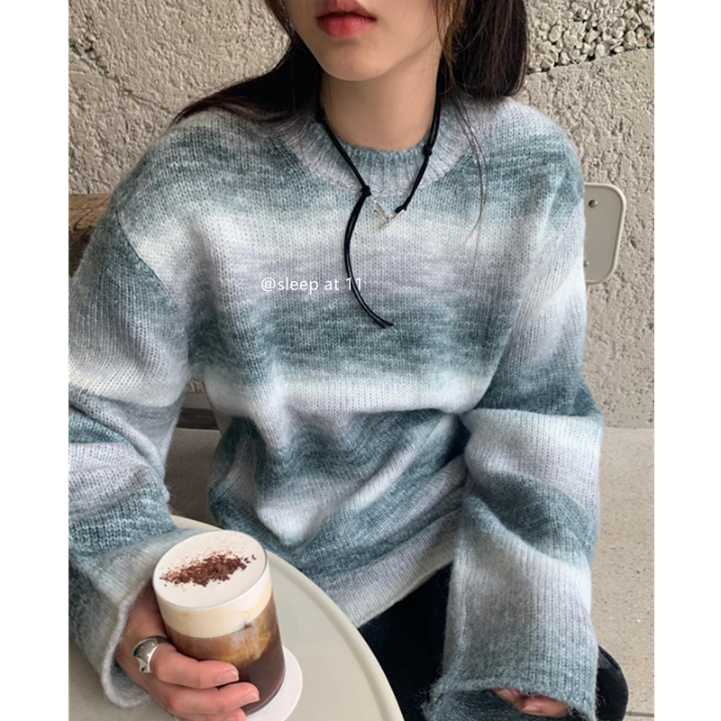 sleep at 11變身韓劇溫柔女主 慵懶個性漸層寬鬆舒適條紋圓領毛衣