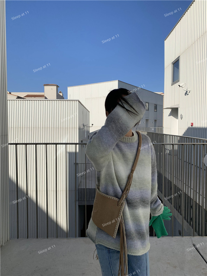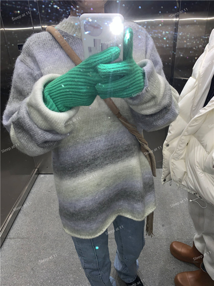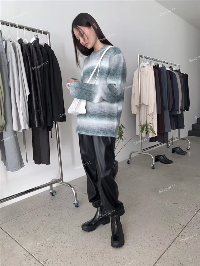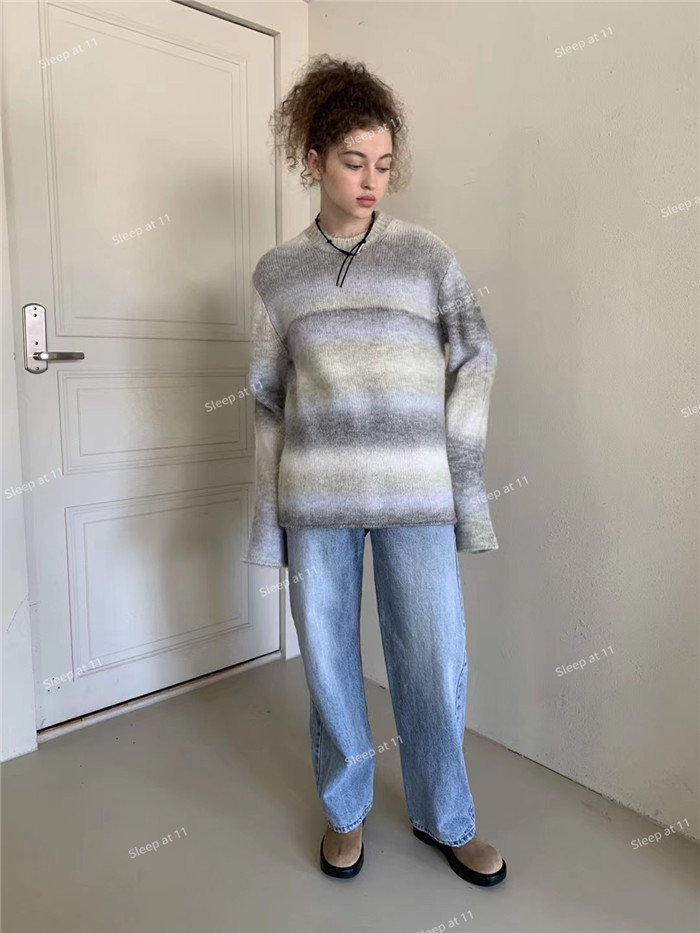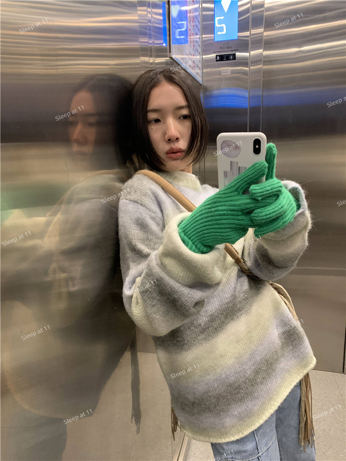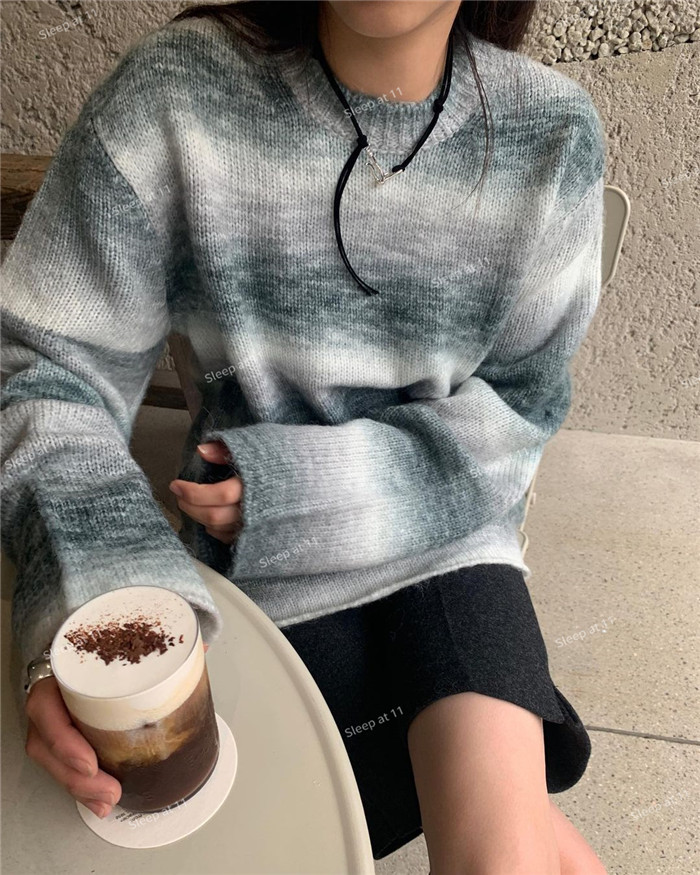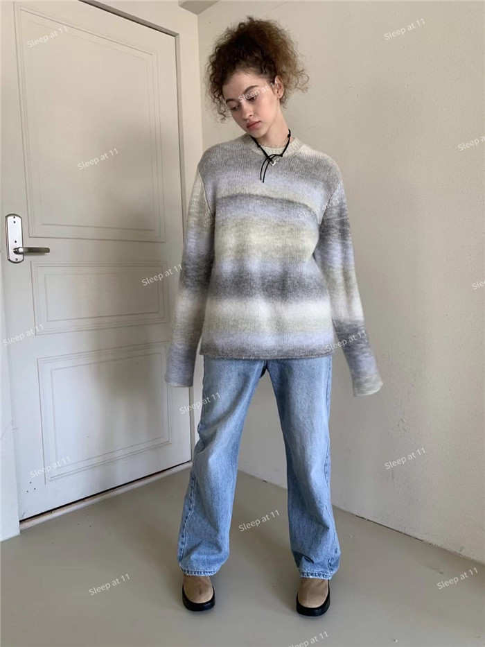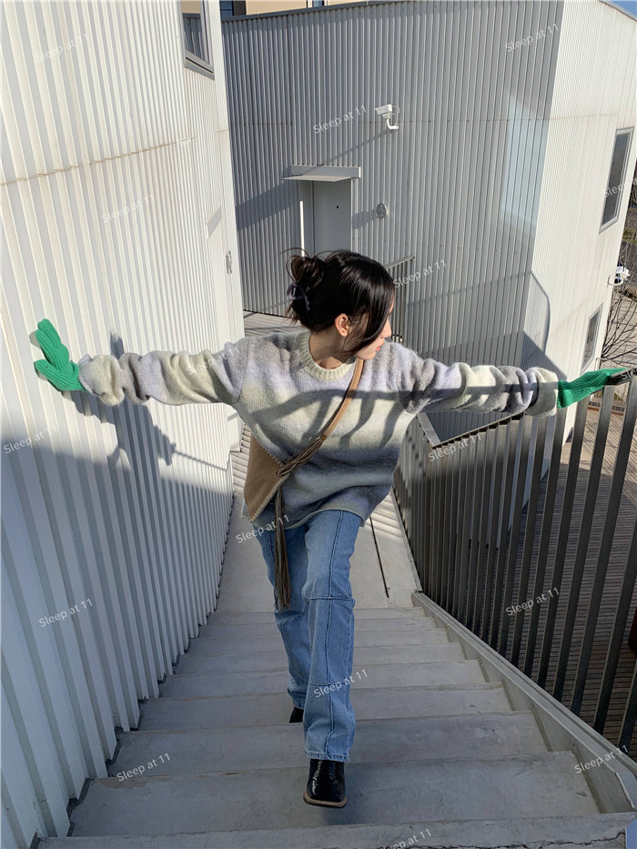 sleep at 11變身韓劇溫柔女主 慵懶個性漸層寬鬆舒適條紋圓領毛衣