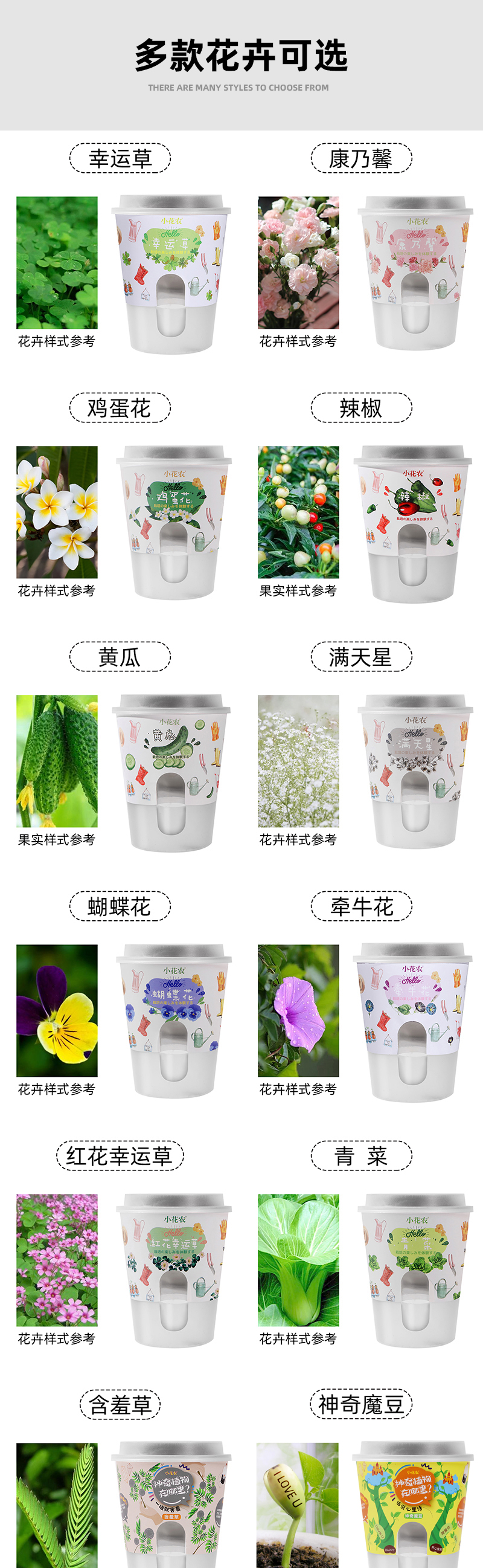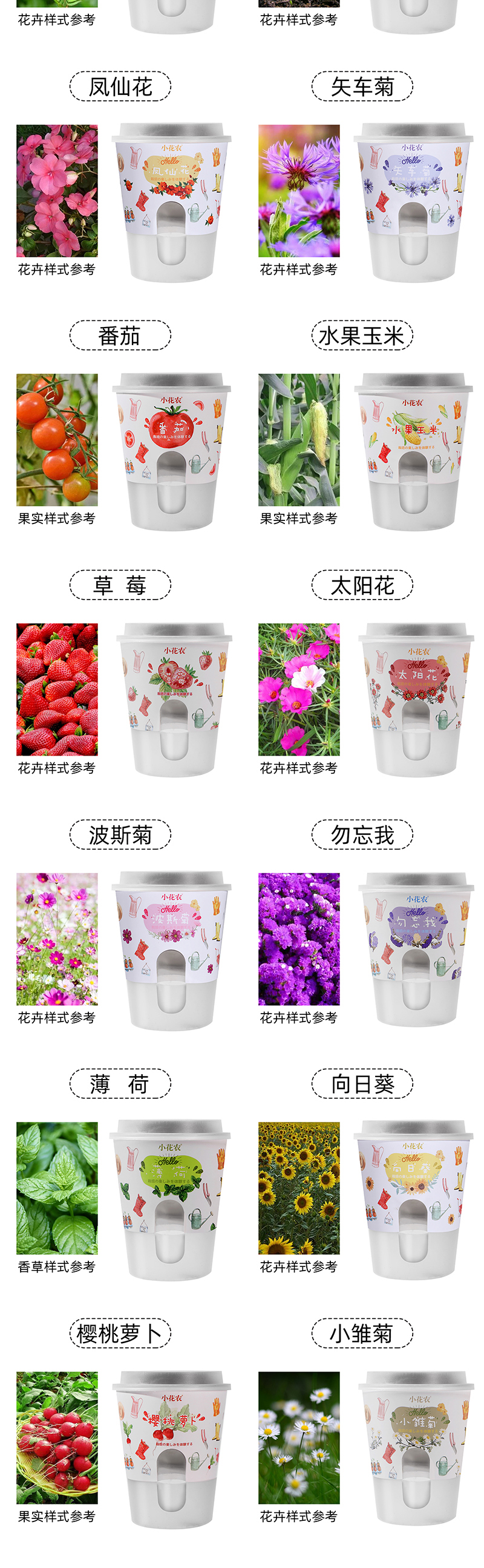 颜色 百日草,薄荷 · 康乃馨 · 金盏菊,薄荷,波斯菊 · 百日草 · 矢车菊,草莓,番茄,凤仙花 · 大丽花 · 鸡冠花,凤仙花,害羞草,红花幸运草,蝴蝶花,黄瓜,鸡蛋花,康乃馨,辣椒,鲁冰花 · 太阳花 · 松果菊,满天星,南瓜,牵牛花 · 雏菊· 孔雀草,牵牛花,矢车菊,鼠尾草 · 硫华菊 · 虞美人,水果玉米,太阳花,豌豆,勿忘我,西瓜,向日葵,小雏菊,幸运草,薰衣草 · 向日葵 · 幸运草,薰衣草,洋甘菊 · 兔尾草 · 矮向日葵,青菜,神奇魔豆,樱桃萝卜