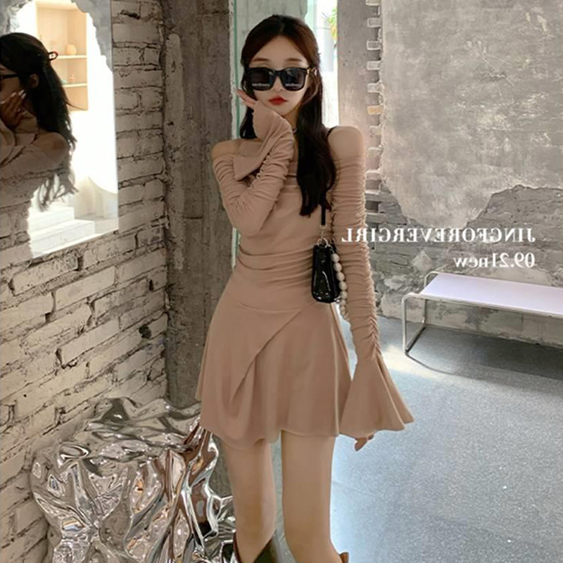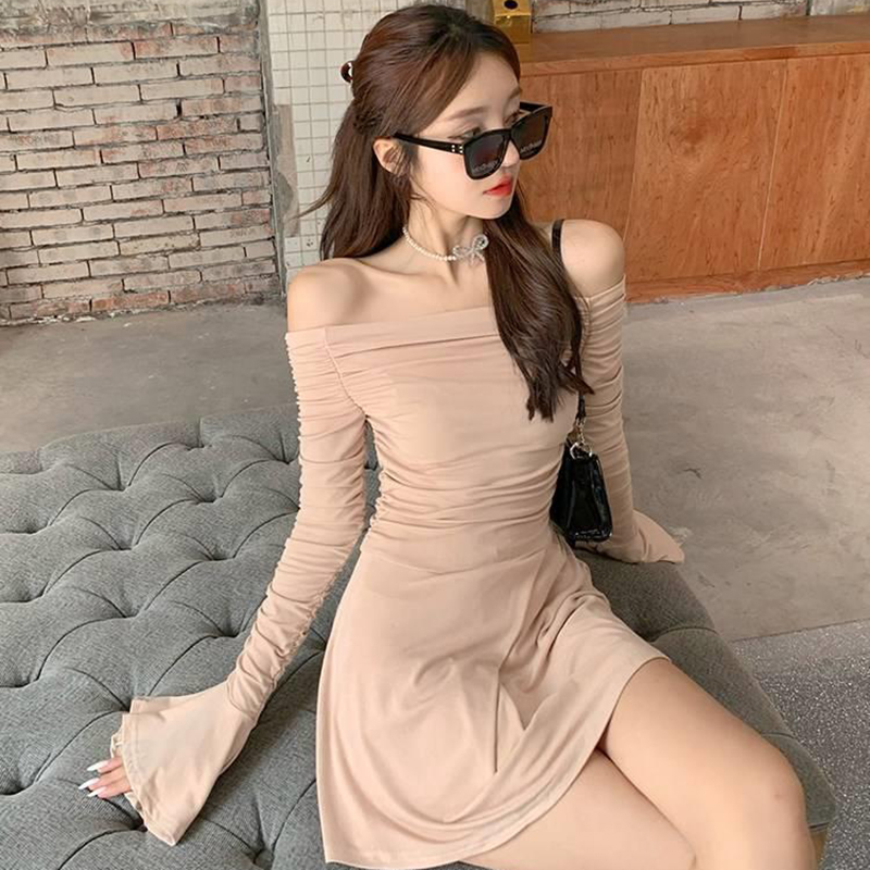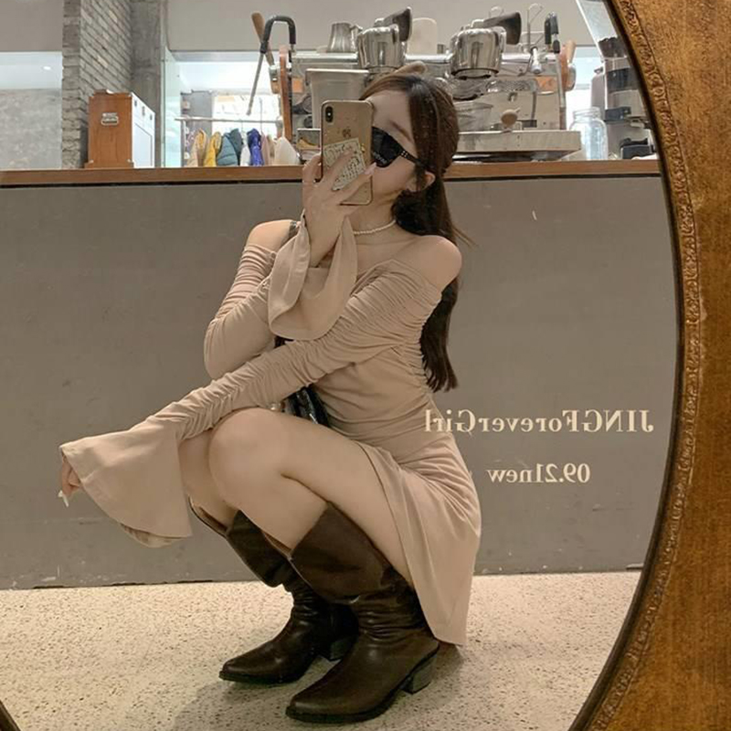 裸色性感純欲氣質裙子女秋季2023新款喇叭袖收腰顯瘦一字肩洋裝