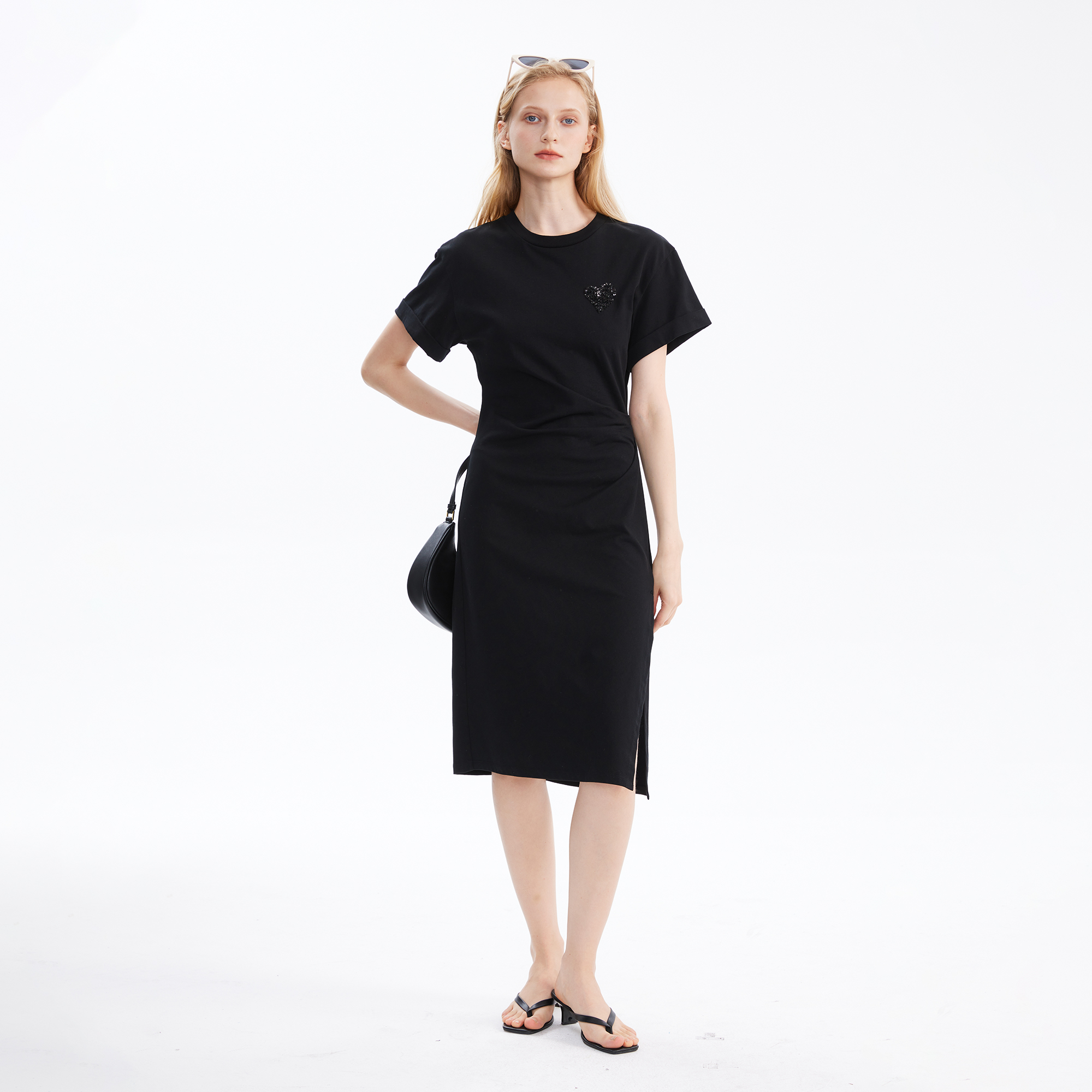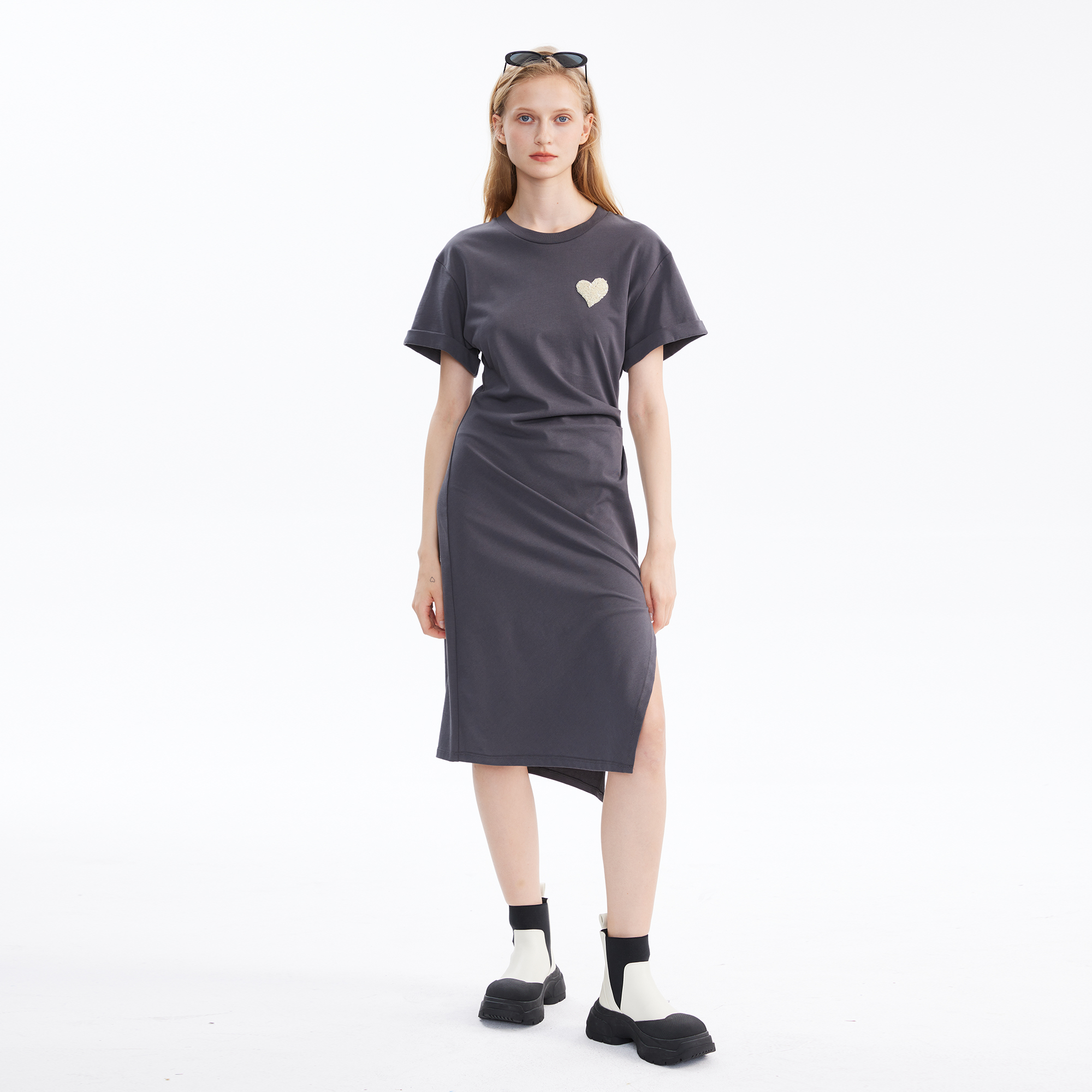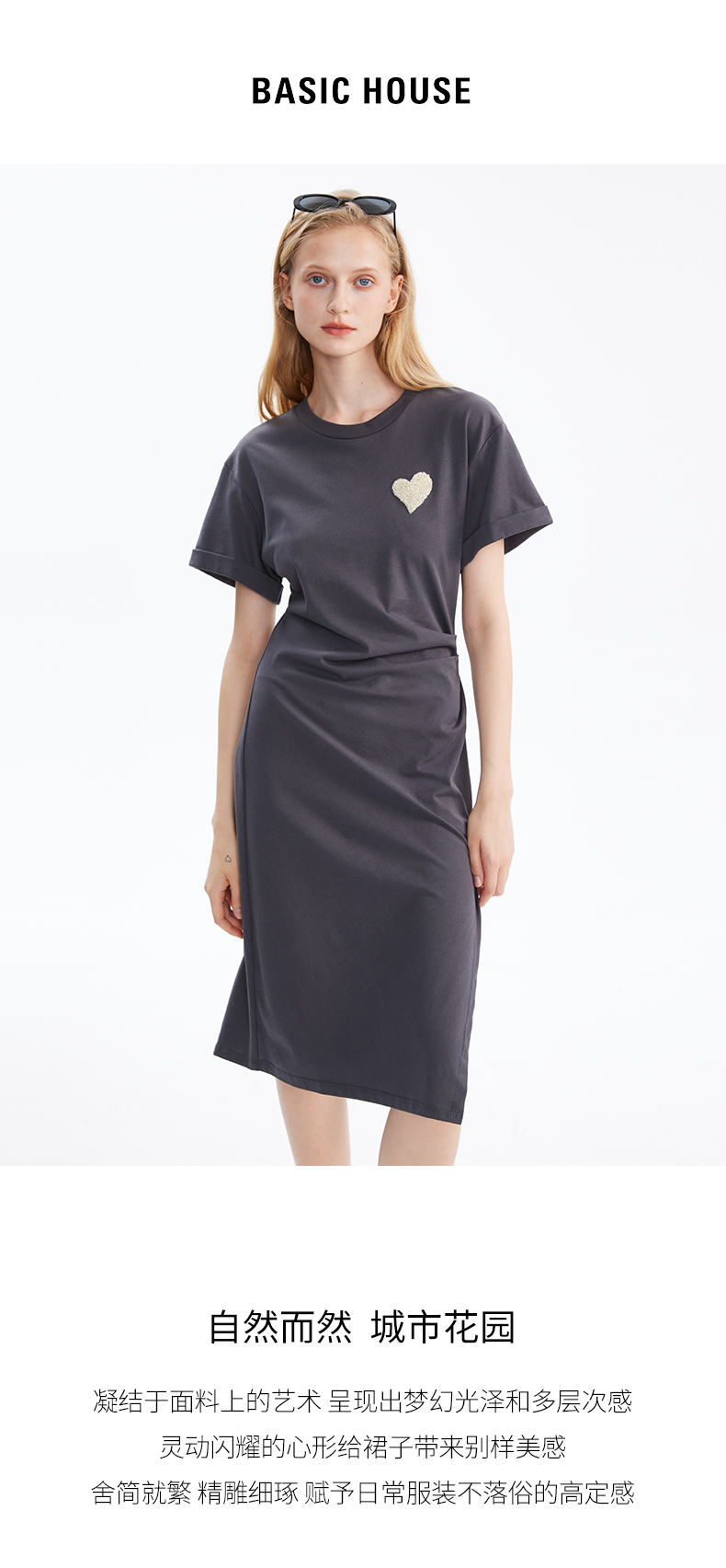 Basic House/百家好愛心褶皺洋裝女2023夏季新款小眾收腰裙子