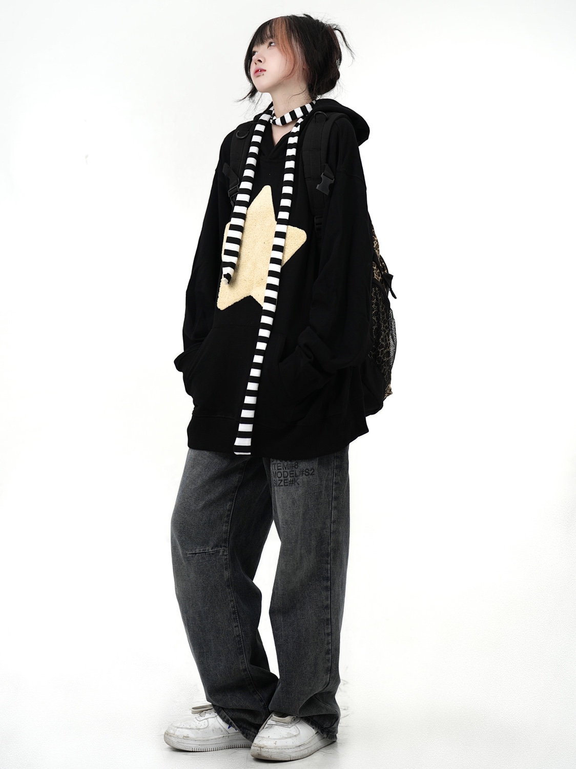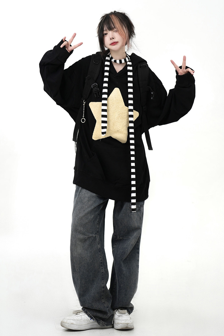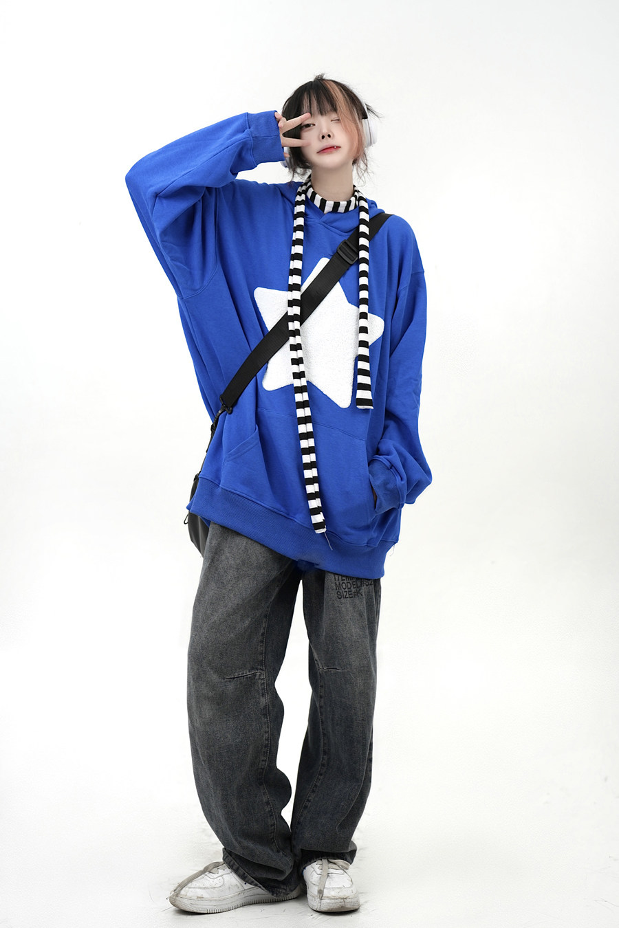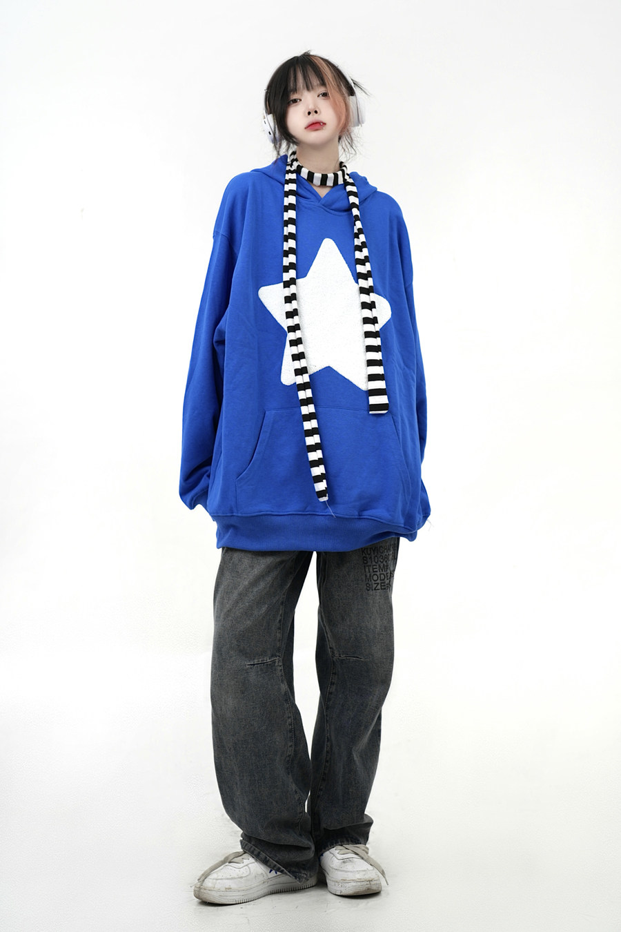 咖哩人美式復古毛圈繡五角星男女連帽運動衫ins寬鬆字母情侶上衣潮