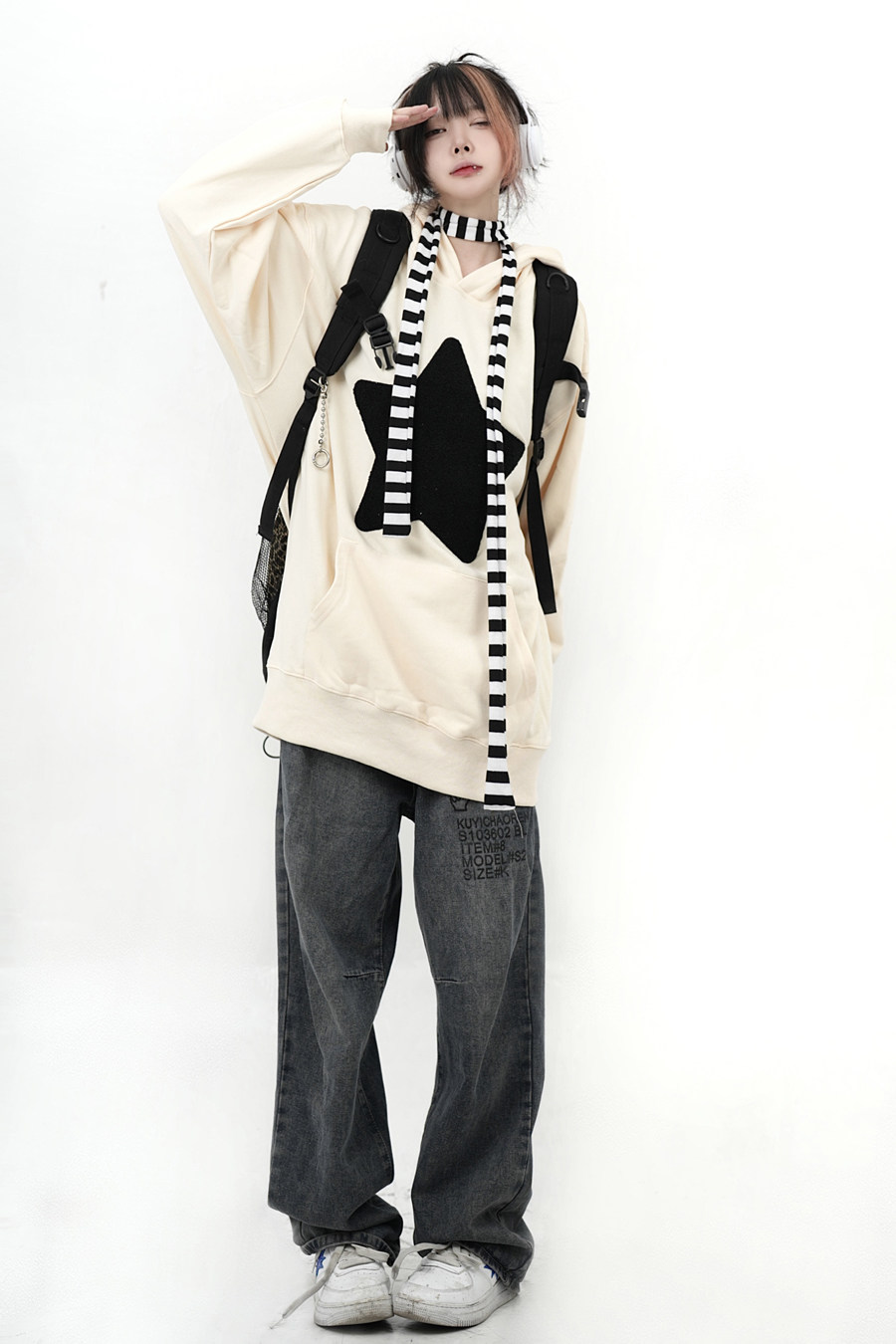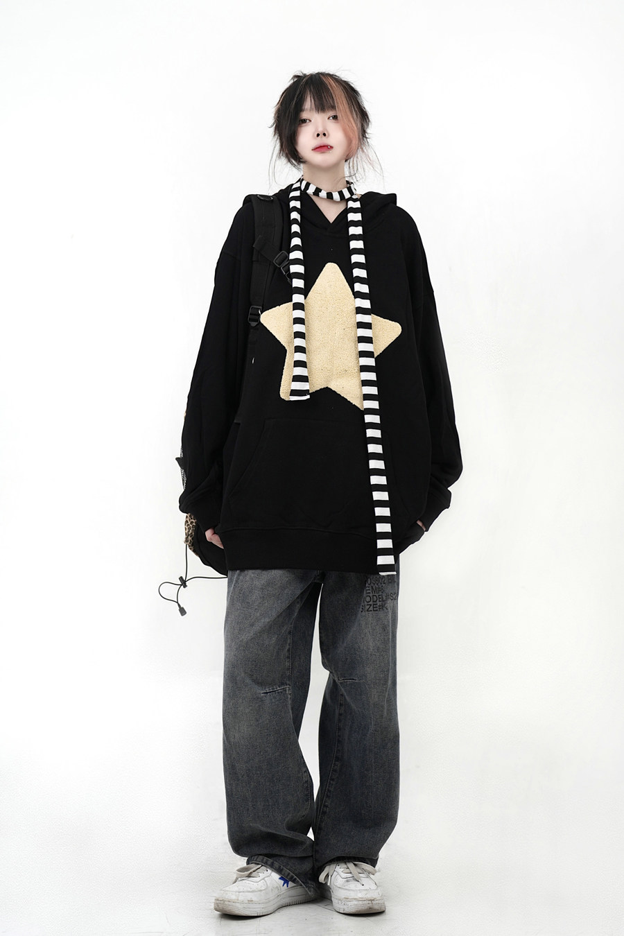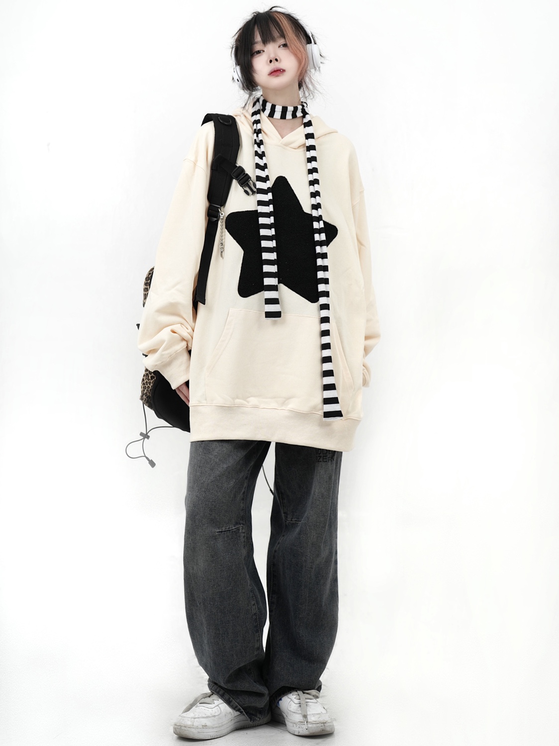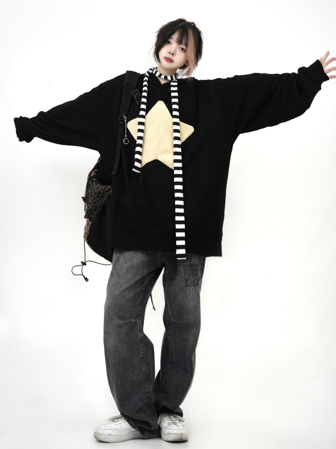 咖哩人美式復古毛圈繡五角星男女連帽運動衫ins寬鬆字母情侶上衣潮