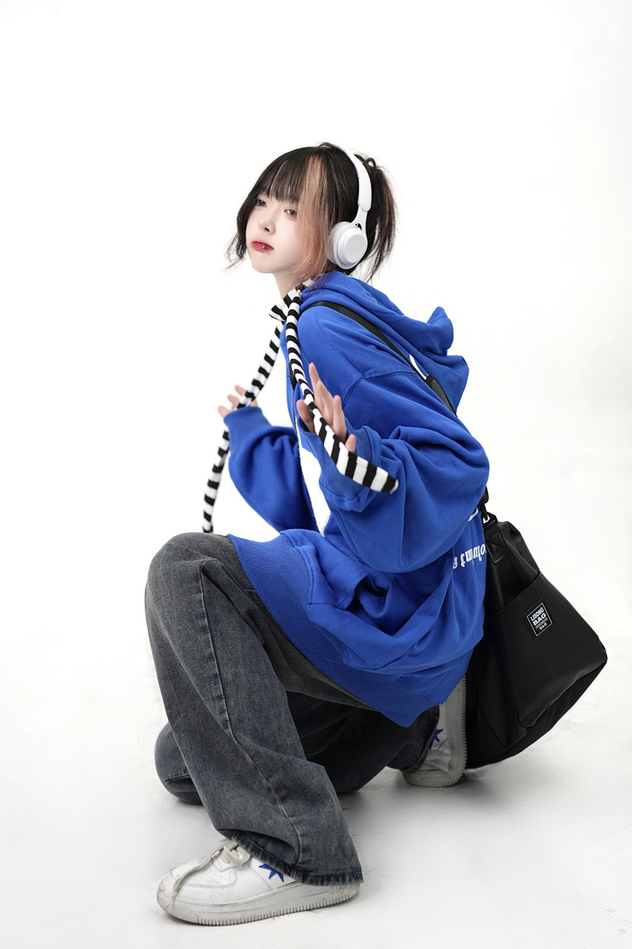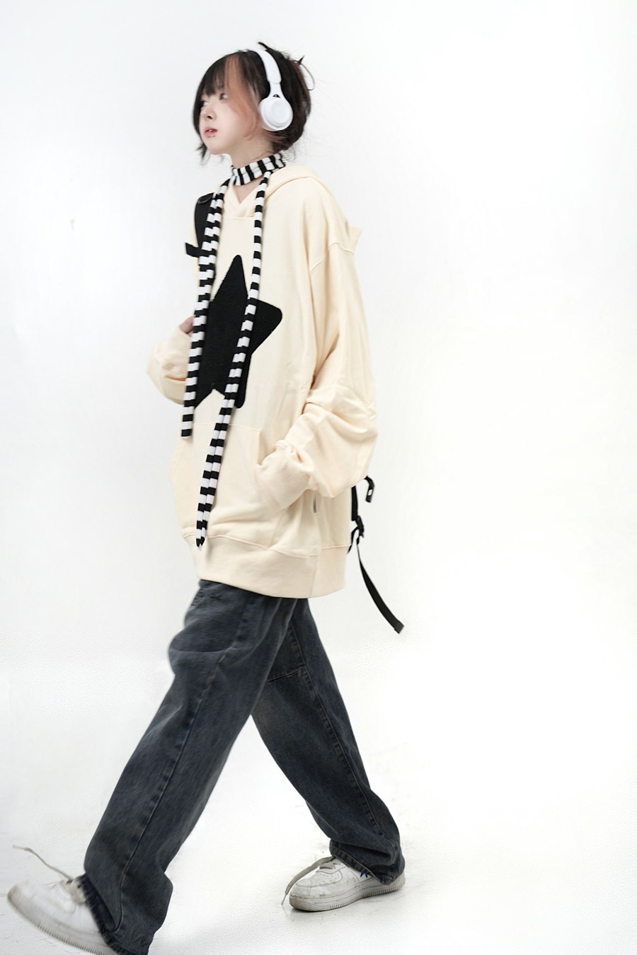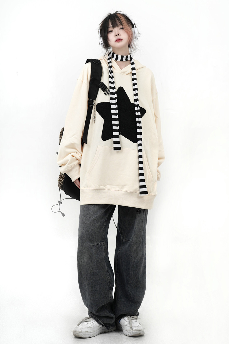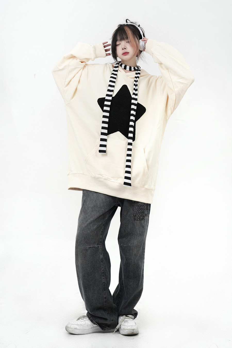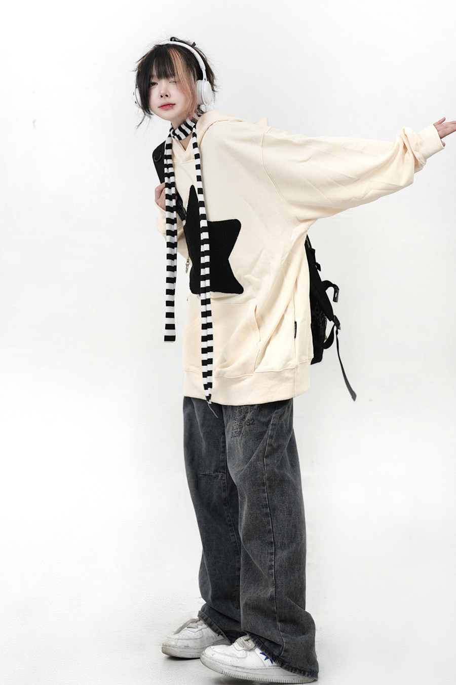 咖哩人美式復古毛圈繡五角星男女連帽運動衫ins寬鬆字母情侶上衣潮