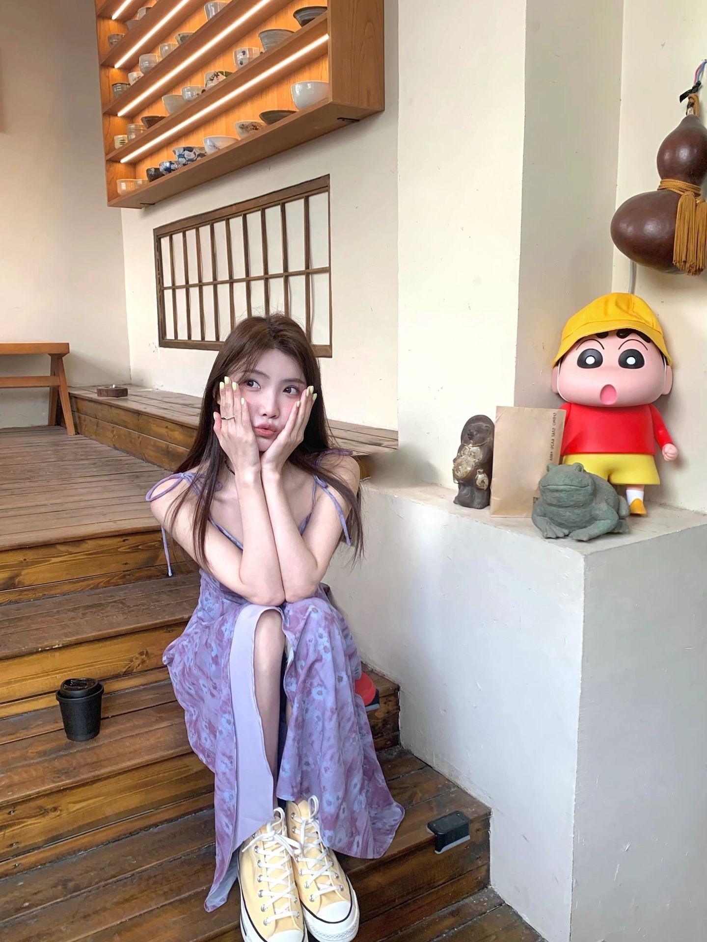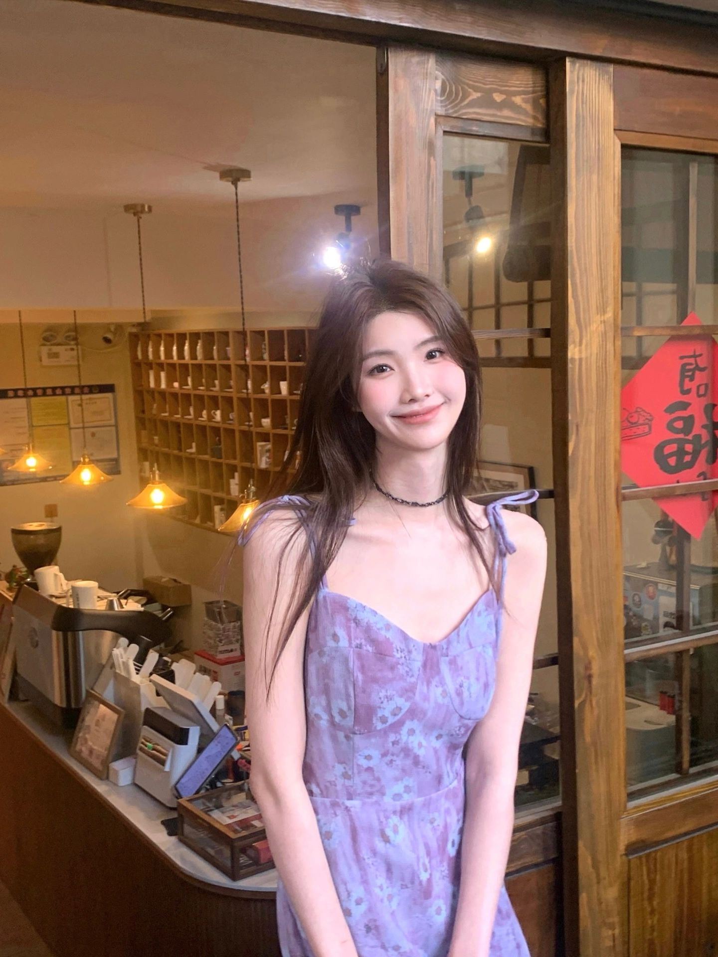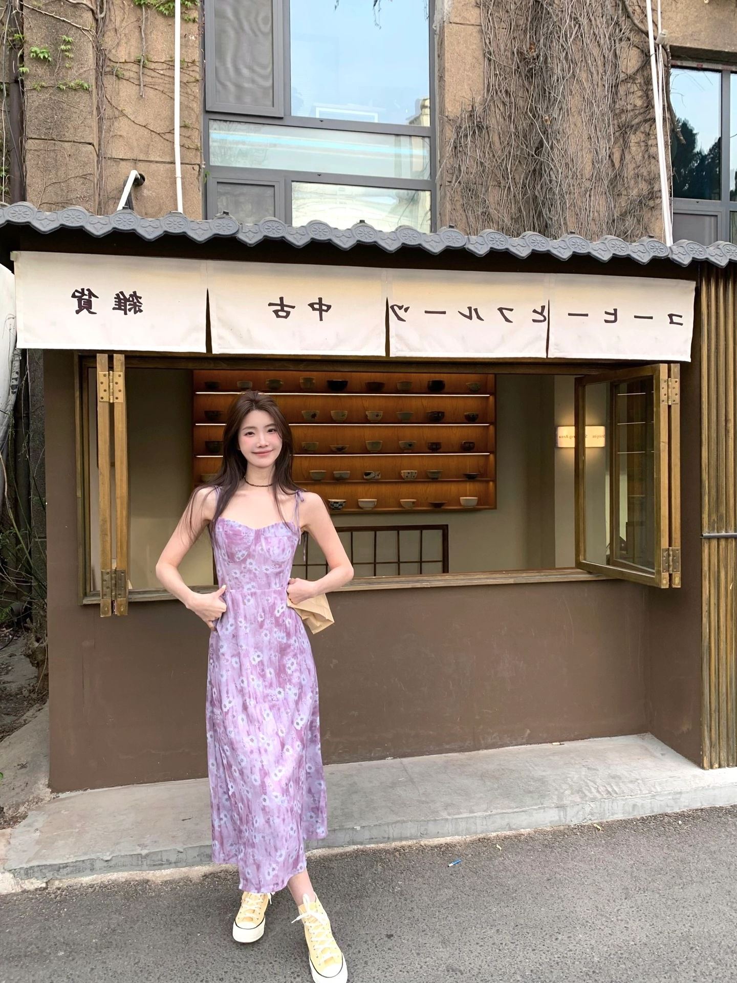 茶歇法式紫色碎花吊帶洋裝2023女夏新款高級感港味復古沙灘裙子