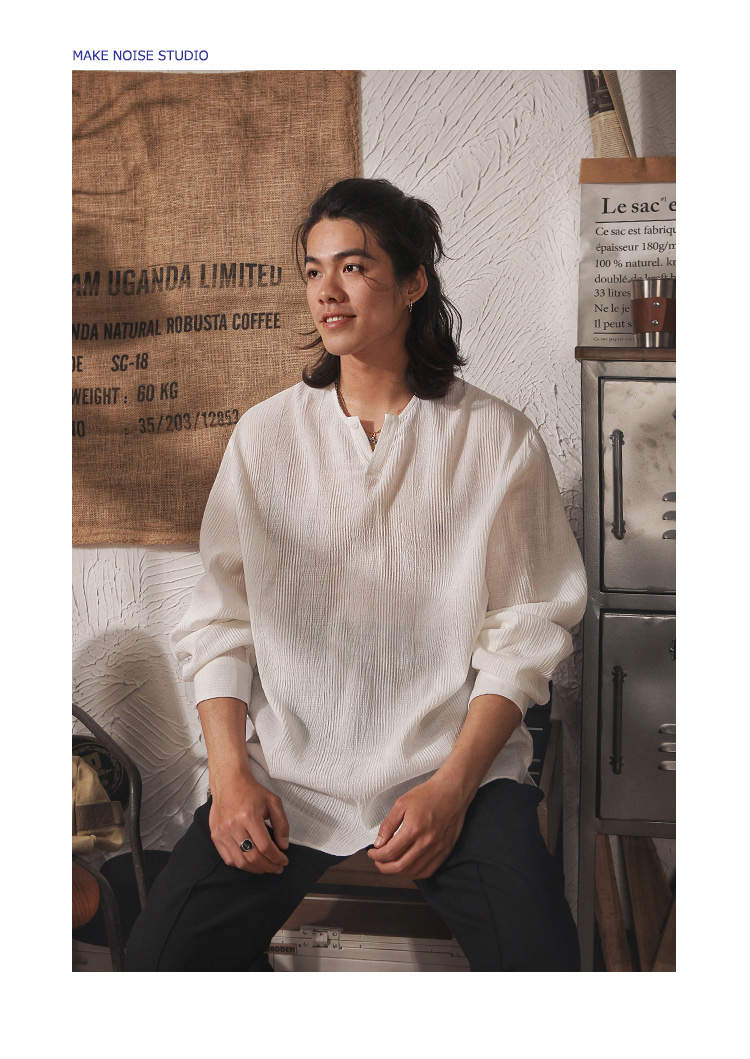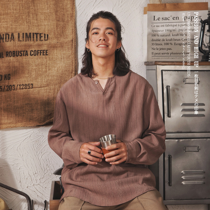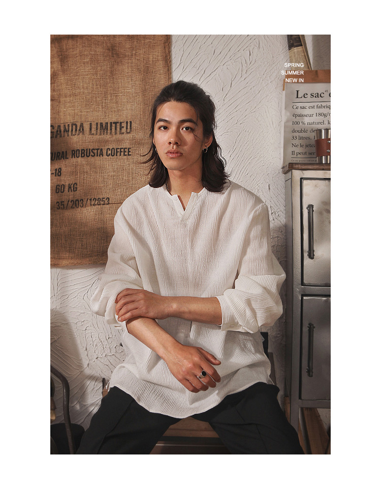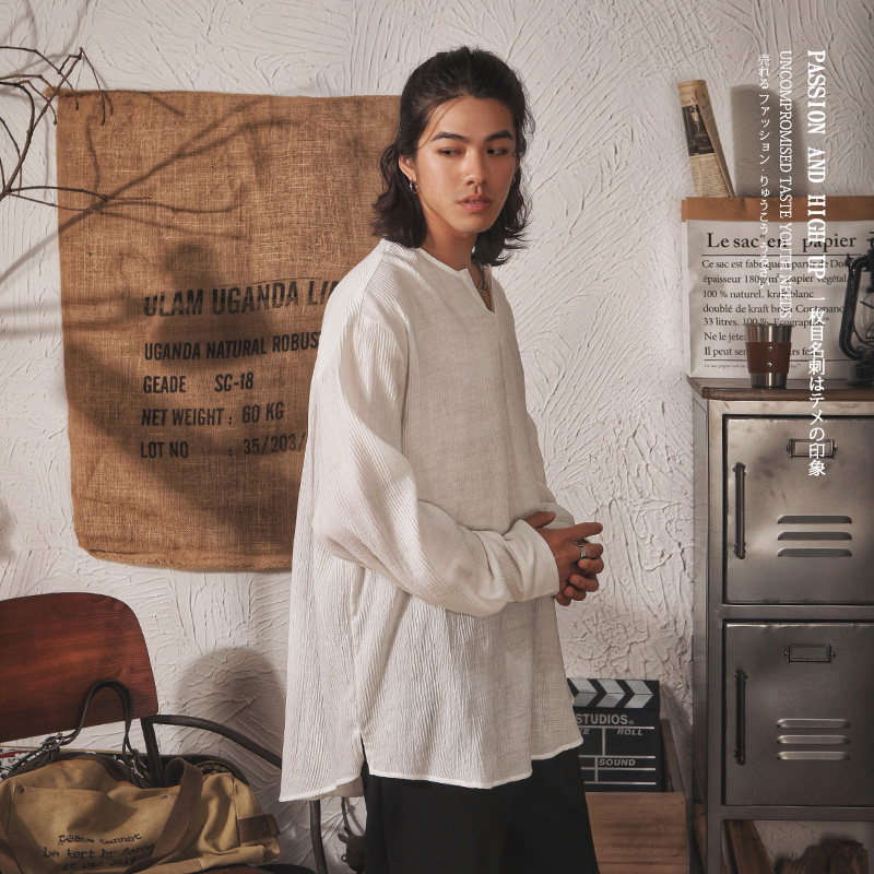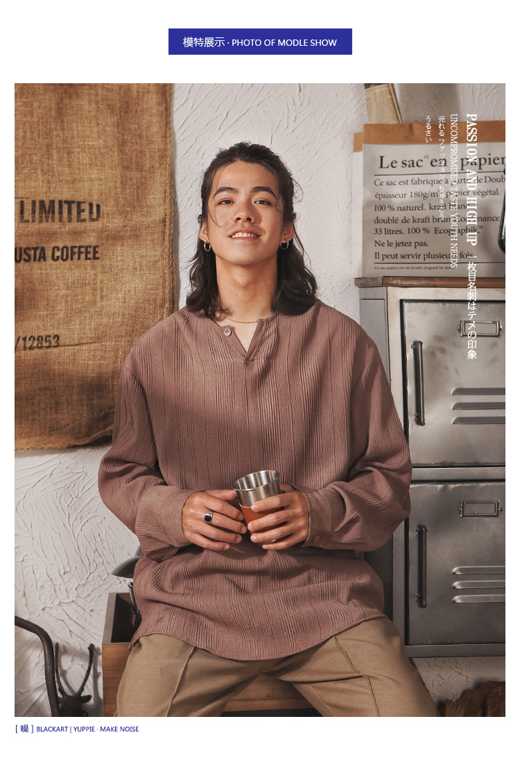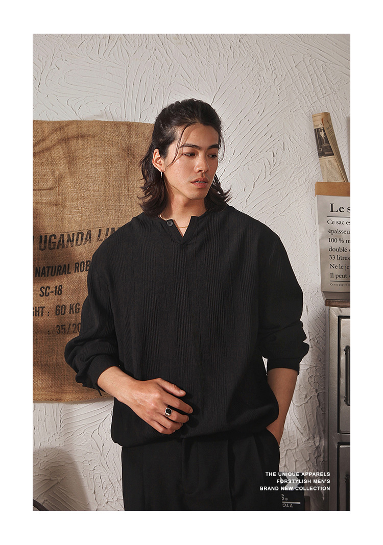 夏季垂墜感輕薄款長袖T恤男美式復古硬漢純色寬鬆V領打底亨利衫
