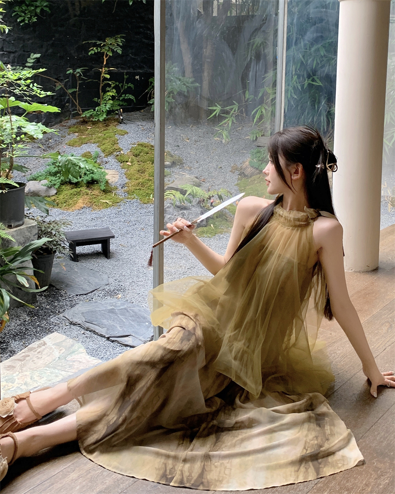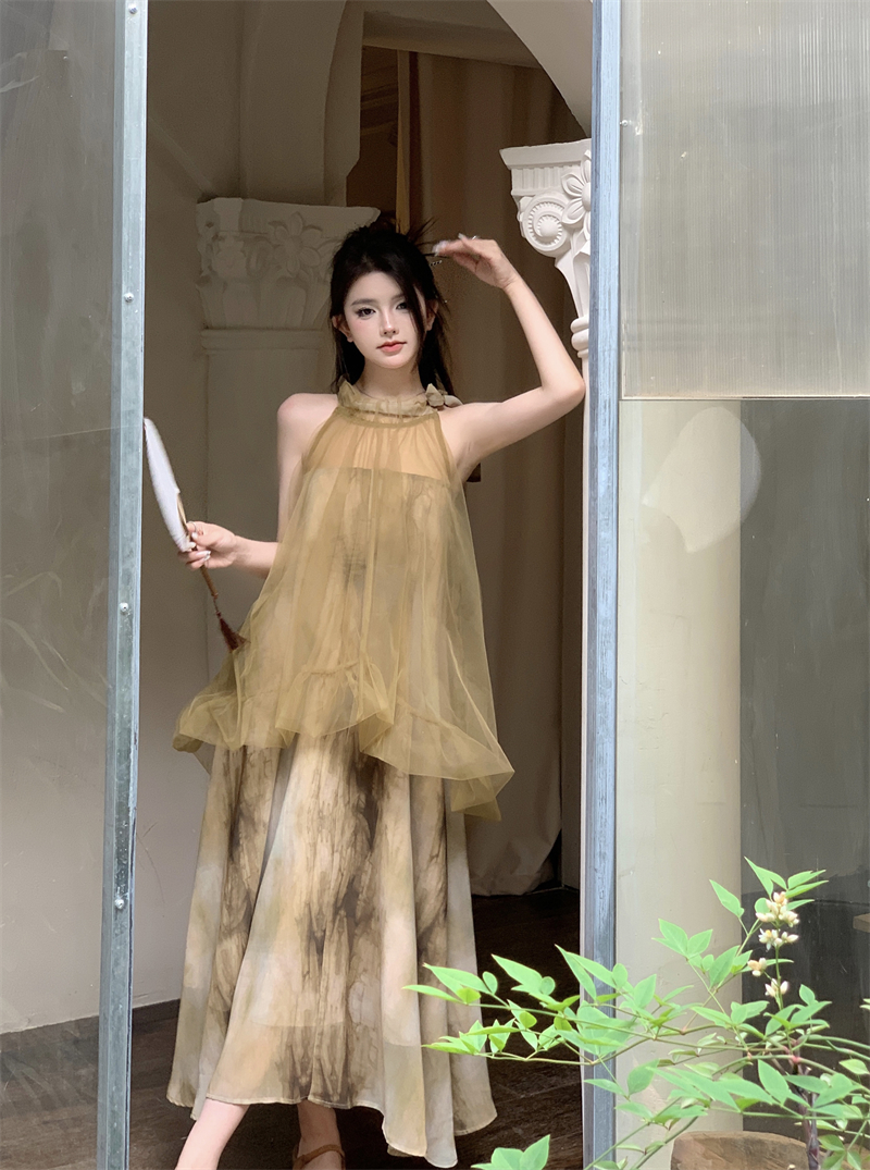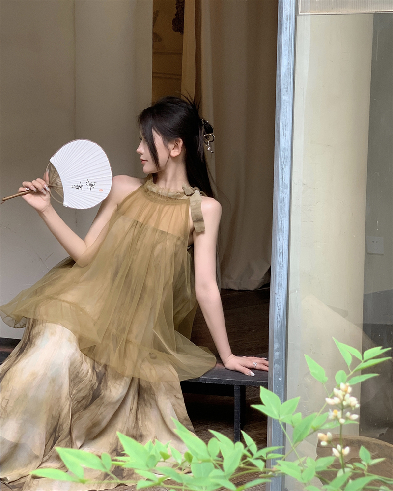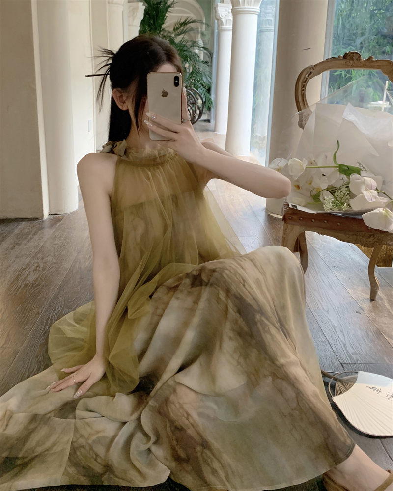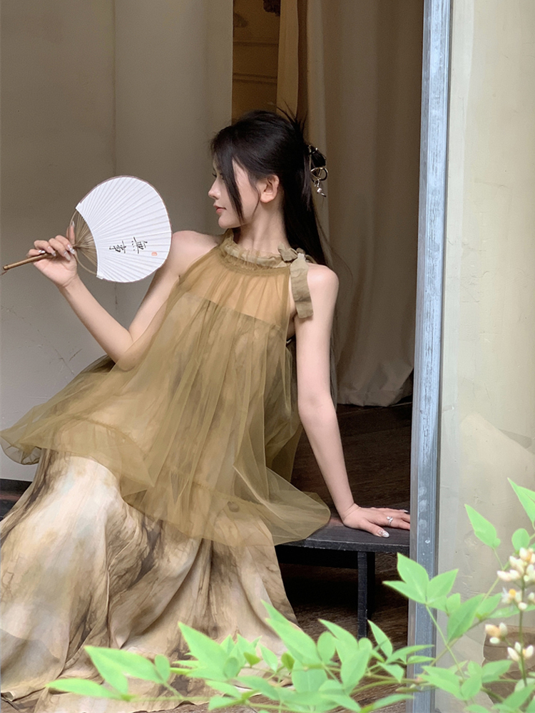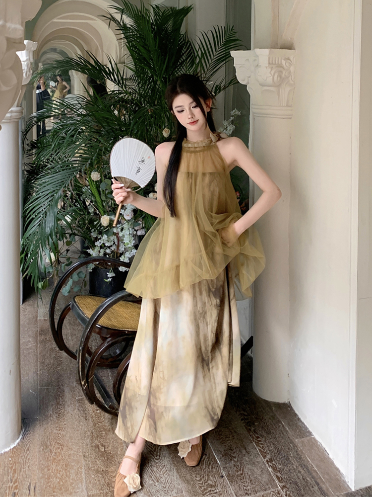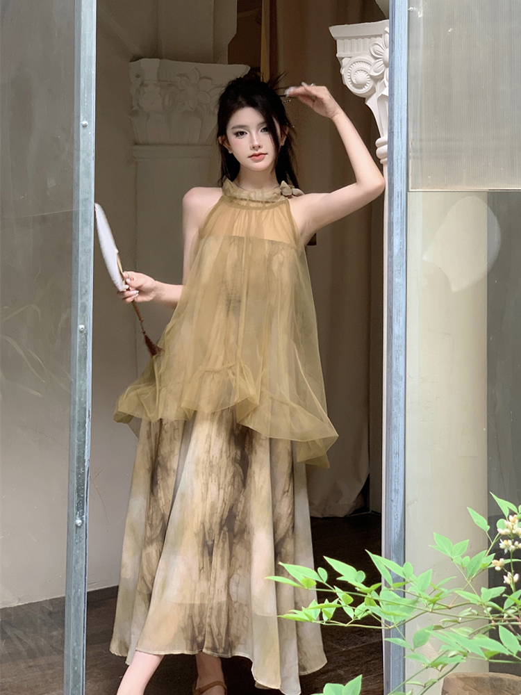 2023新款高級感無袖掛頸洋裝仙女夏新中式改良旗袍假兩件長裙子