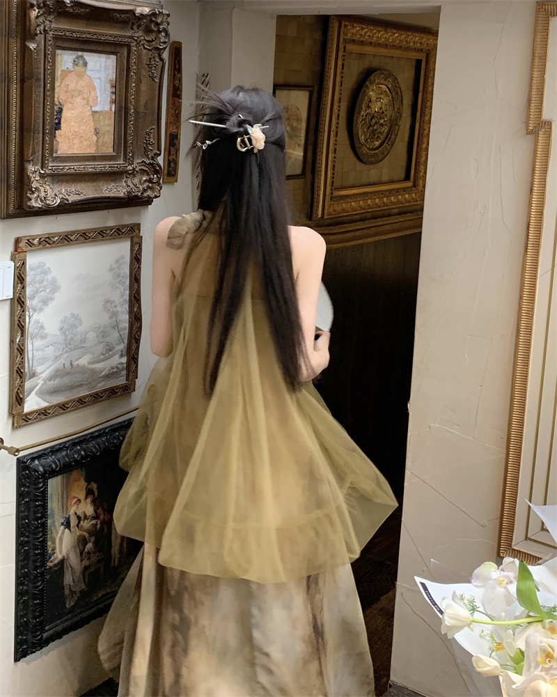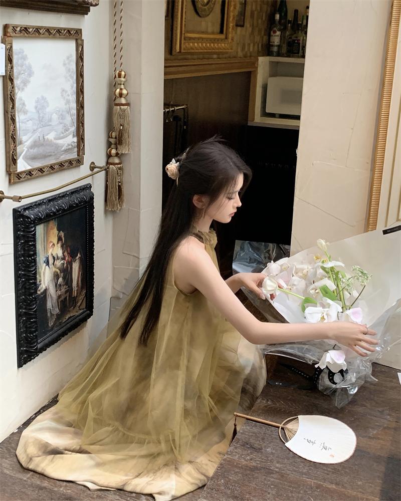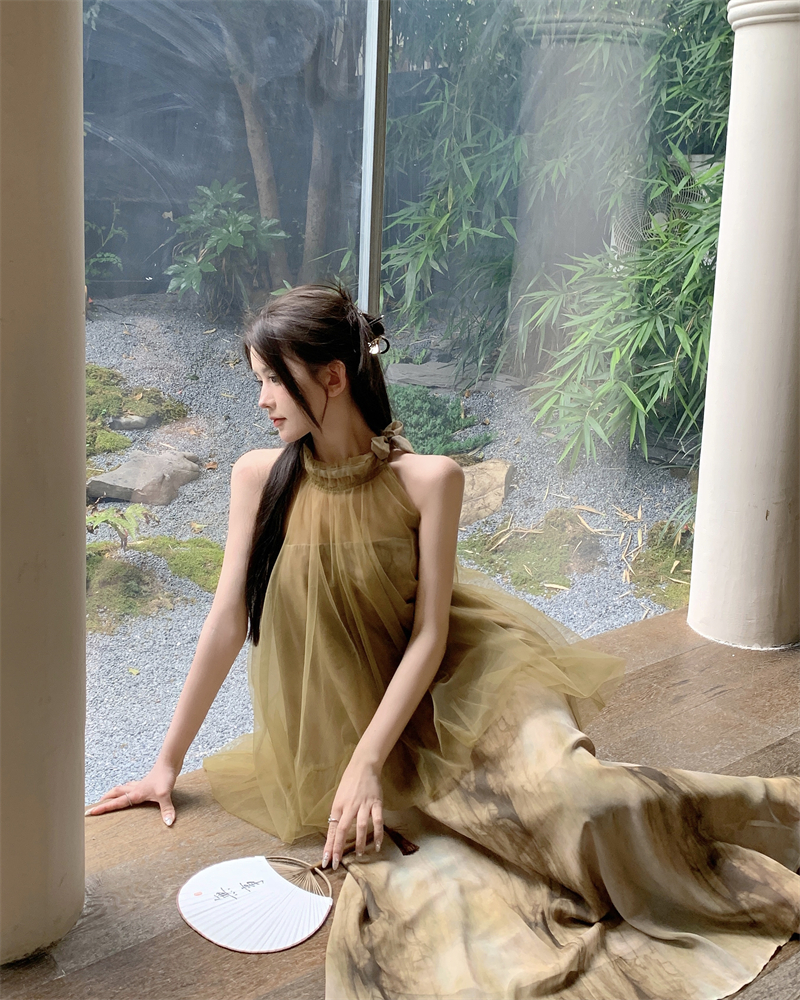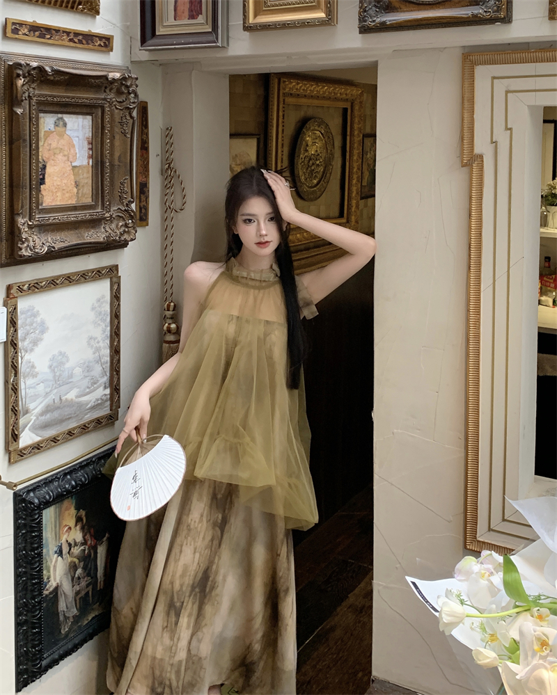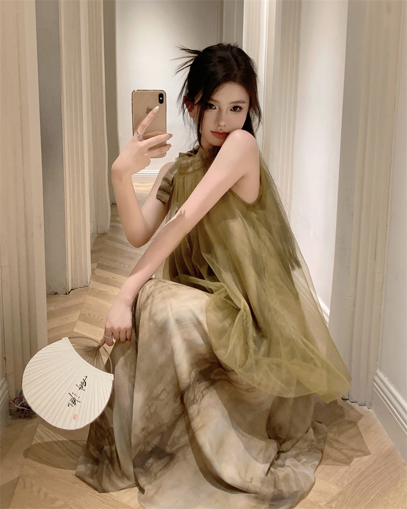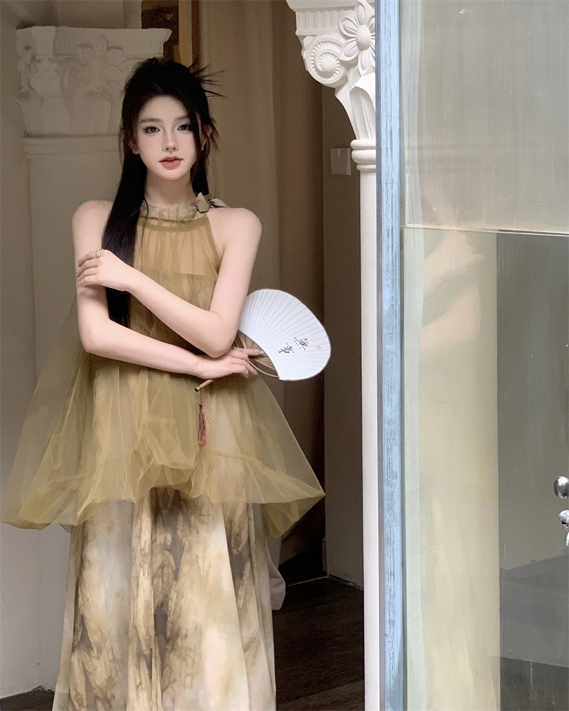 2023新款高級感無袖掛頸洋裝仙女夏新中式改良旗袍假兩件長裙子