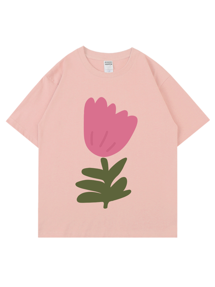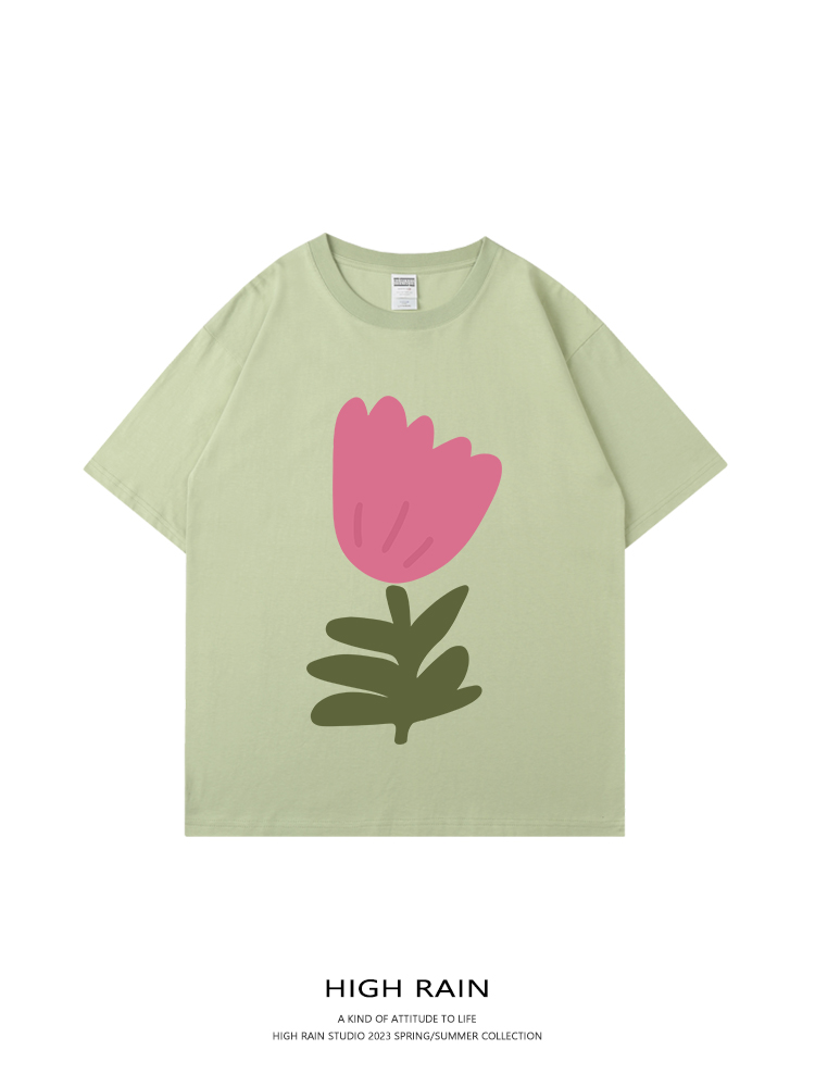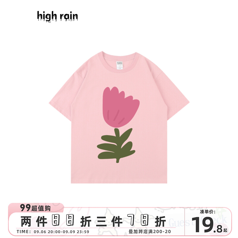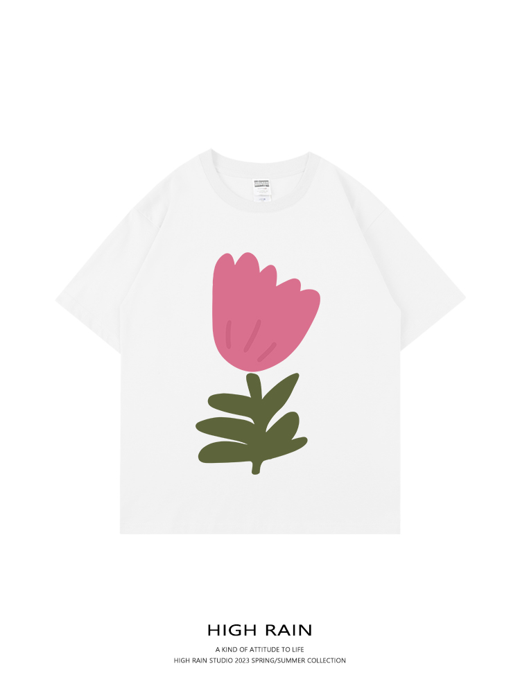 high rain 夏季花朵落肩短袖男女ins風純棉T恤百搭寬鬆情侶T恤