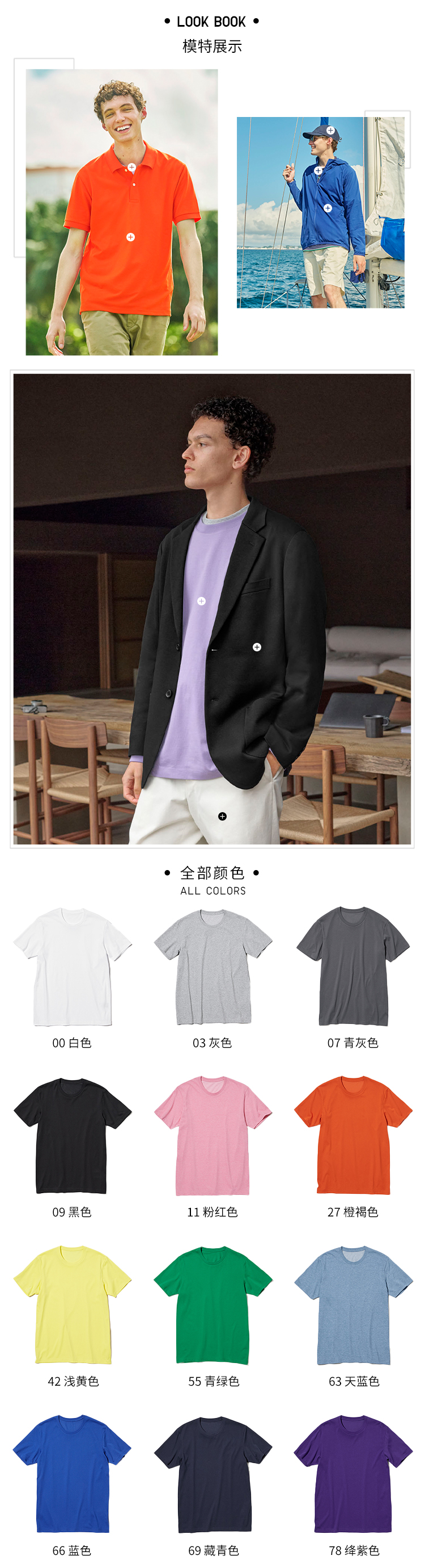 【面料组成】 [00 白色、69 藏青色、09 黑色、78 绛紫色、55 青绿色、42 浅黄色、27 橙褐色、66 蓝色、07 青灰色、03 灰色、08 深灰色]大身:棉66%,聚酯纤维34%。[11 粉红色、63 天蓝色]大身:聚酯纤维76%,棉24%。