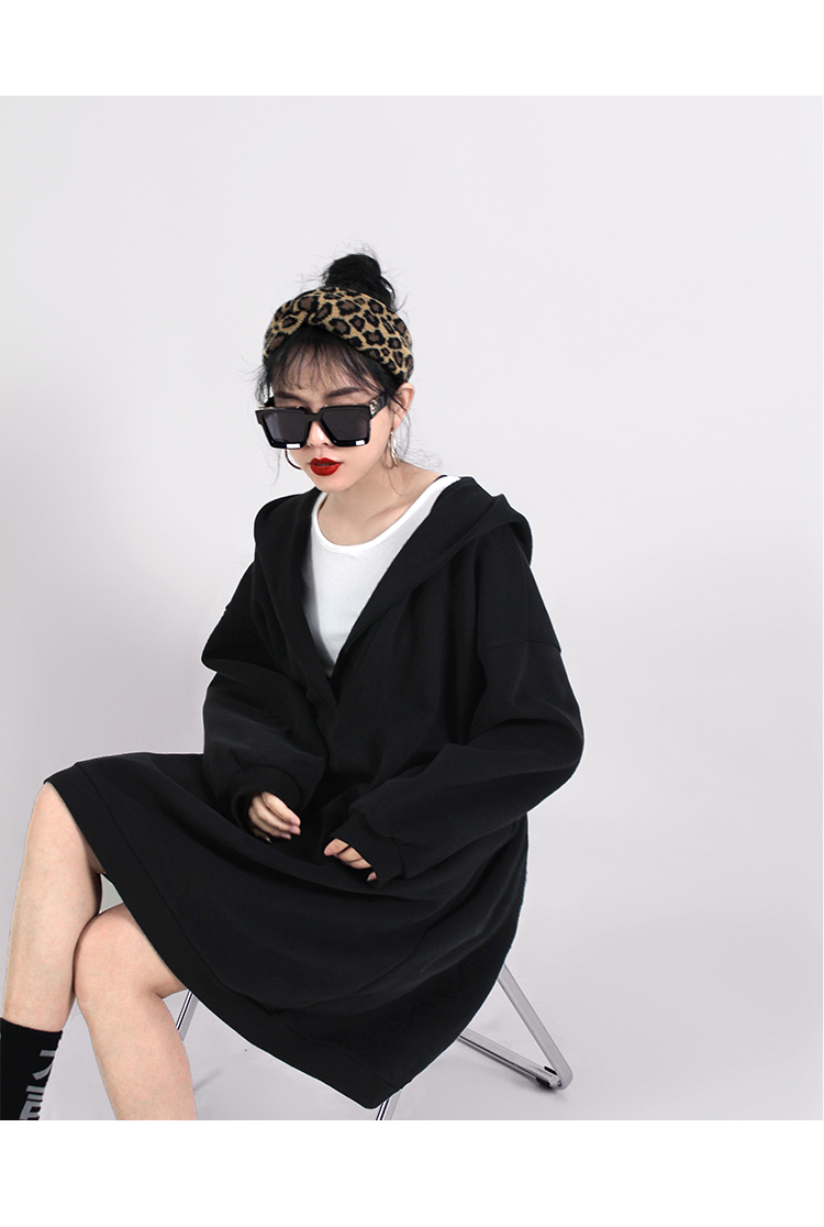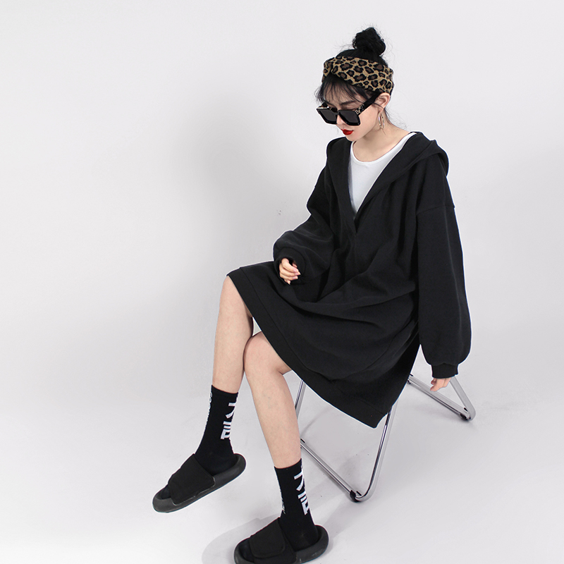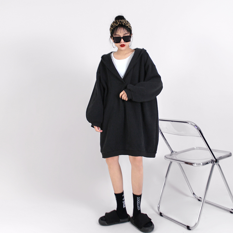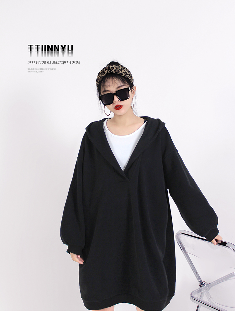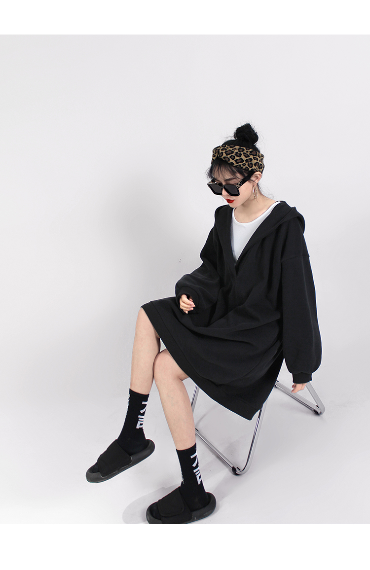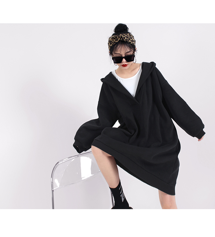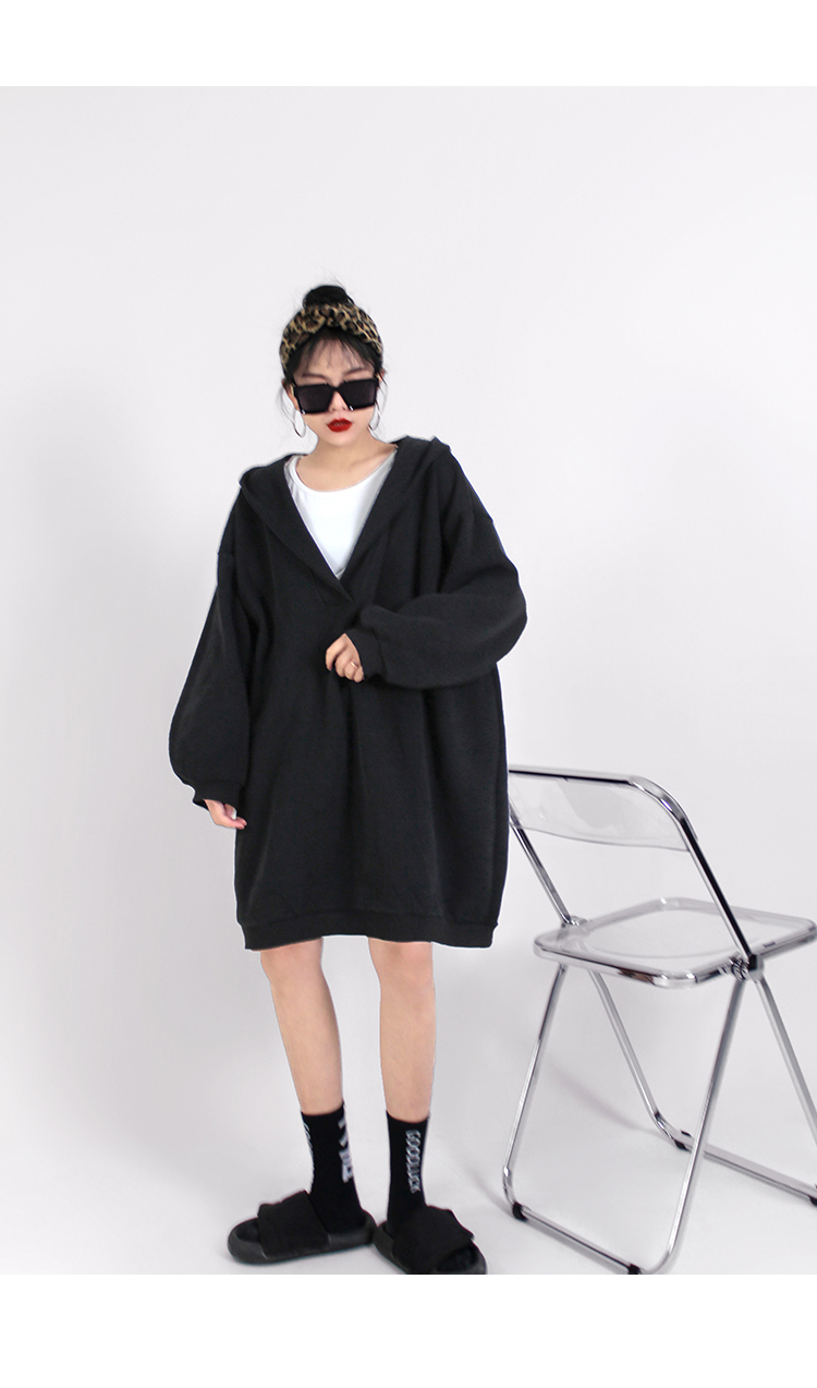 中長版寬鬆超大尺碼胖mm連帽運動衫裙女2023秋季黑色遮臀顯瘦慵懶外套