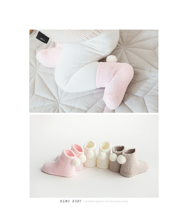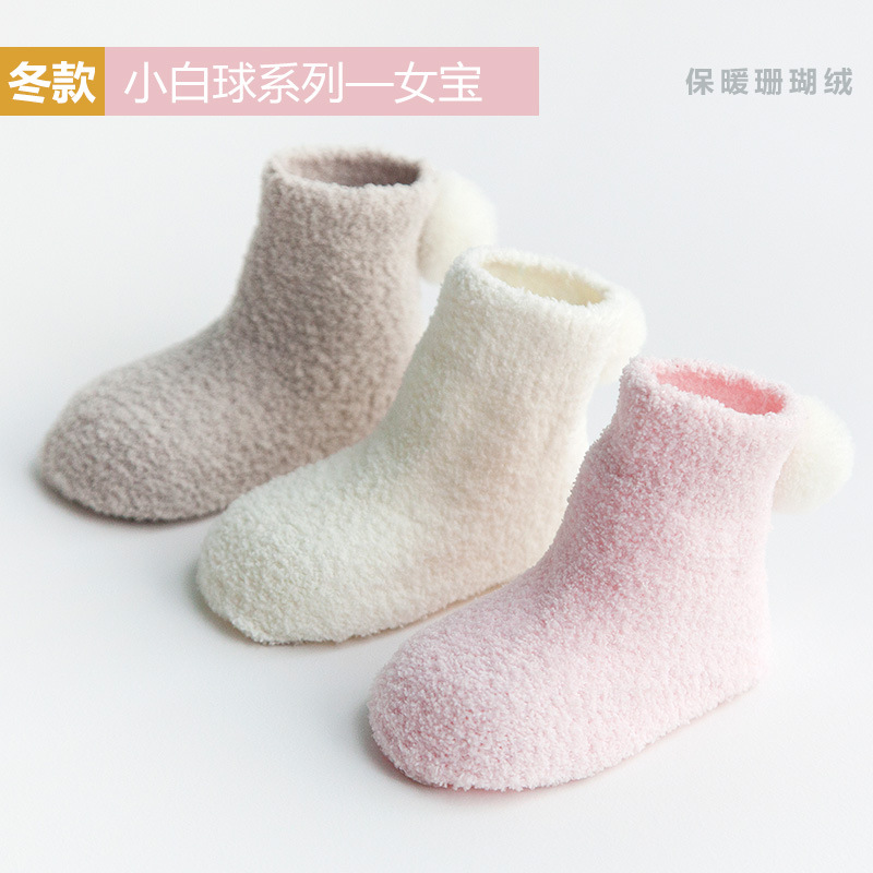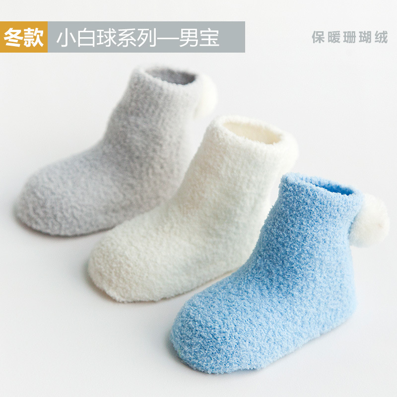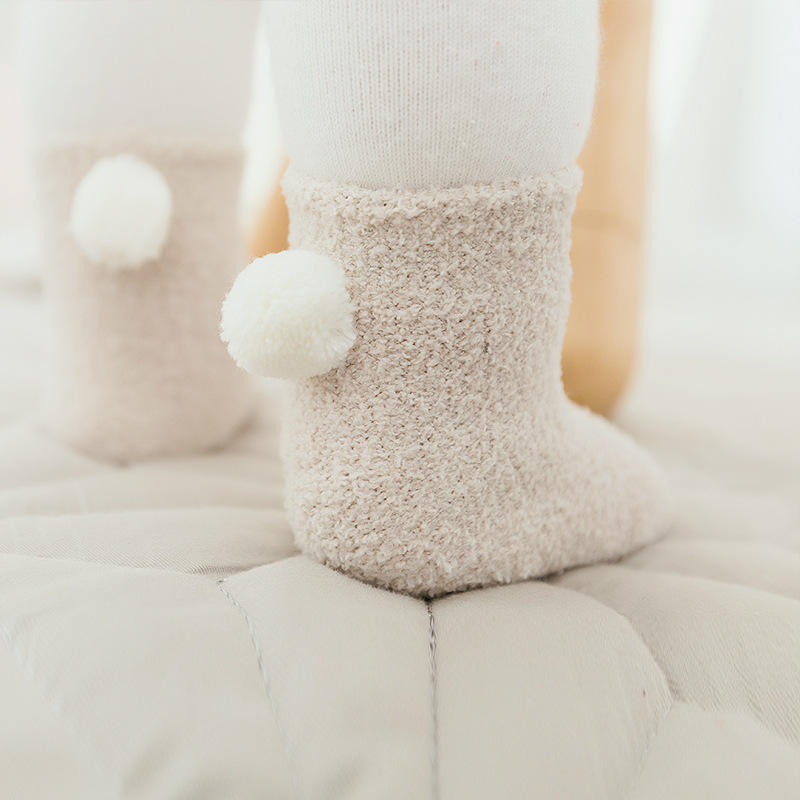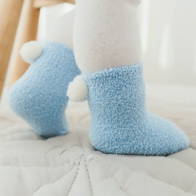 新款秋冬加厚保暖宝宝袜子 0-1-3岁婴儿纯色珊瑚绒球球初生儿袜子