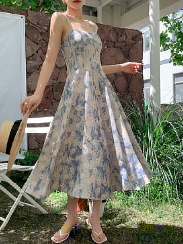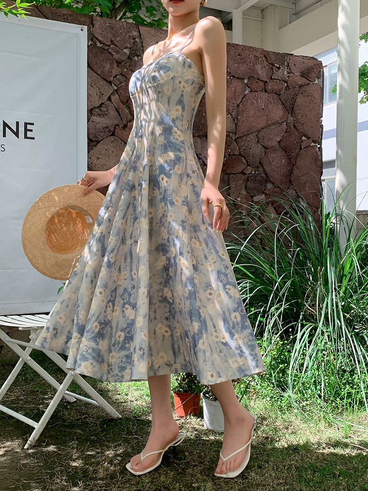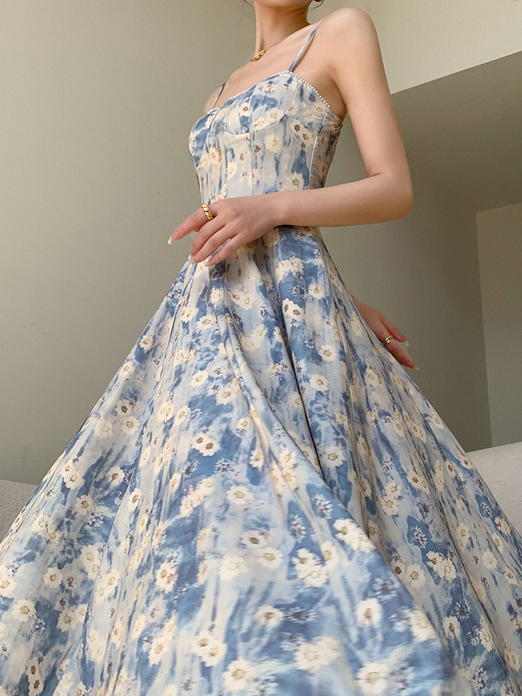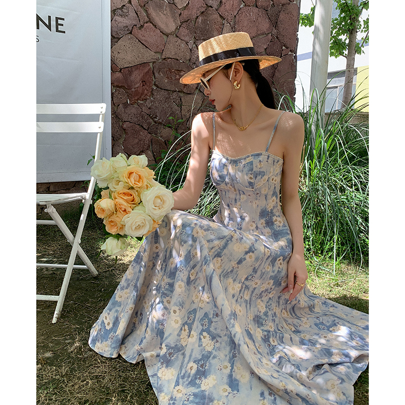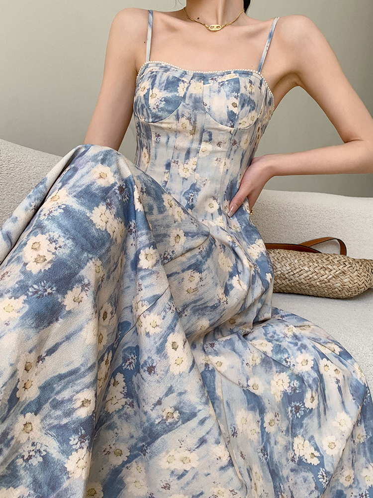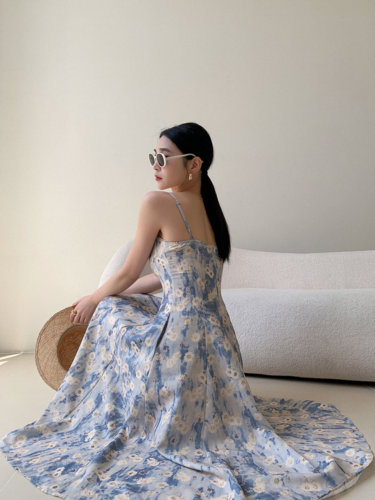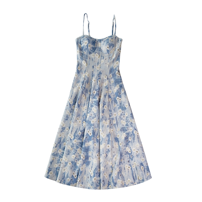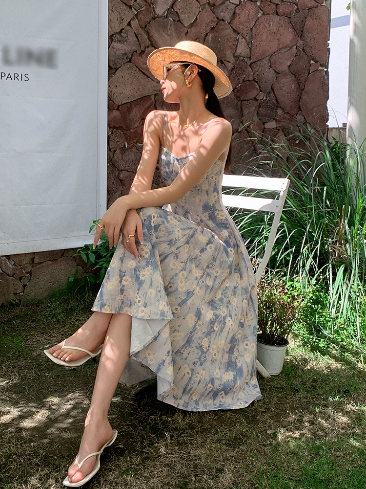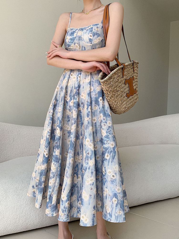 JWUNIQUE藍色無袖吊帶洋裝女夏季2023年新款海邊度假風長版裙子