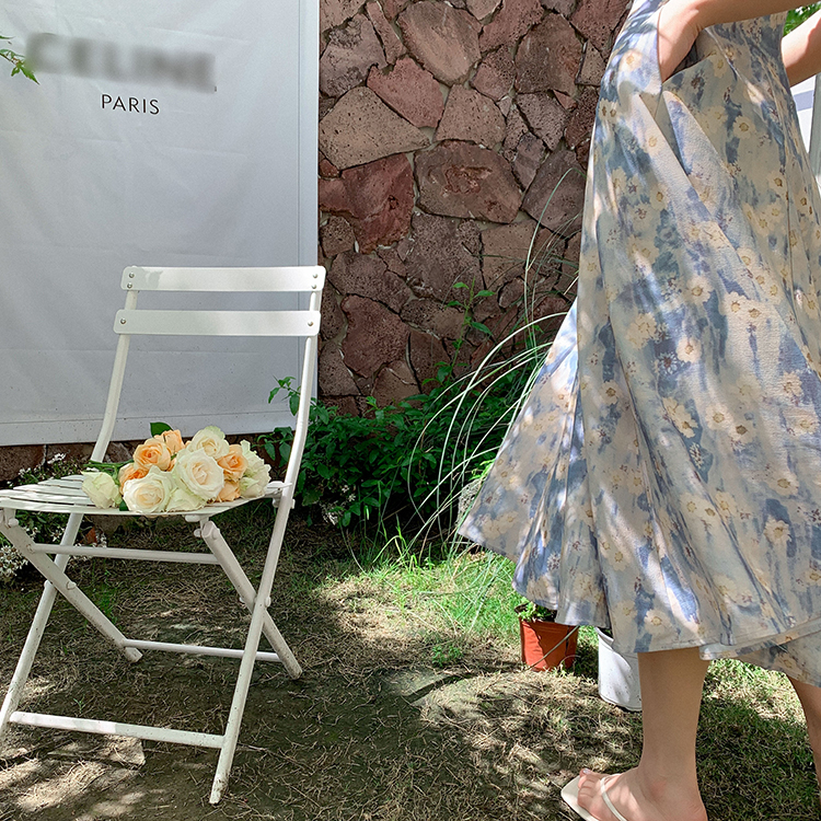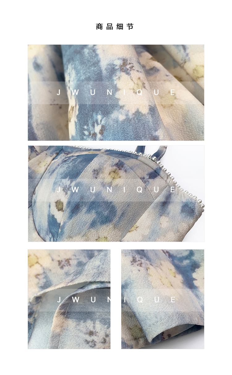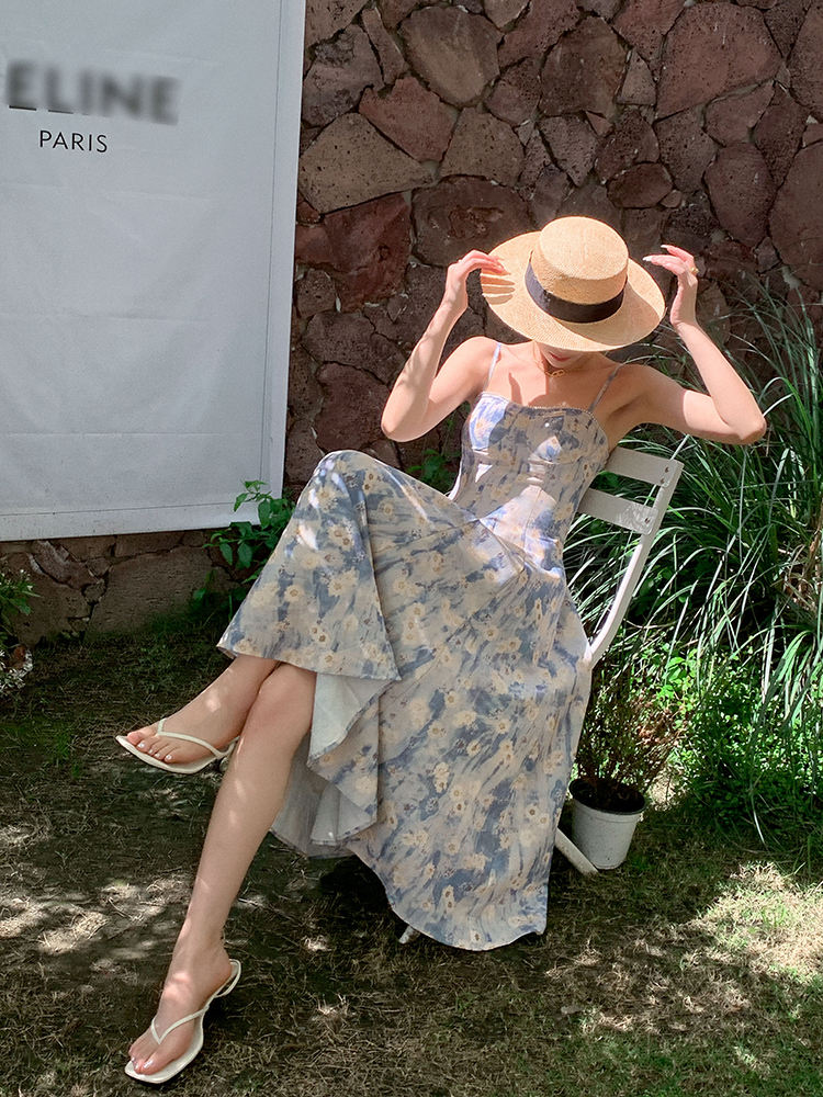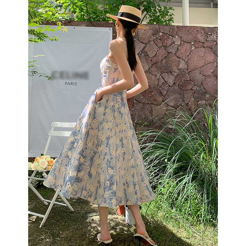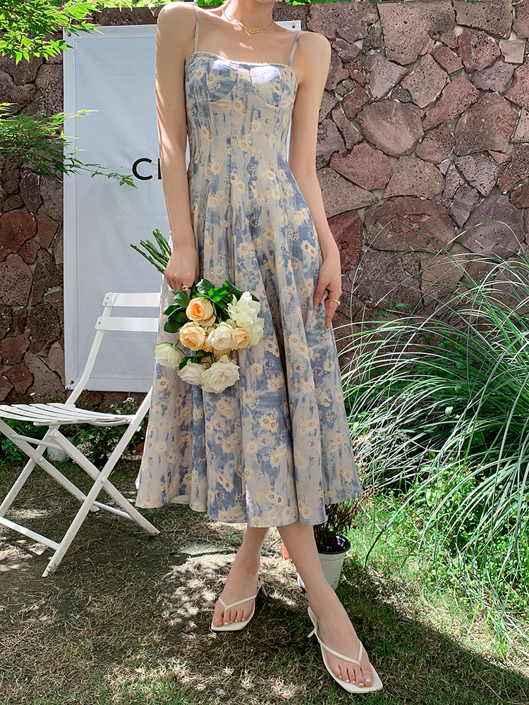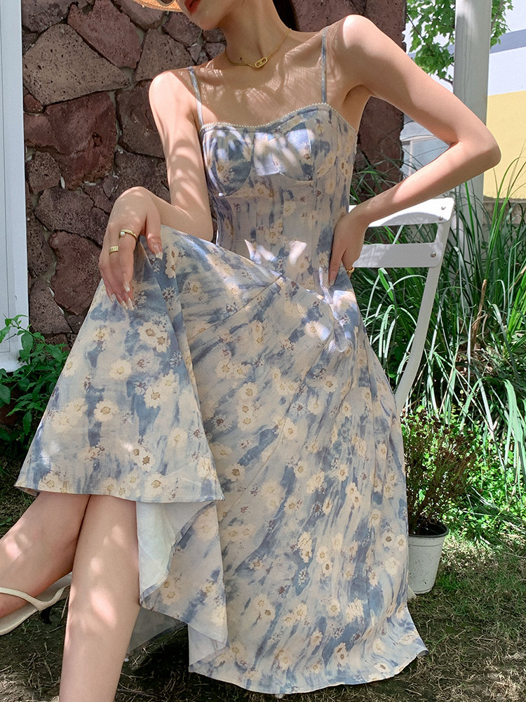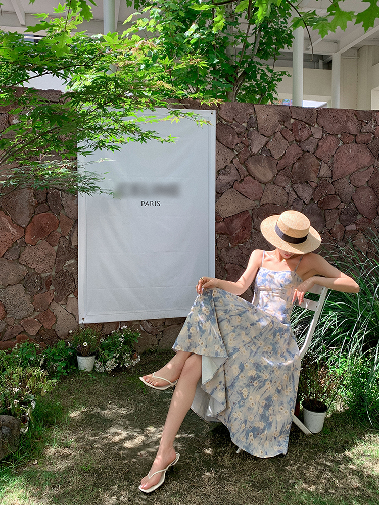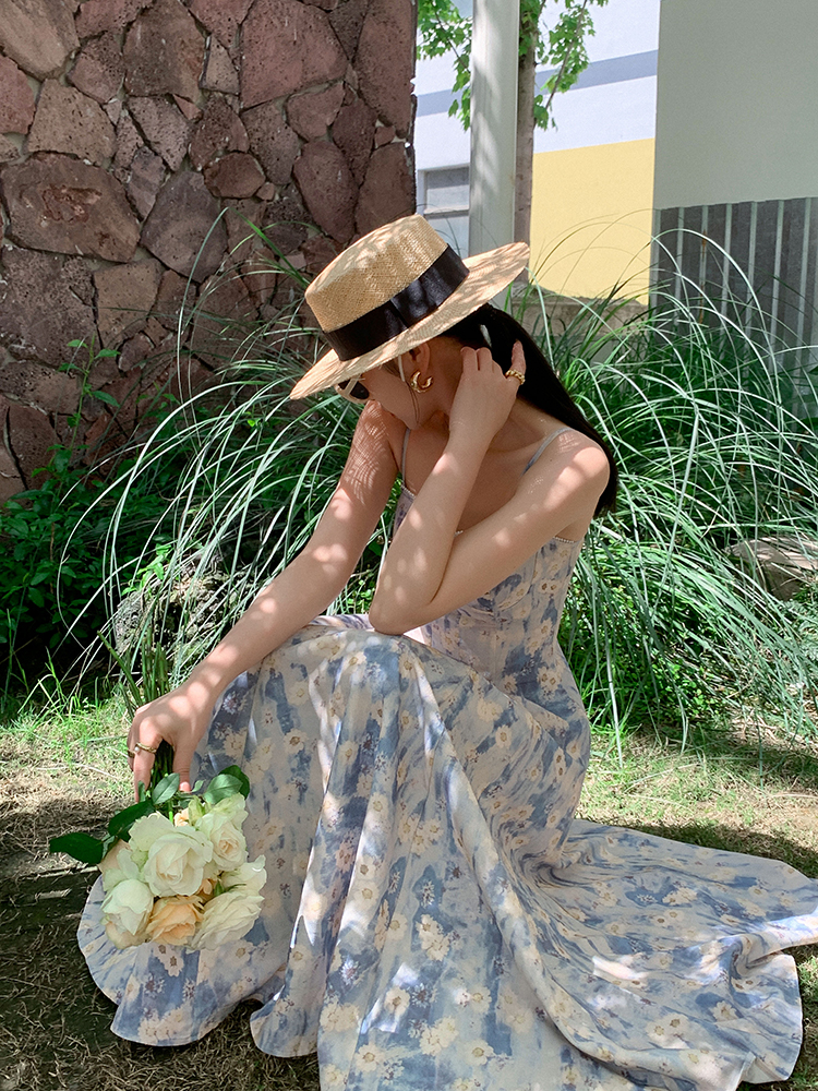 JWUNIQUE藍色無袖吊帶洋裝女夏季2023年新款海邊度假風長版裙子
